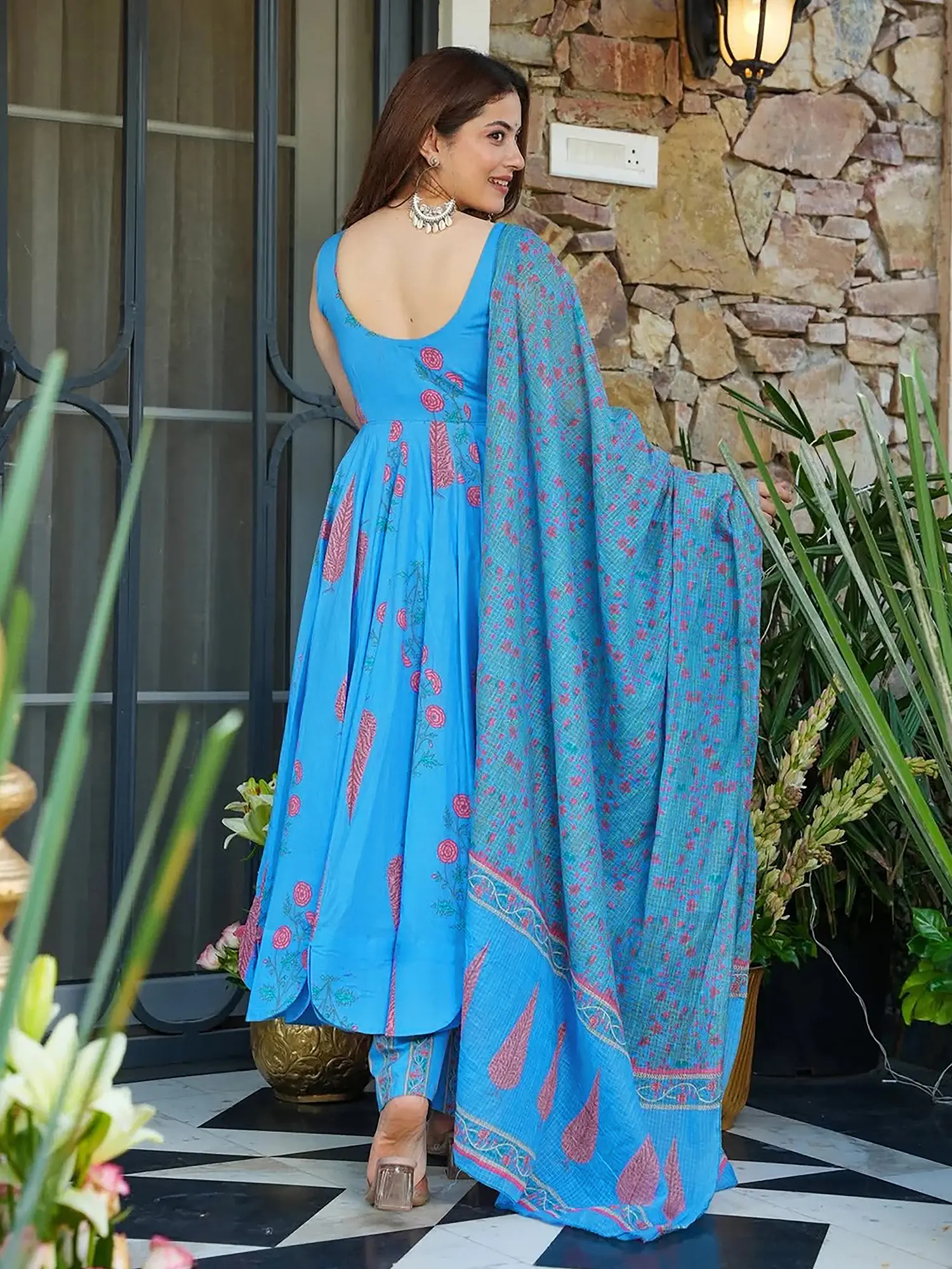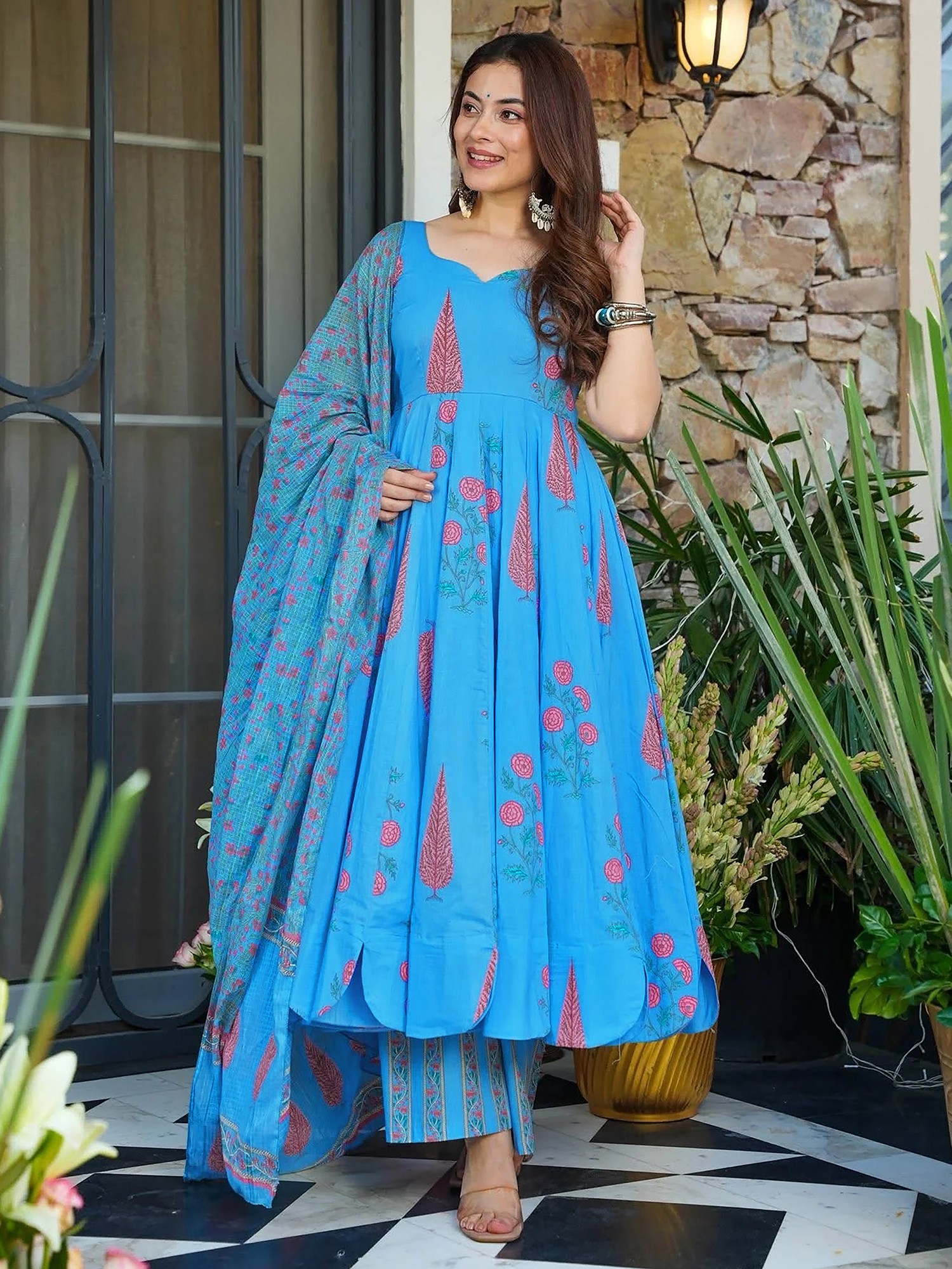 This ensemble draws inspiration from the rich heritage of Anarkali suits, a style historically associated with Mughal royalty and celebrated for its regal flair. By reinterpreting this classic design with contemporary digital printing techniques on luxurious Maslin, you embrace a tradition that is both storied and vibrantly alive in modern fashion.