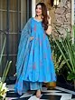 The captivating digital print adorns the Maslin material with a stunning botanical motif, showcasing a harmonious blend of radiant blue and delicate rose hues. The silhouette is designed to flatter, with a generous flare that accentuates movement and grace. It’s accompanied by a coordinating bottom and a beautifully printed dupatta, completing a look that is both cohesive and utterly enchanting. This creation is thoughtfully sized for a refined XS fit.