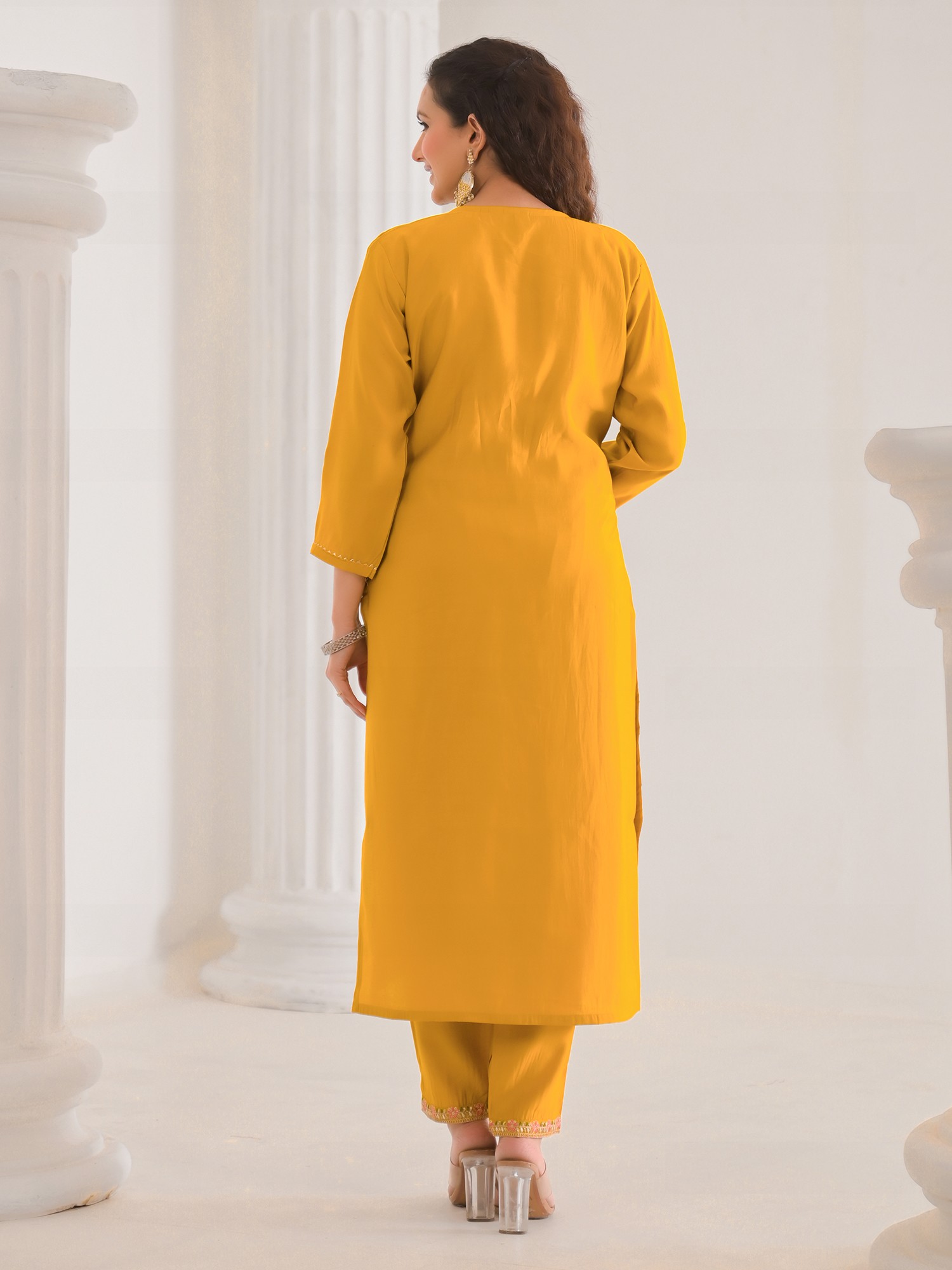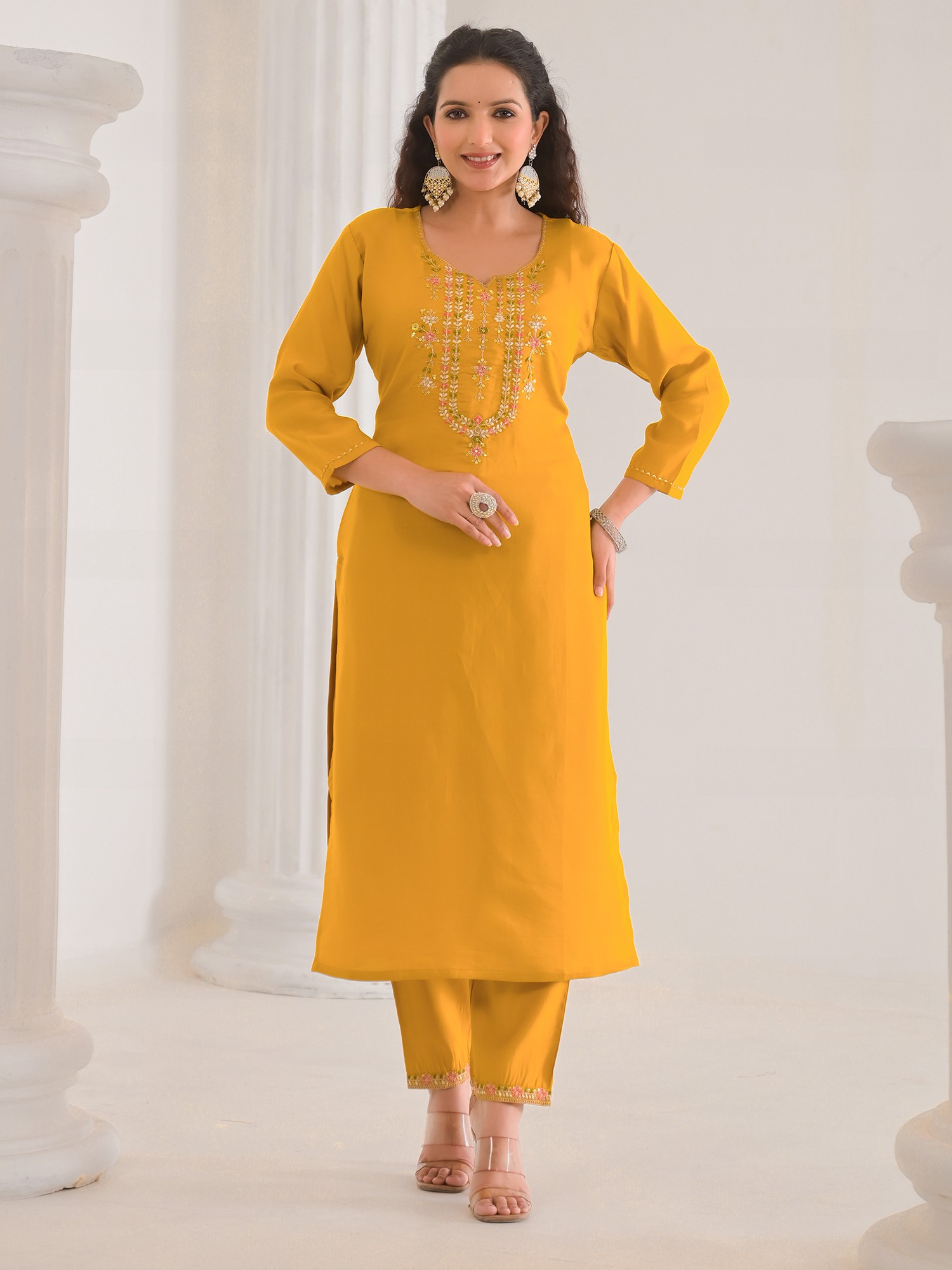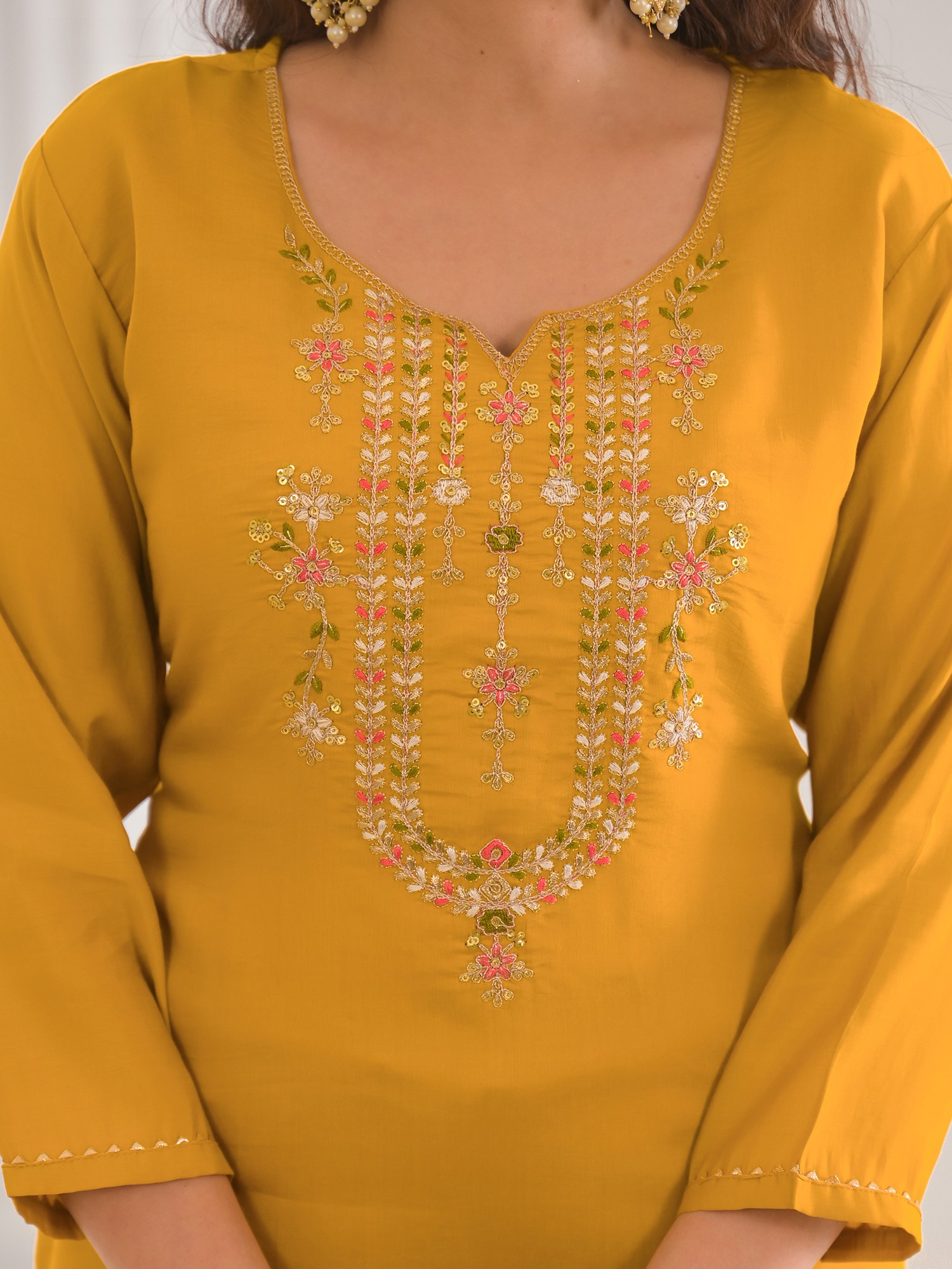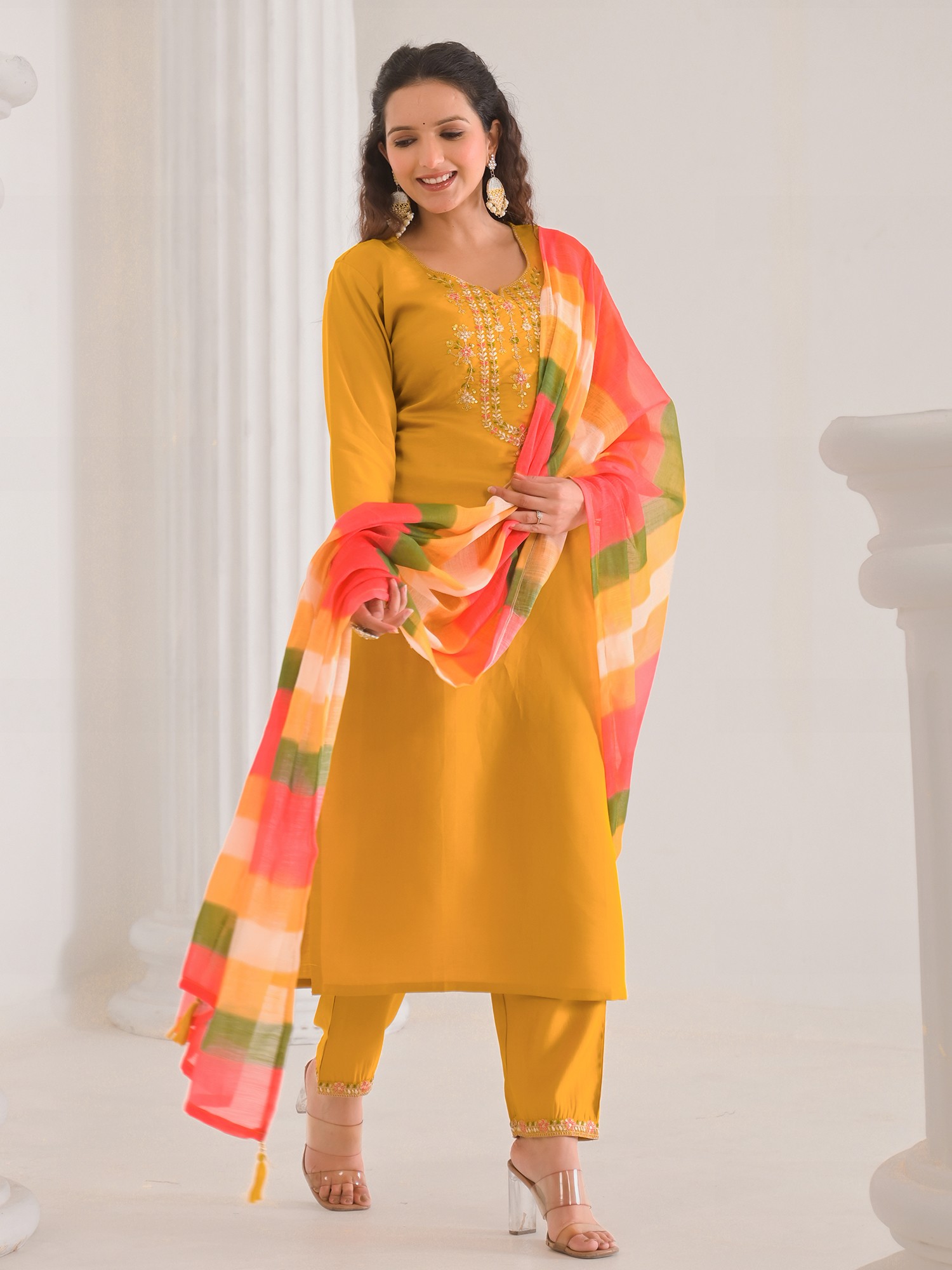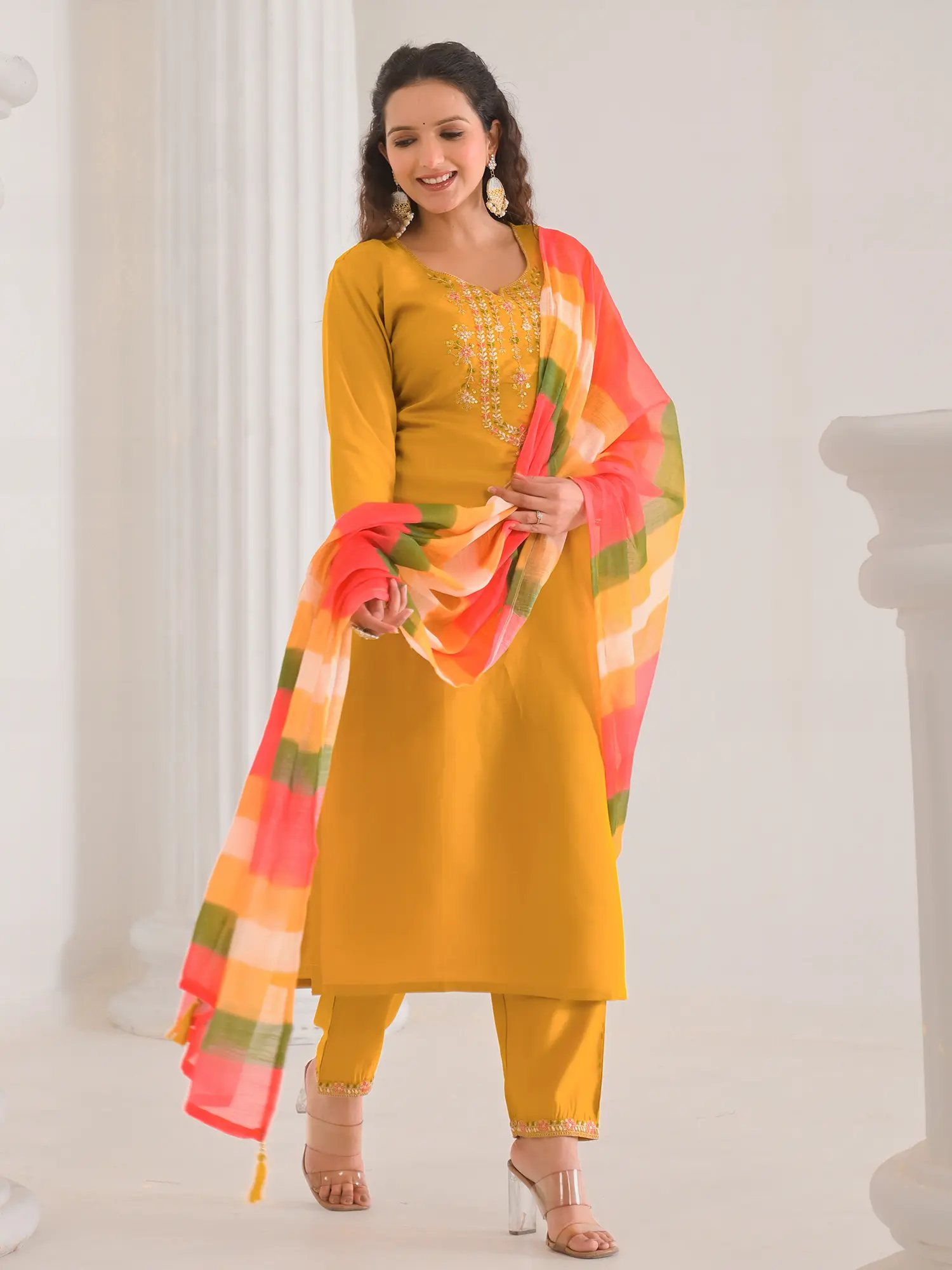 Embroidery And Sequins Work Viscose Chanderi Long Kurta With Multicolor Linen Dupatta
