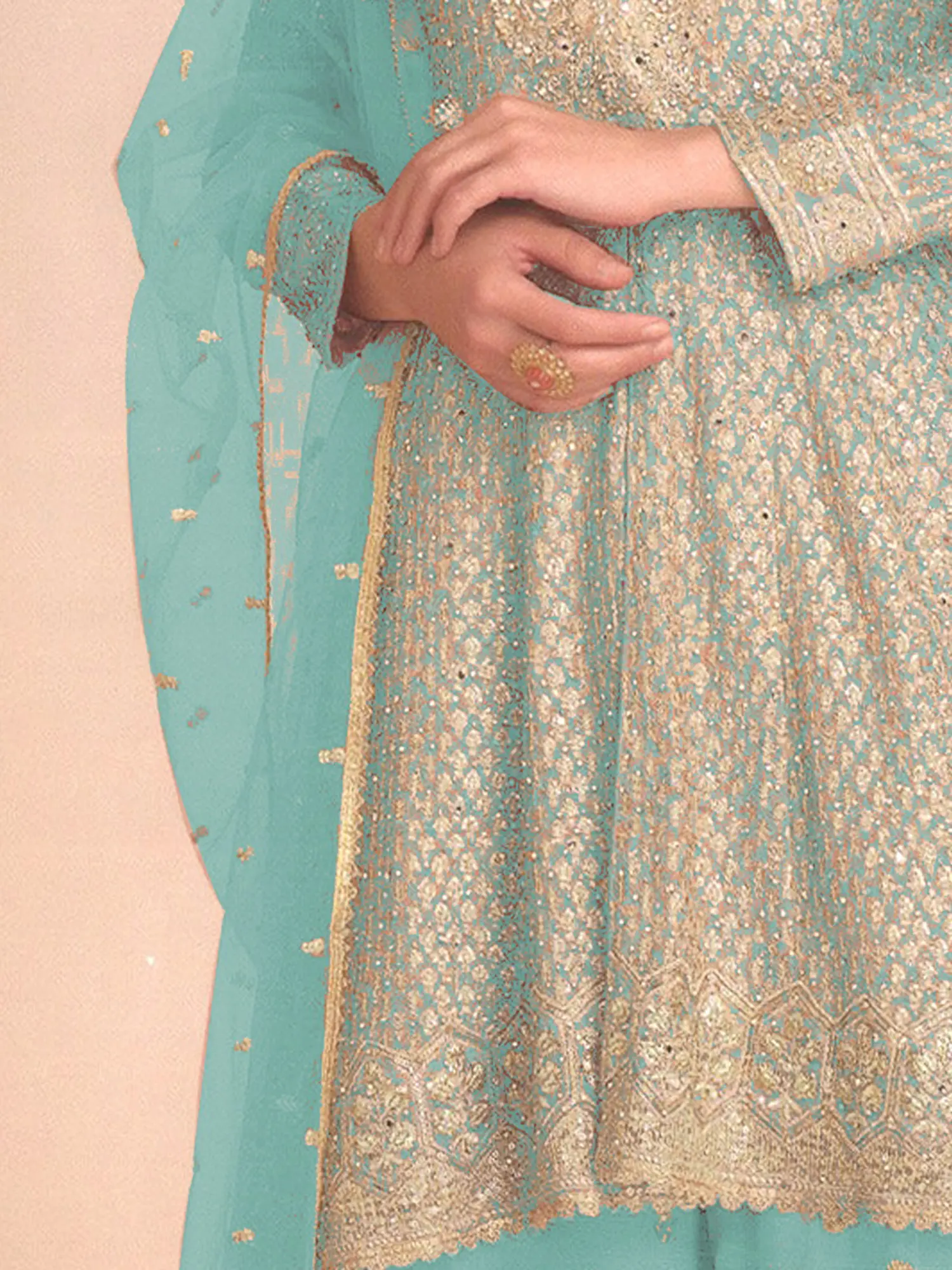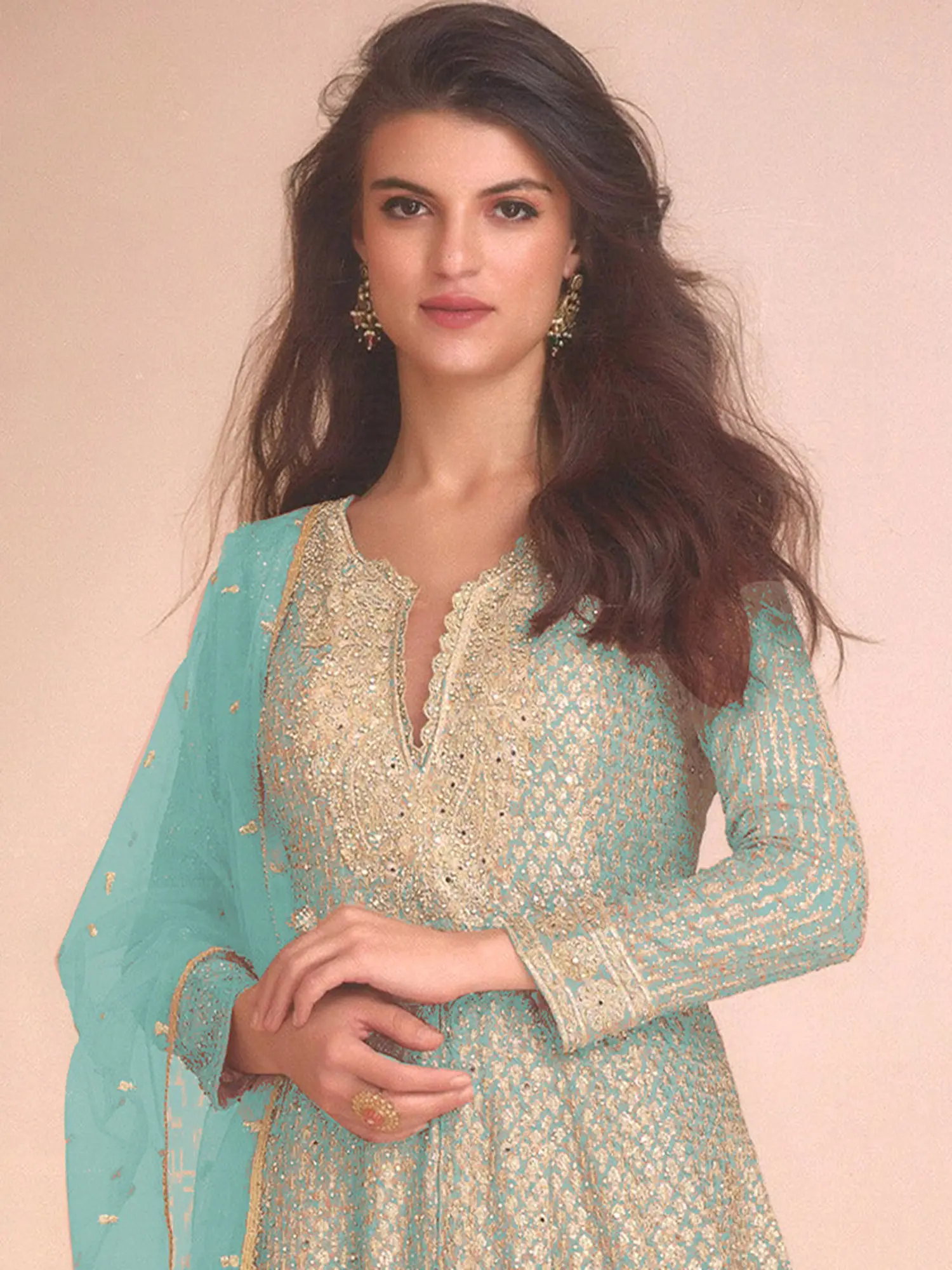 Elevate your festive wardrobe with this breathtaking salwar kameez ensemble, designed to make you the center of attention at any special occasion. Crafted from luxurious georgette fabric, this outfit drapes beautifully, offering both comfort and an elegant silhouette. The serene aqua hue is enhanced by intricate detailing, creating a garment that is as sophisticated as it is stunning.