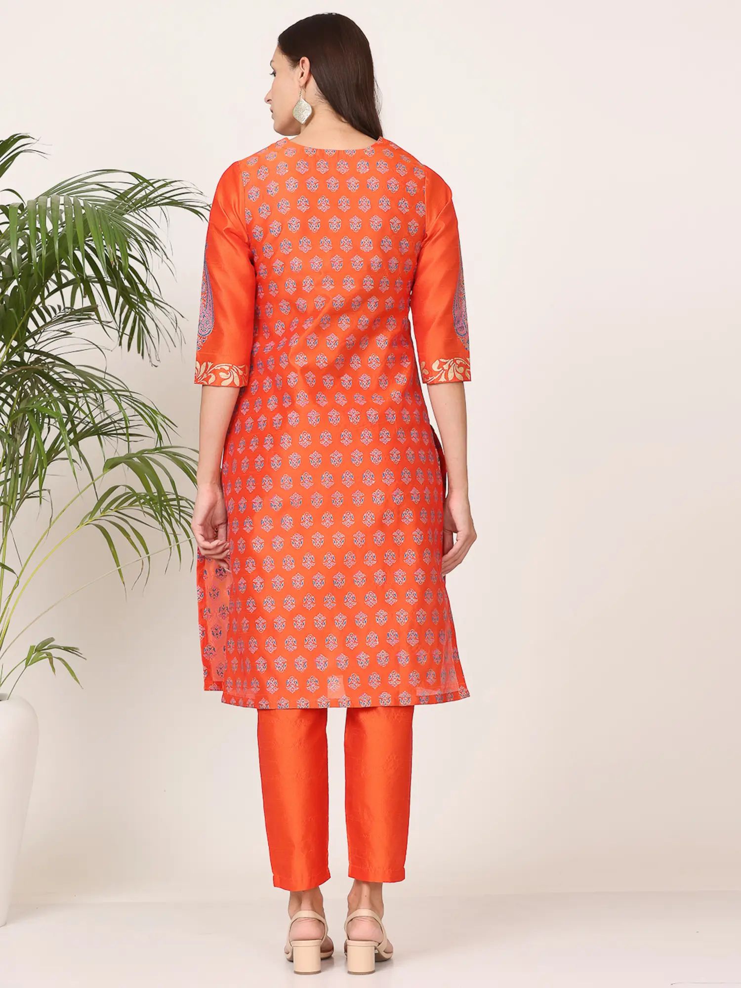 Features a vibrant orange silk straight-cut kurta adorned with intricate block prints.