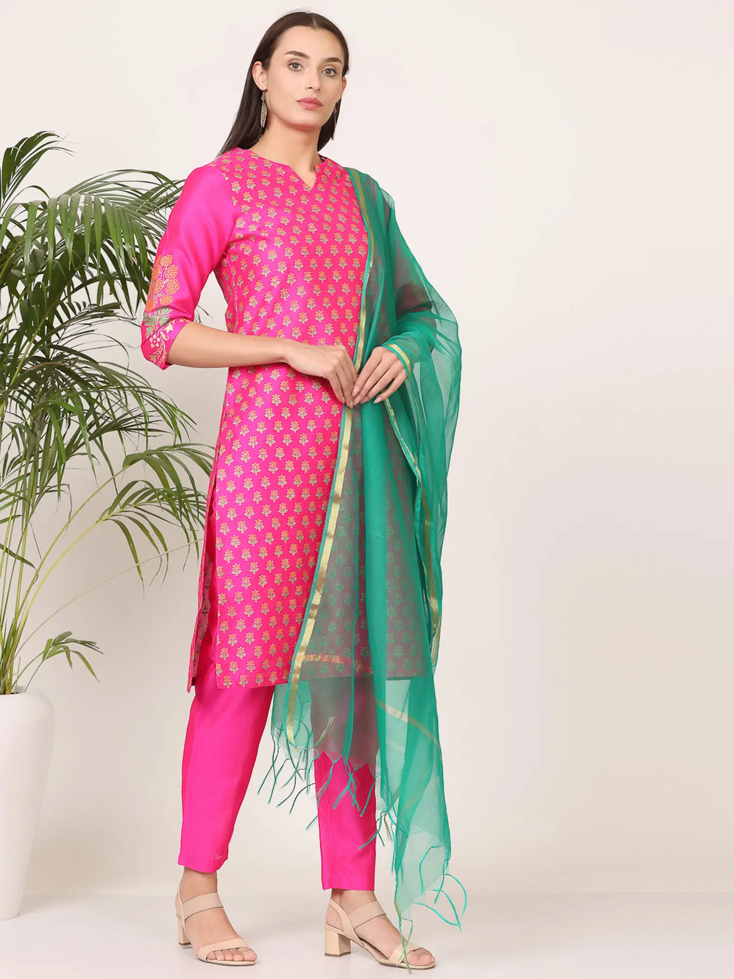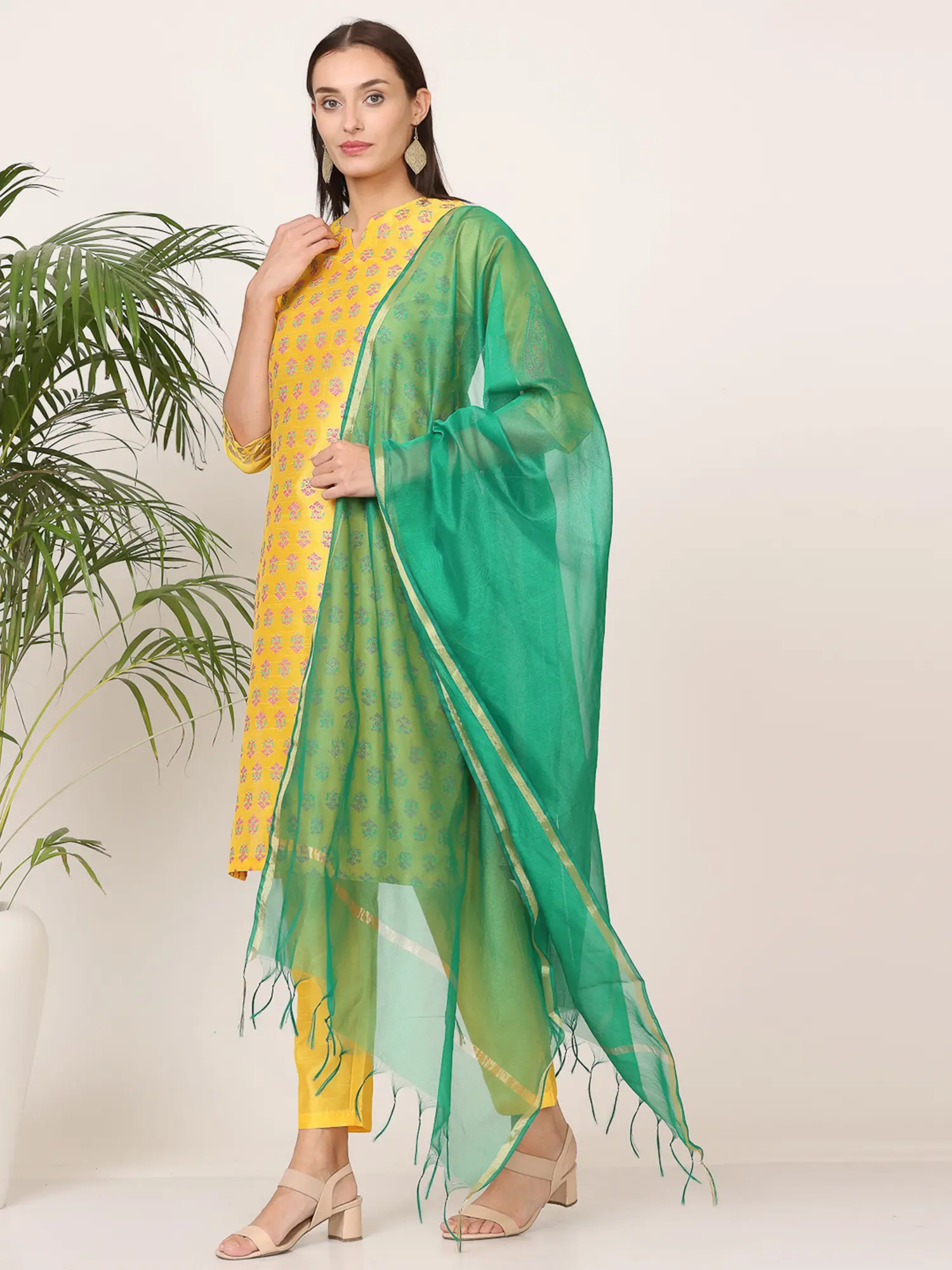 Completing this captivating ensemble is a contrasting Chanderi dupatta in a refreshing emerald green. The lightweight and sheer nature of the Chanderi fabric drapes beautifully, adding a layer of sophistication to the outfit. The dupatta is embellished with a subtle block print that mirrors the design on the kurta, creating a thoughtful connection between the pieces. Delicate gold border detailing along the edges and playful tassels at the corners add a final flourish of elegance, making this dupatta a true statement accessory. This carefully curated combination of colors, prints, and fabrics results in a timeless look that is both chic and deeply rooted in tradition. Embrace the artistry and grace of this silk kurta set and let your style shine.
