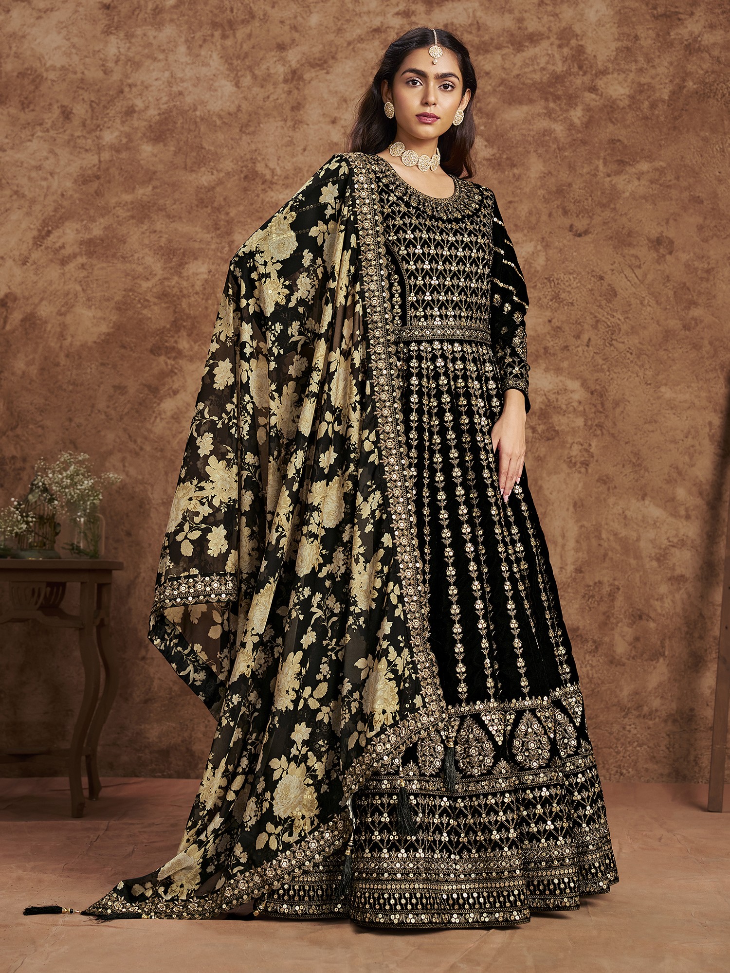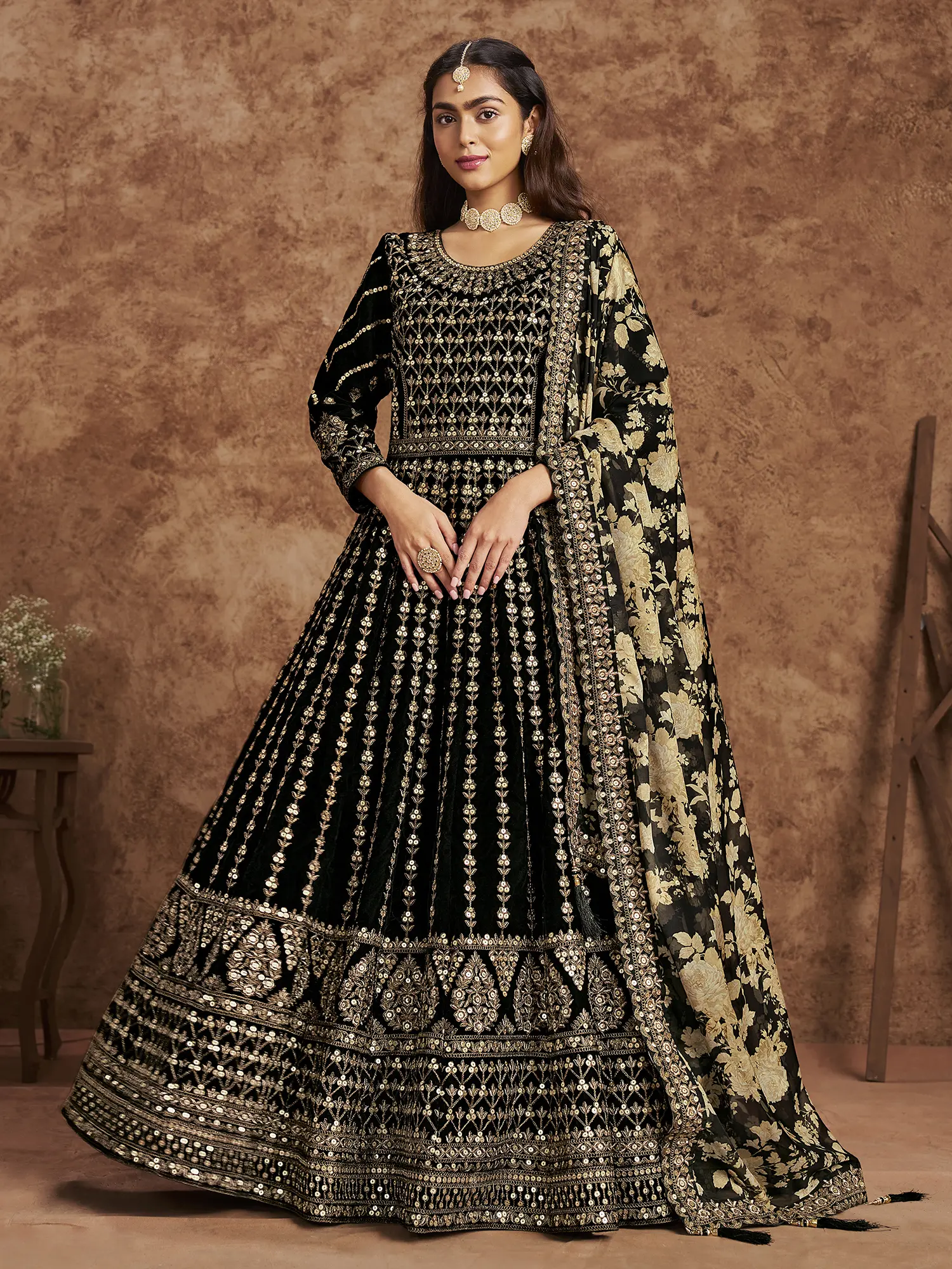 This gown set is more than just an outfit; it's a statement of refined taste and celebratory spirit. The combination of sumptuous velvet, detailed embroidery, and a beautifully printed dupatta creates a look that is both timeless and contemporary. Whether you are attending a grand wedding, a festive occasion, or a formal party, this ensemble is guaranteed to turn heads and garner admiration. Designed for those who appreciate quality and desire to make a lasting impression, this gown set embodies the essence of traditional Indian attire with a modern, luxurious twist.