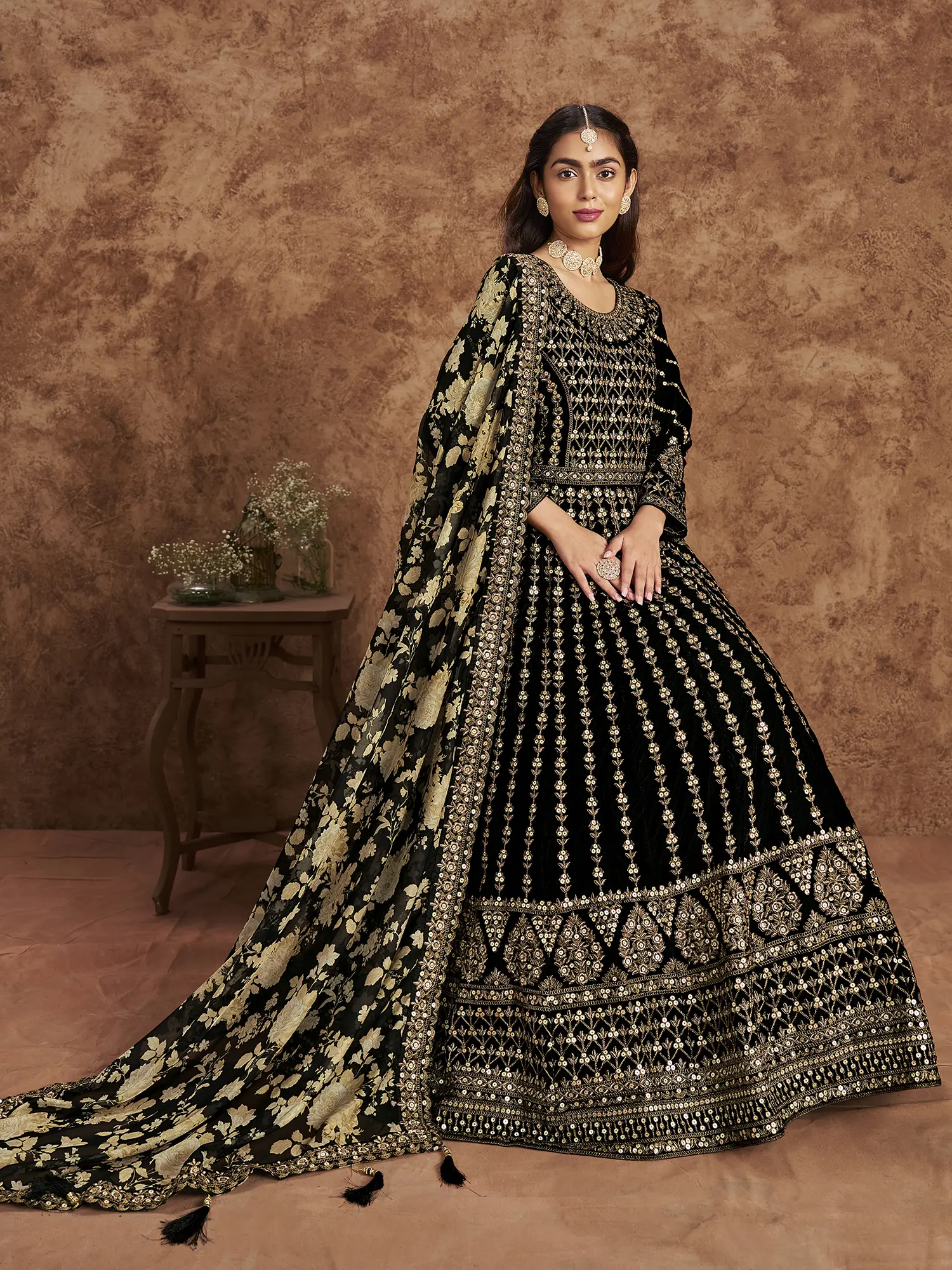 Stylish Velvet Embroidered Gown Outfit With Bottom And Soft Organza Print Dupatta Perfect For Party And Wedding Functions