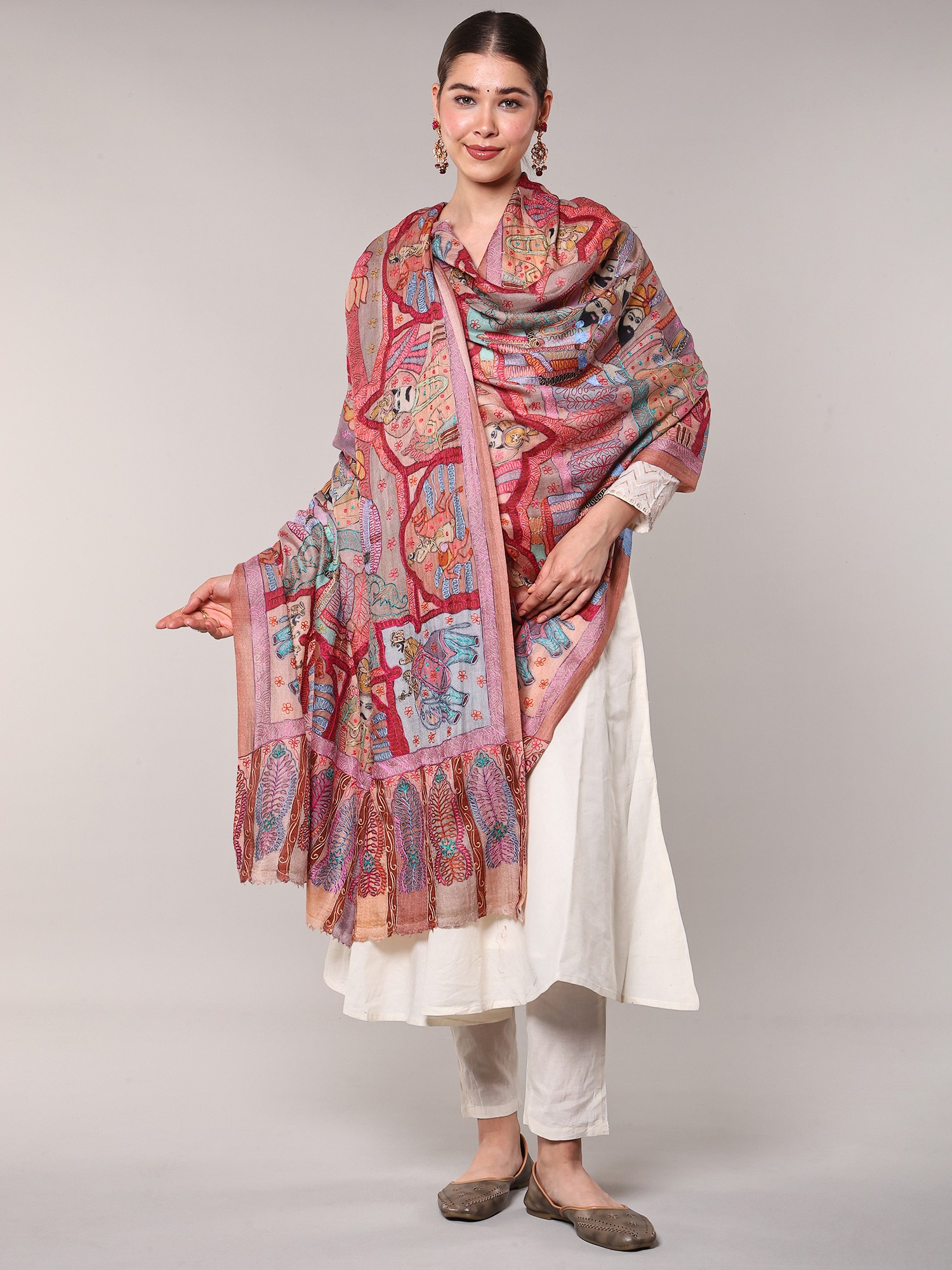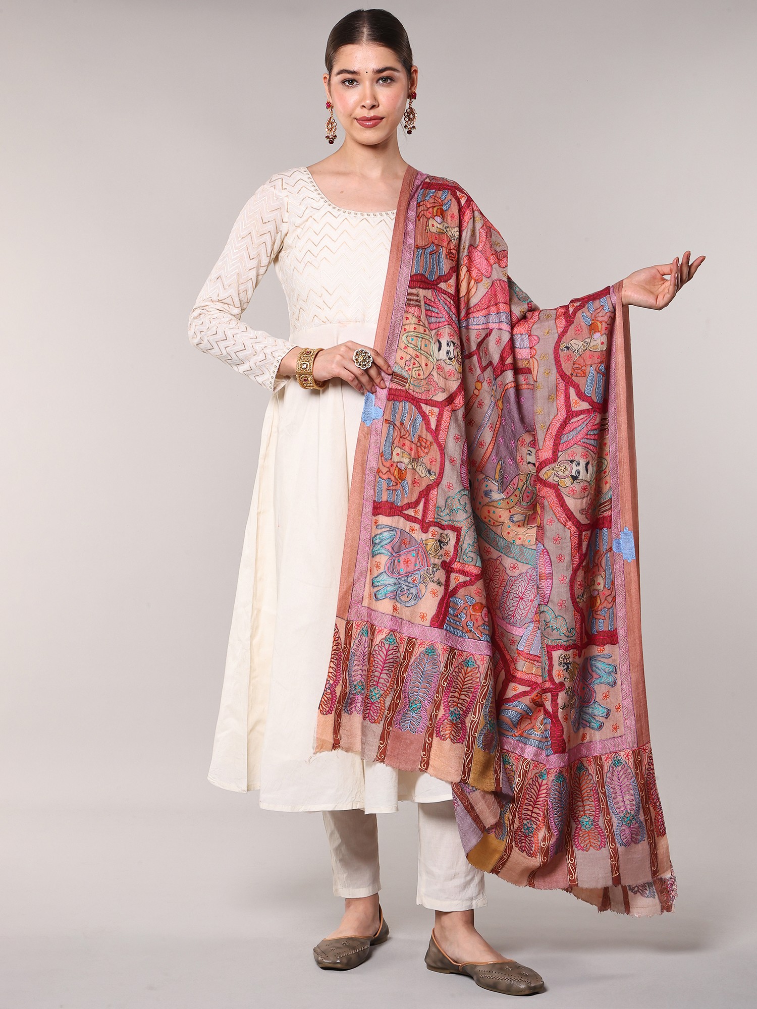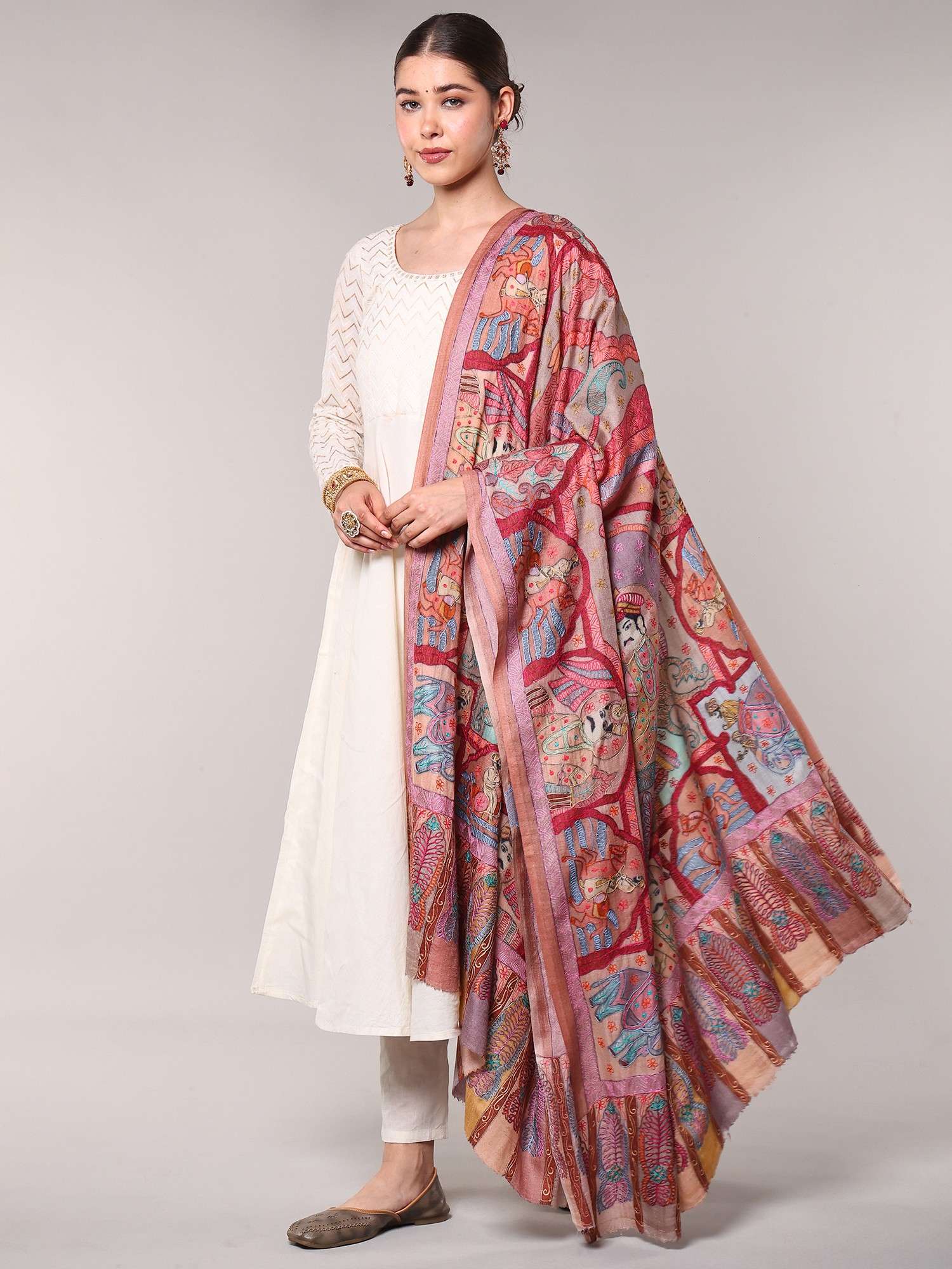 Kalamkari Embroidered Shawl with Mughal Darbar Motifs from Amritsar
