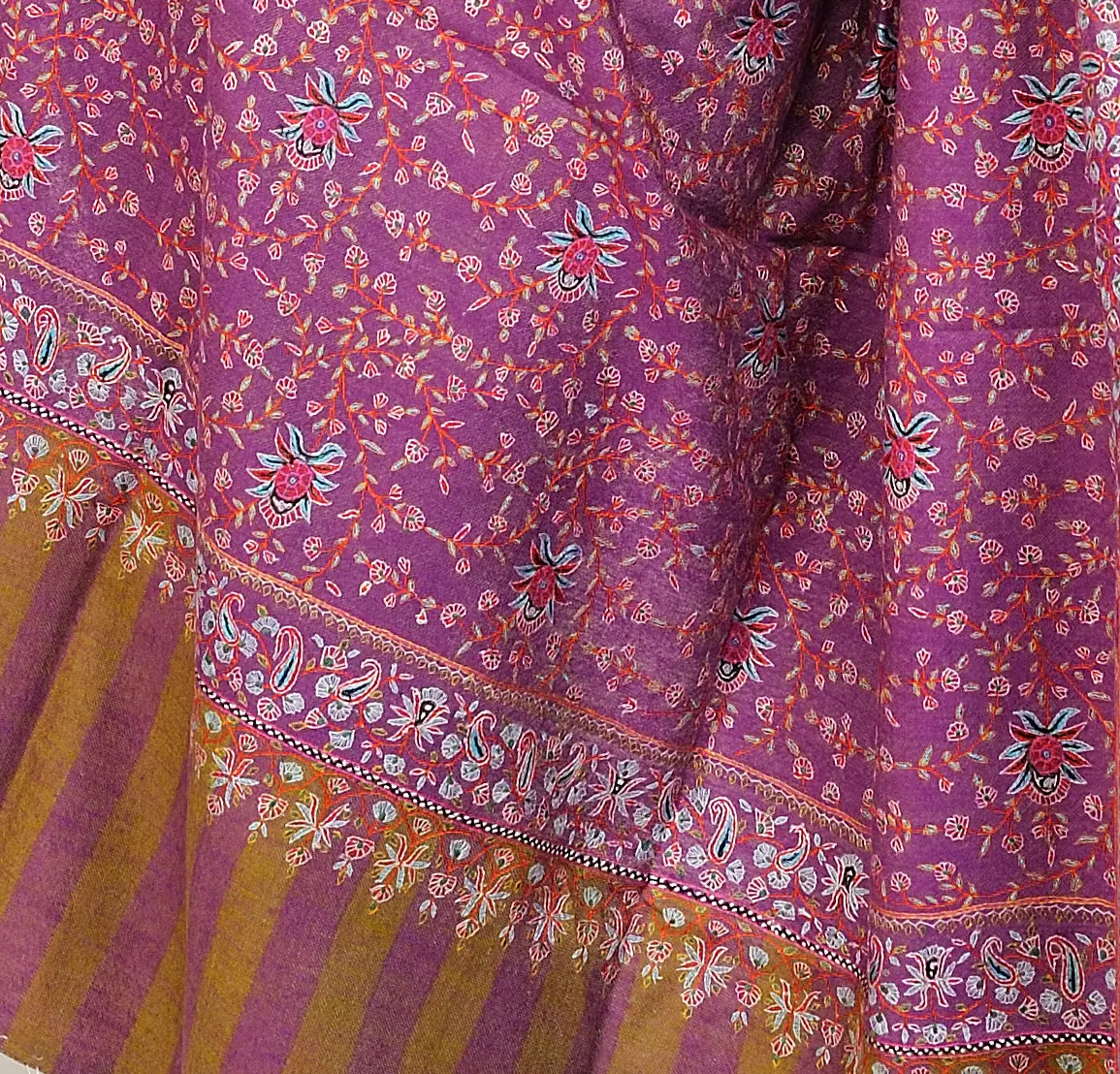 Sozni Embroidery carries high pride in Kashmir. It is the most delicate and extremely beautiful work of art performed by Kashmiri artisans. It is worth mentioning that Sozi Embroidery is detailed; a particular pattern can take 5 stitches per cm to 500 stitches per cm. The artist that stitches these patterns on these shawls can embroider on both sides of the cloth identically. But the artist’s needlework can also be a single-color thread or in different colors on the other side. These needleworks are done on the most lavish shawls to the simplest one yet it’s always the finest of all.