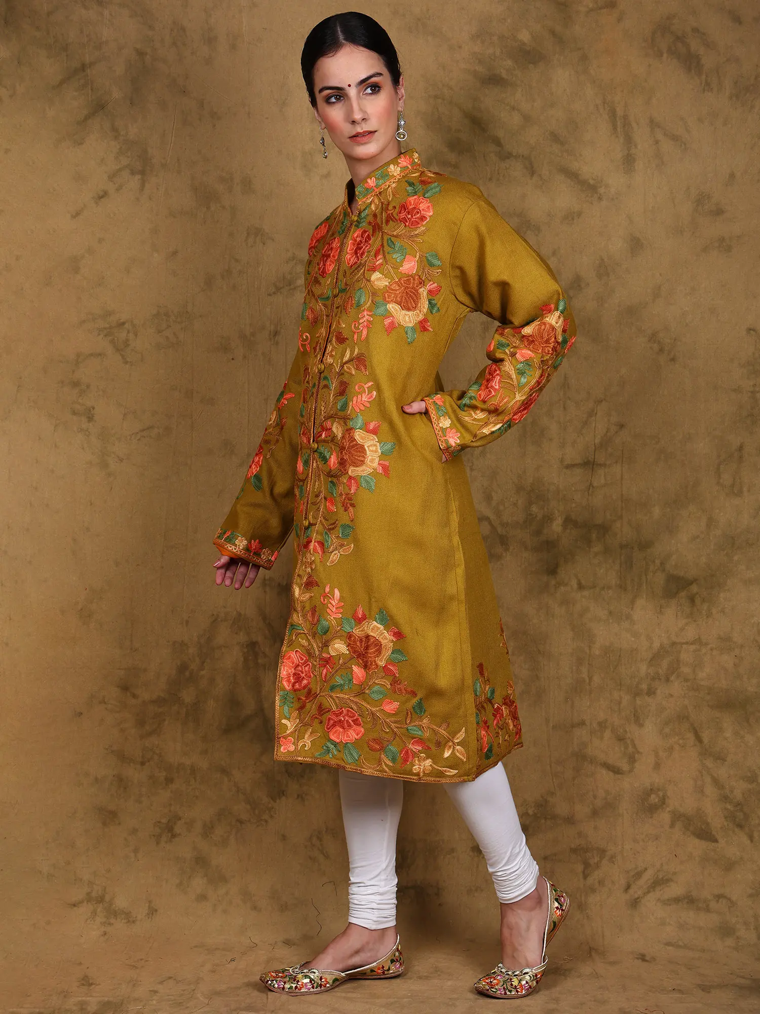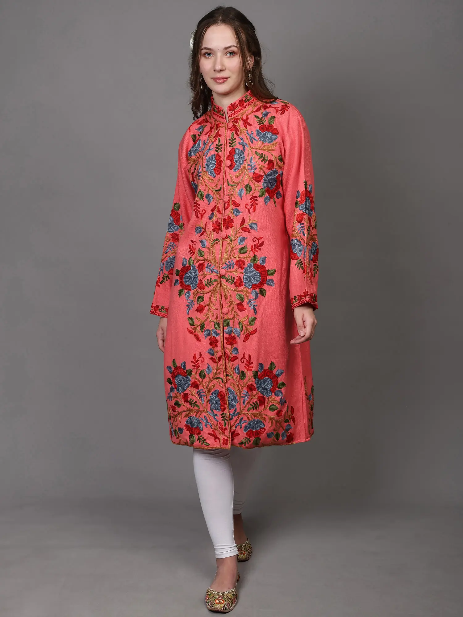 Indulge in the exquisite craftsmanship of Kashmir with this stunning long wool jacket. This piece is more than just outerwear; it's a testament to artistry and timeless style. The soft, luxurious wool provides unparalleled warmth and comfort, making it perfect for cooler evenings or crisp winter days. The delicate coral pink hue is both sophisticated and versatile, complementing a range of outfits and personal styles. The intricate multicolor Aari embroidery, featuring vibrant floral motifs, adds a touch of breathtaking detail that elevates the jacket to a true masterpiece. The Aari technique, a traditional Kashmiri embroidery style, is known for its fine detail and delicate precision, creating a visually captivating piece that speaks to the rich heritage of Kashmir.