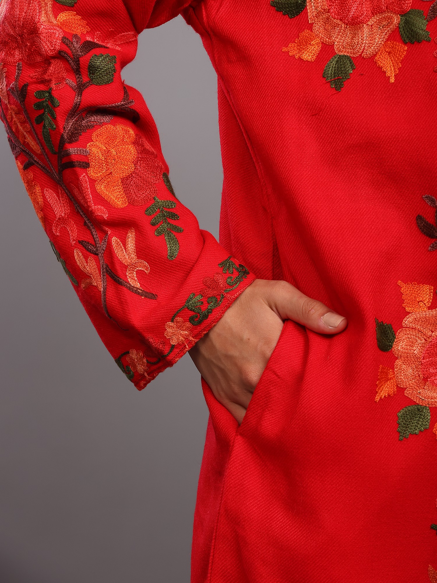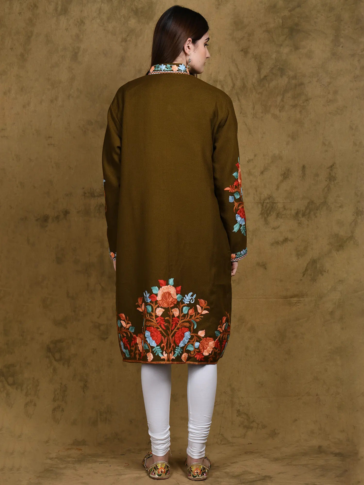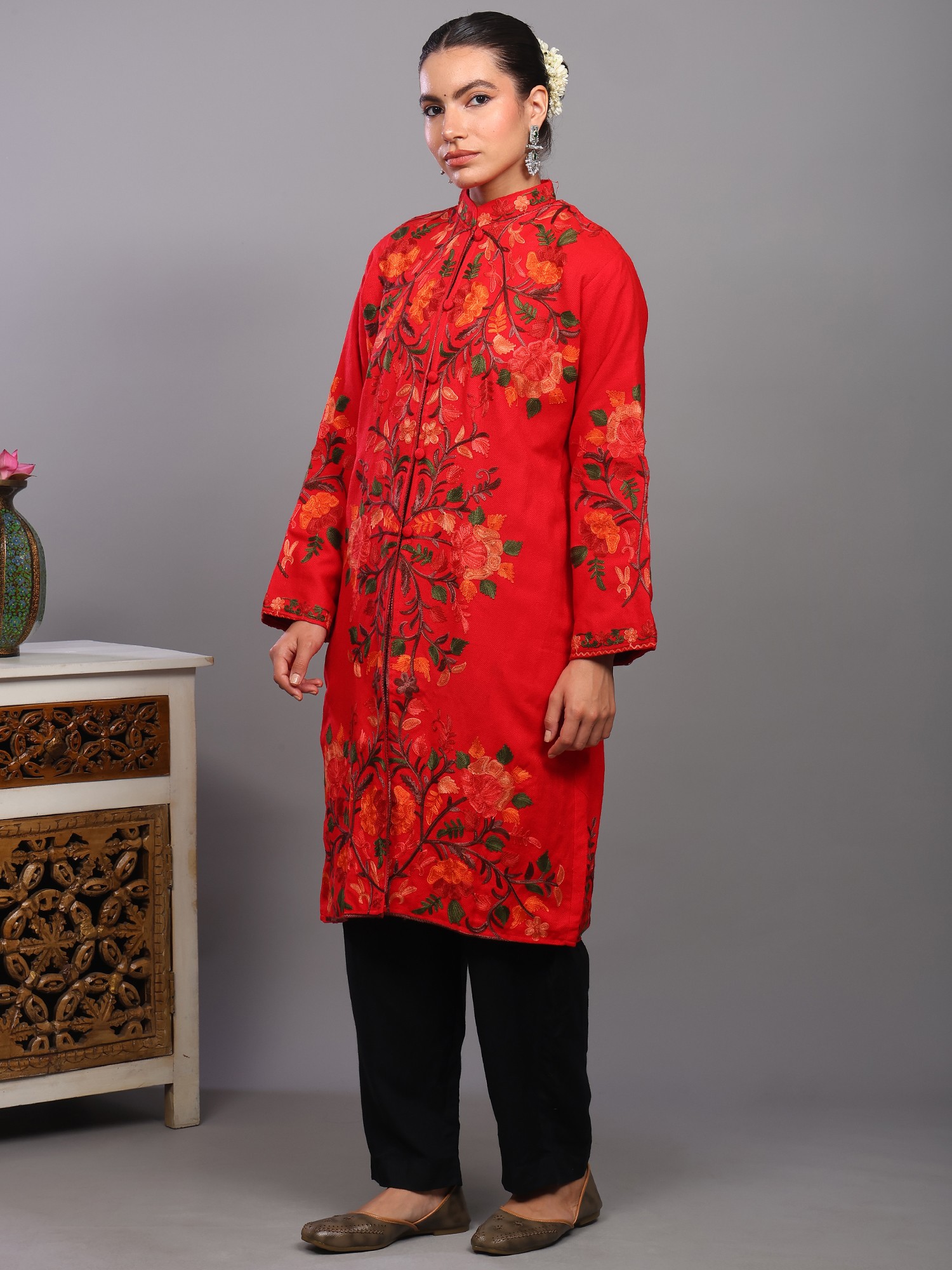 This long jacket is crafted with fine Kashmiri wool as a complete solution to all your winter fashion needs.