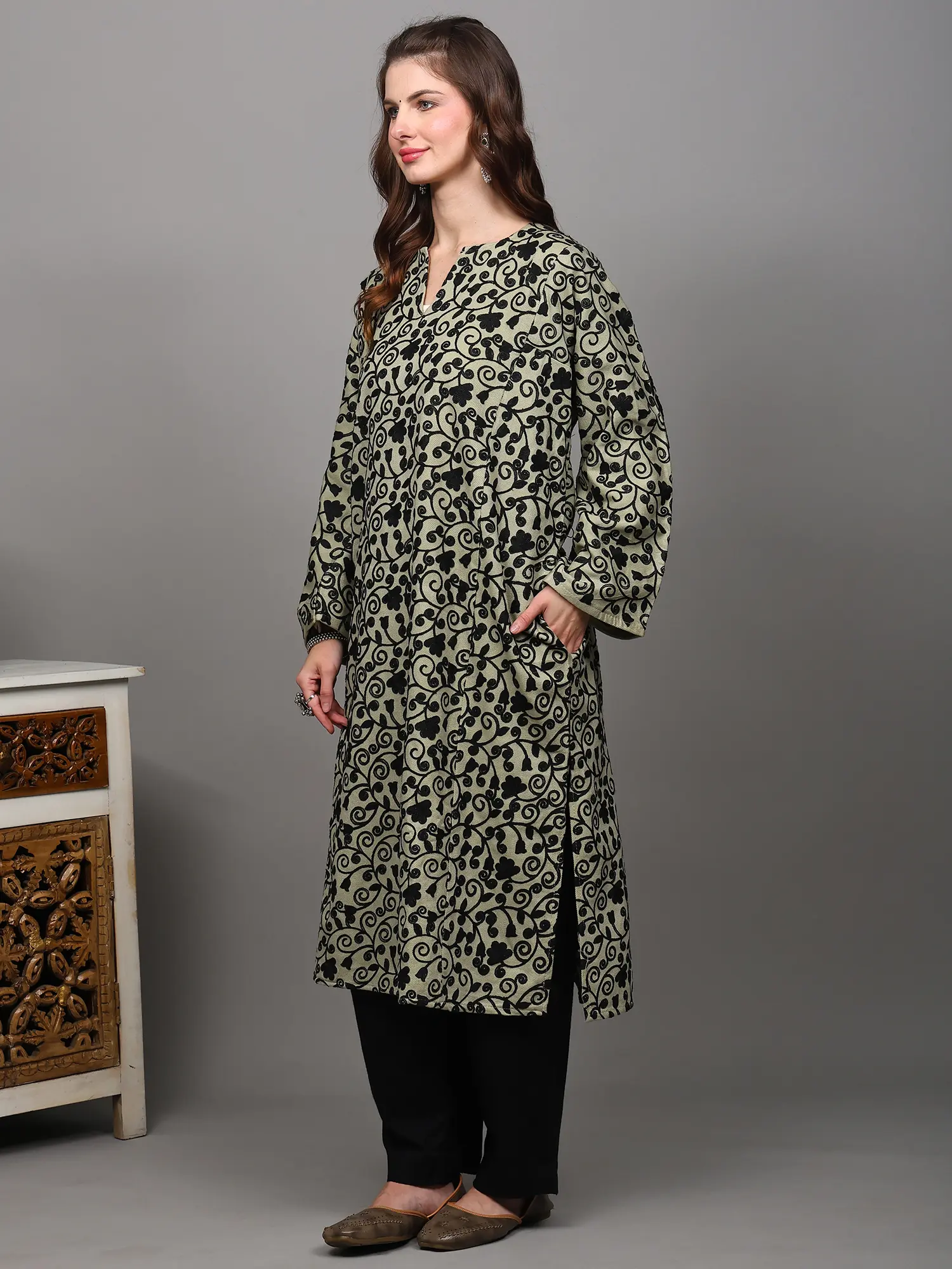 Women's Wool Phiran with Hand-Embroidered Floral Motifs