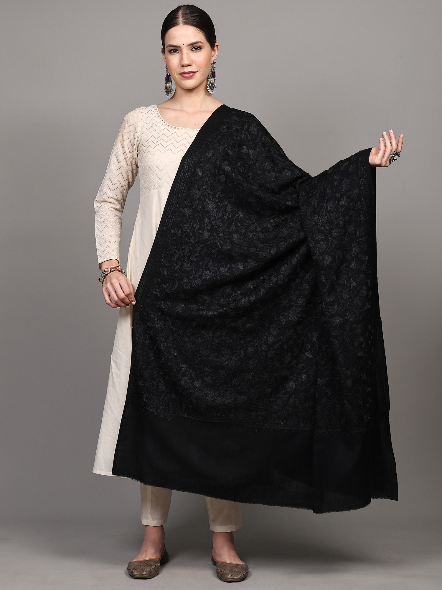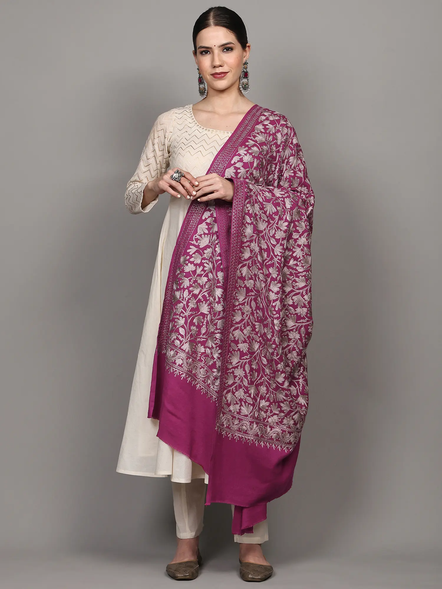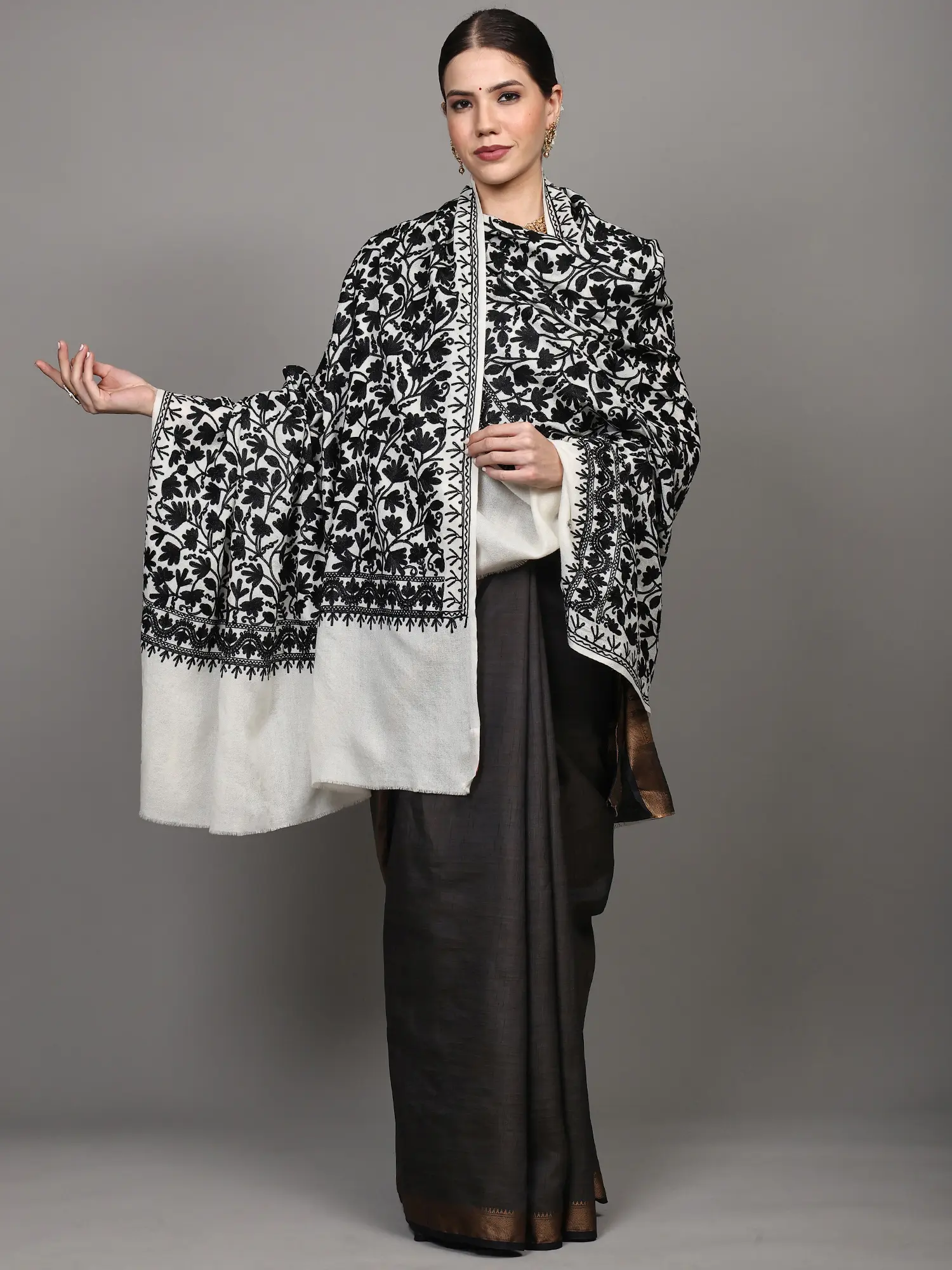 Wool Stole with Chain Stitch Aari Embroidered Floral Vines