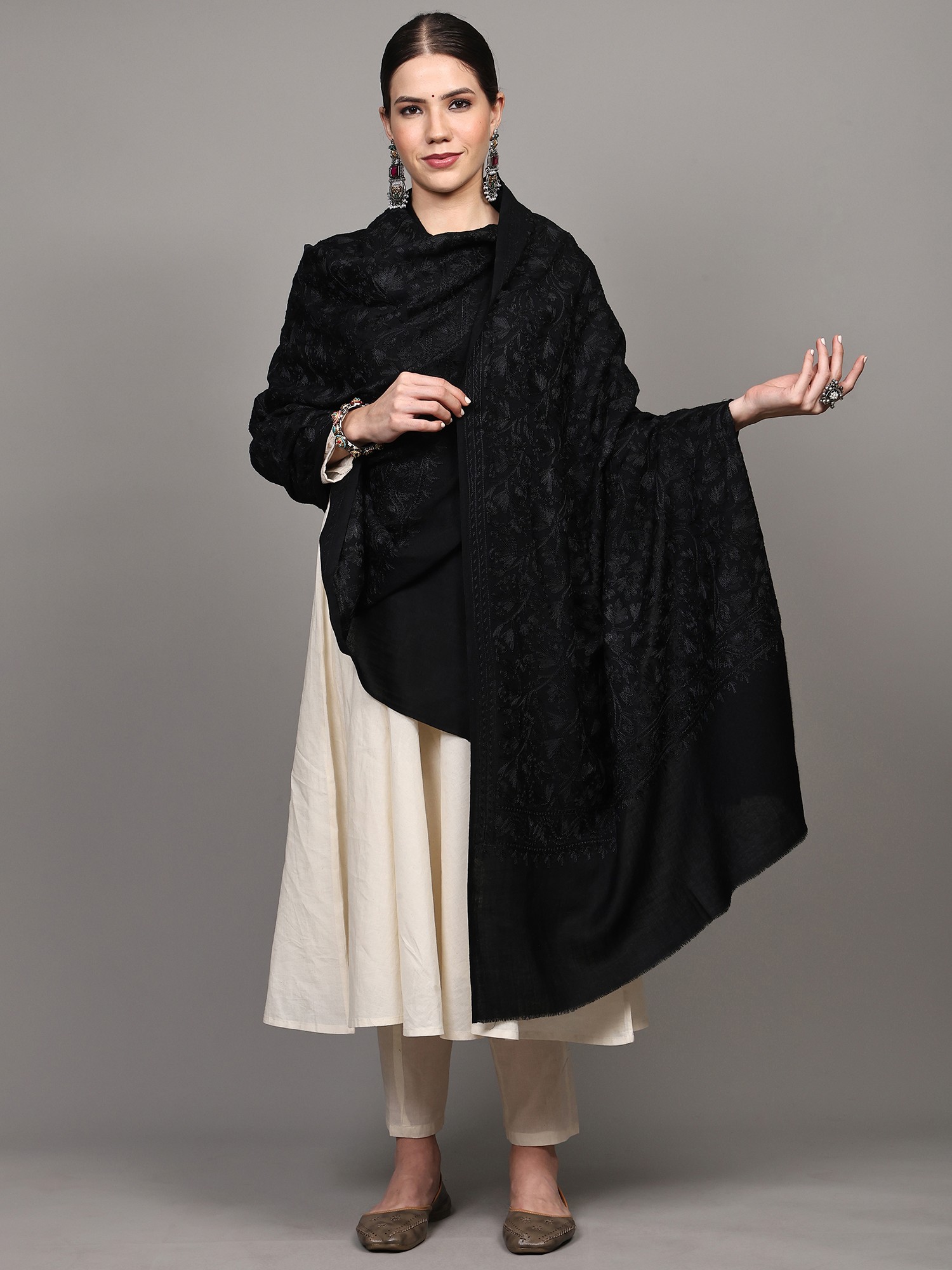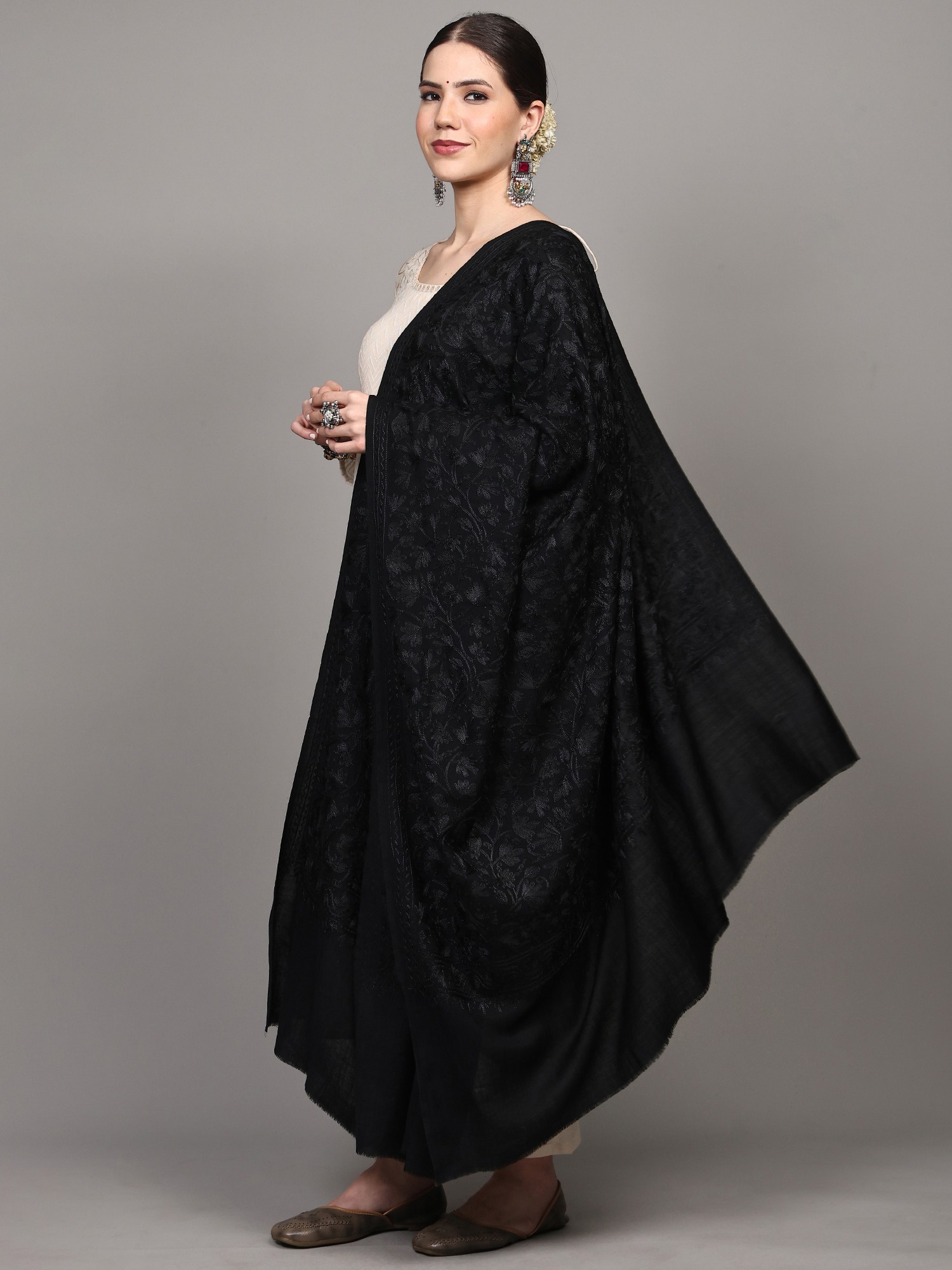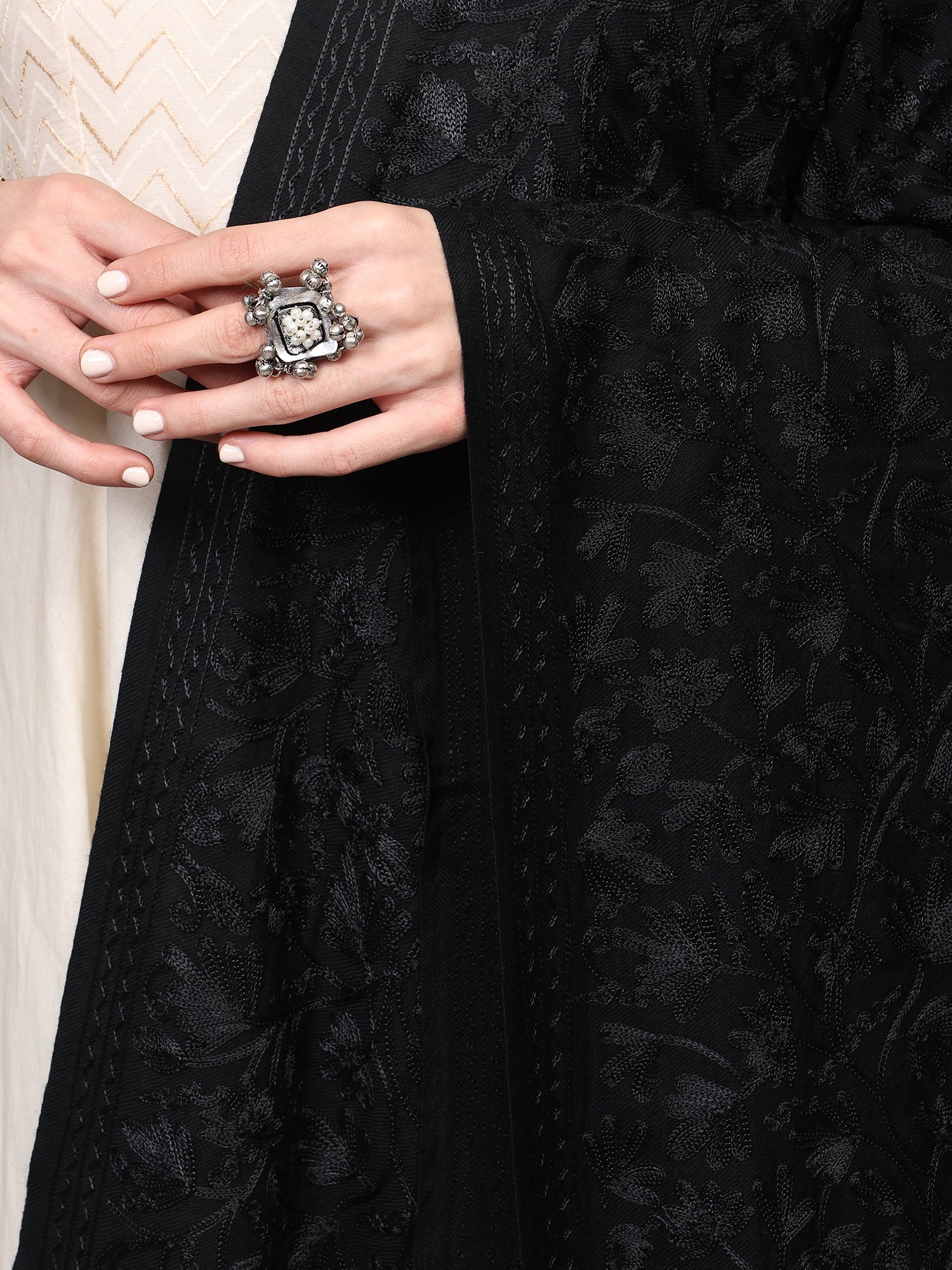 Wool Stole with Chain Stitch Aari Embroidered Floral Vines