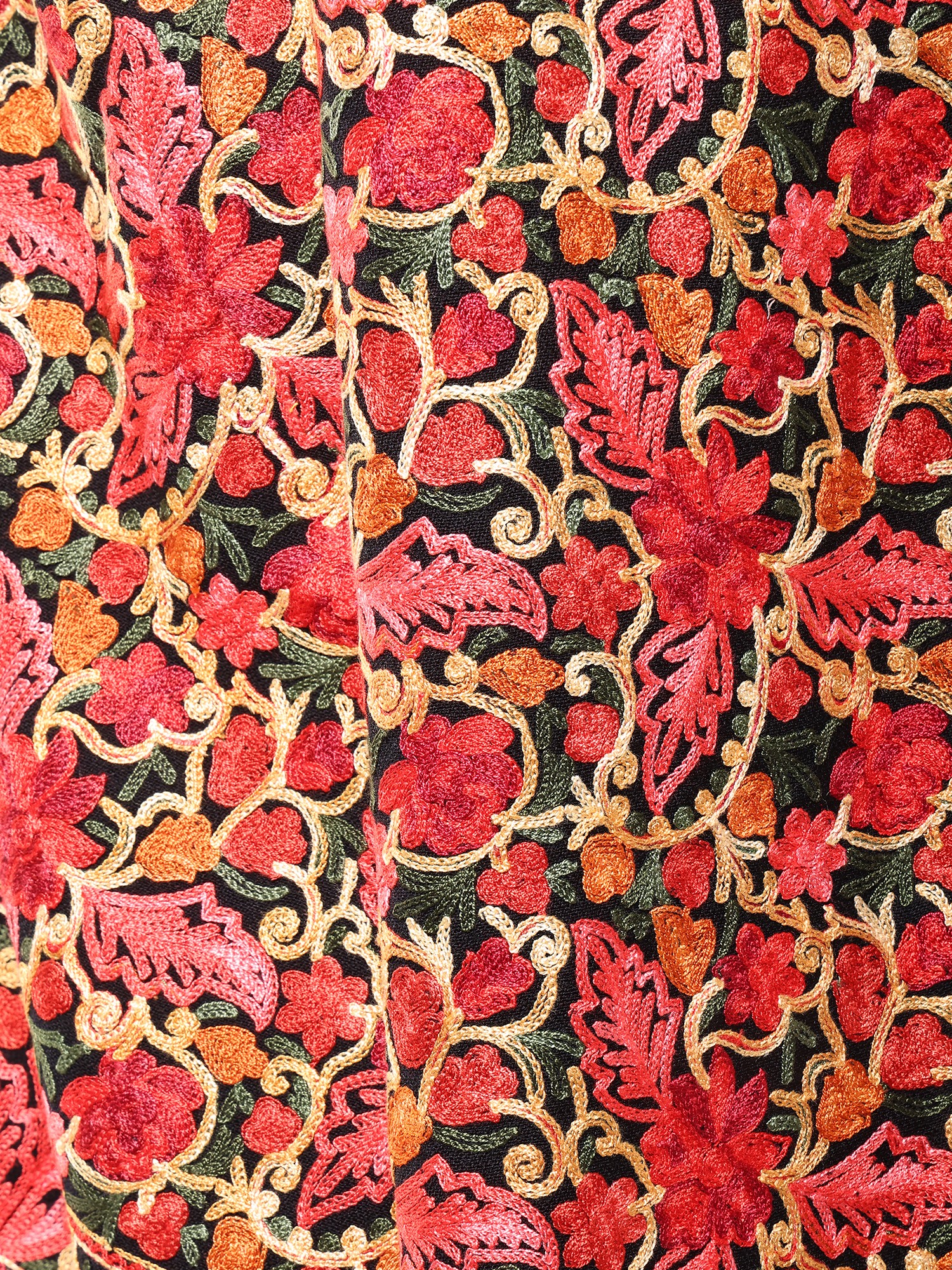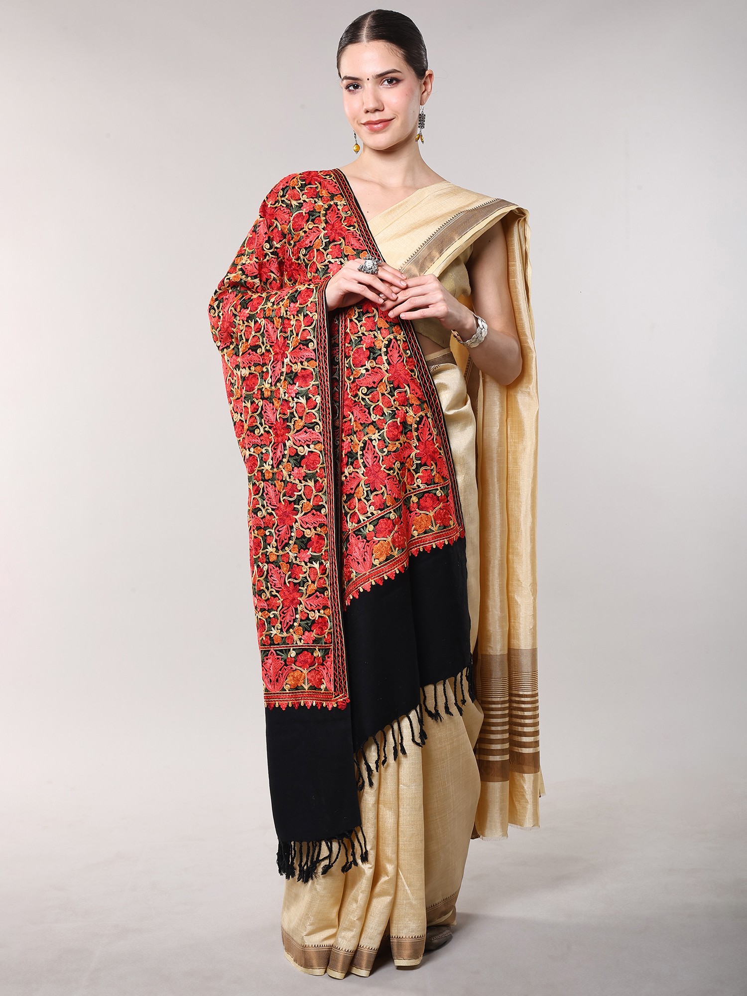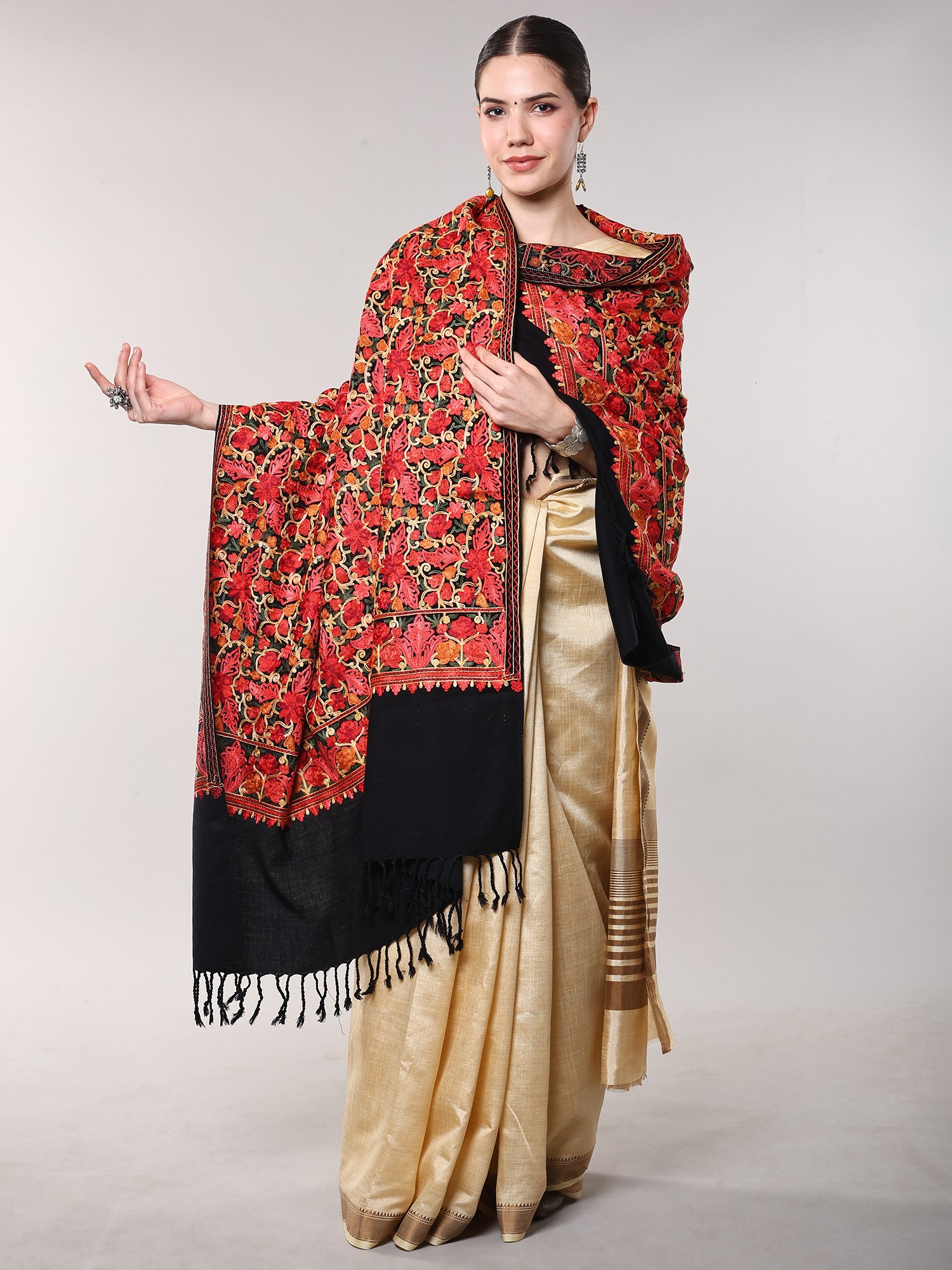 The true magic of this shawl lies in its intricate all-over floral Aari embroidery. The vibrant coral and burnt orange blooms are meticulously stitched onto a creamy off-white base, creating a mesmerizing pattern that's both traditional and strikingly modern. The Aari embroidery technique, a time-honored Kashmiri art form, utilizes a hooked needle to create incredibly detailed and lifelike floral designs. Each stitch is a testament to the skill and dedication of the artisan who created this stunning piece. The delicate detailing and rich color palette make it a true showstopper.