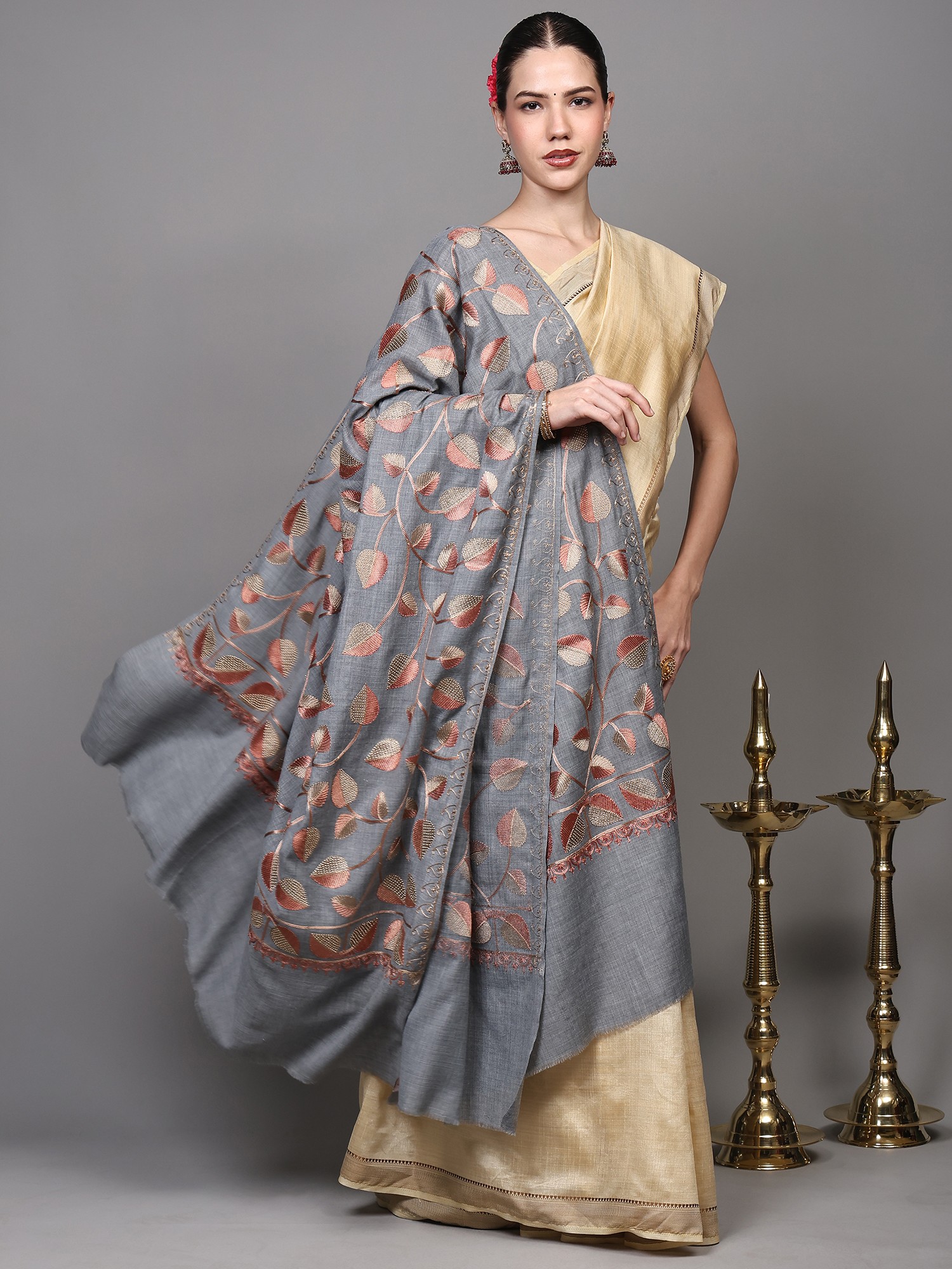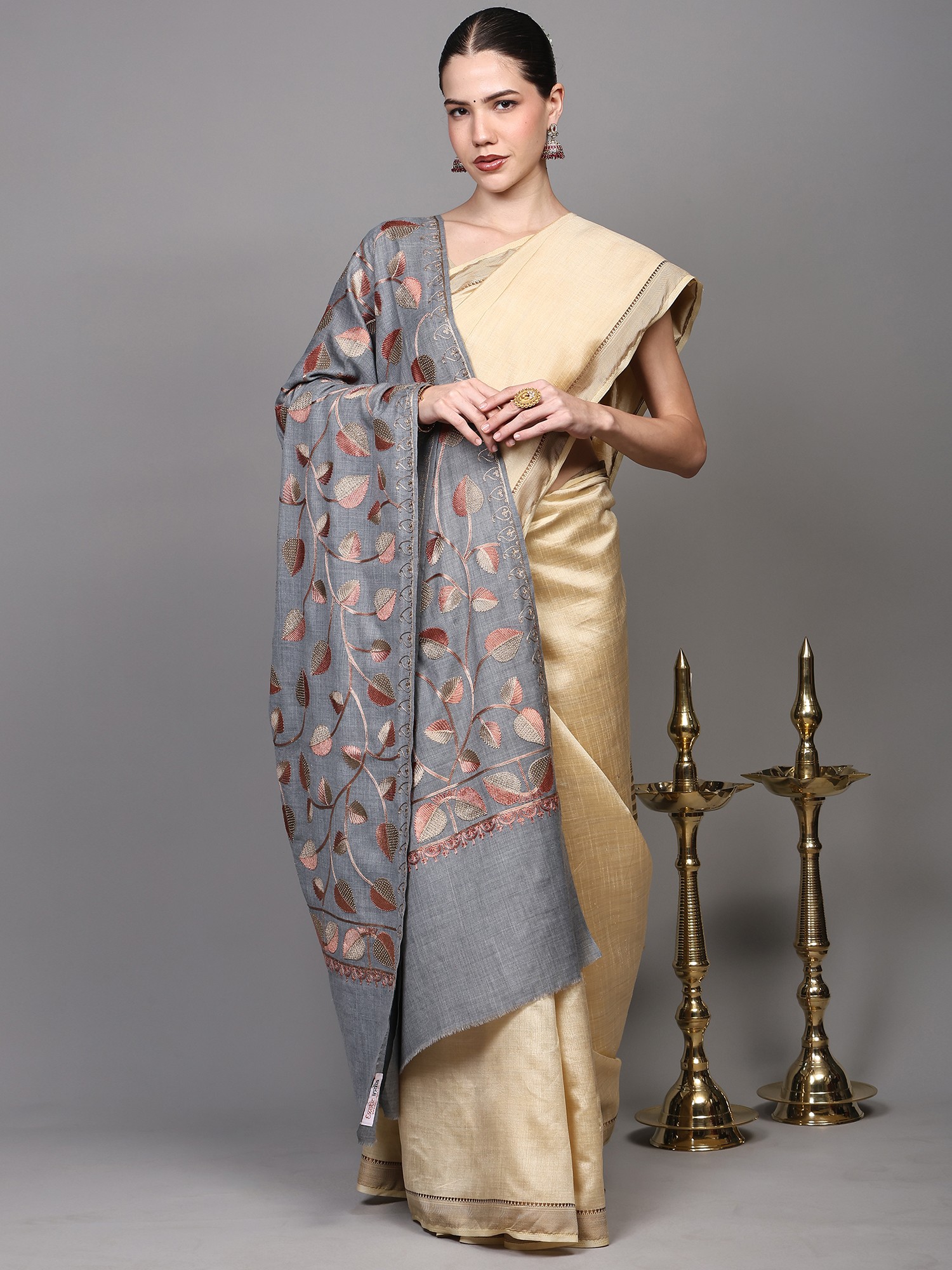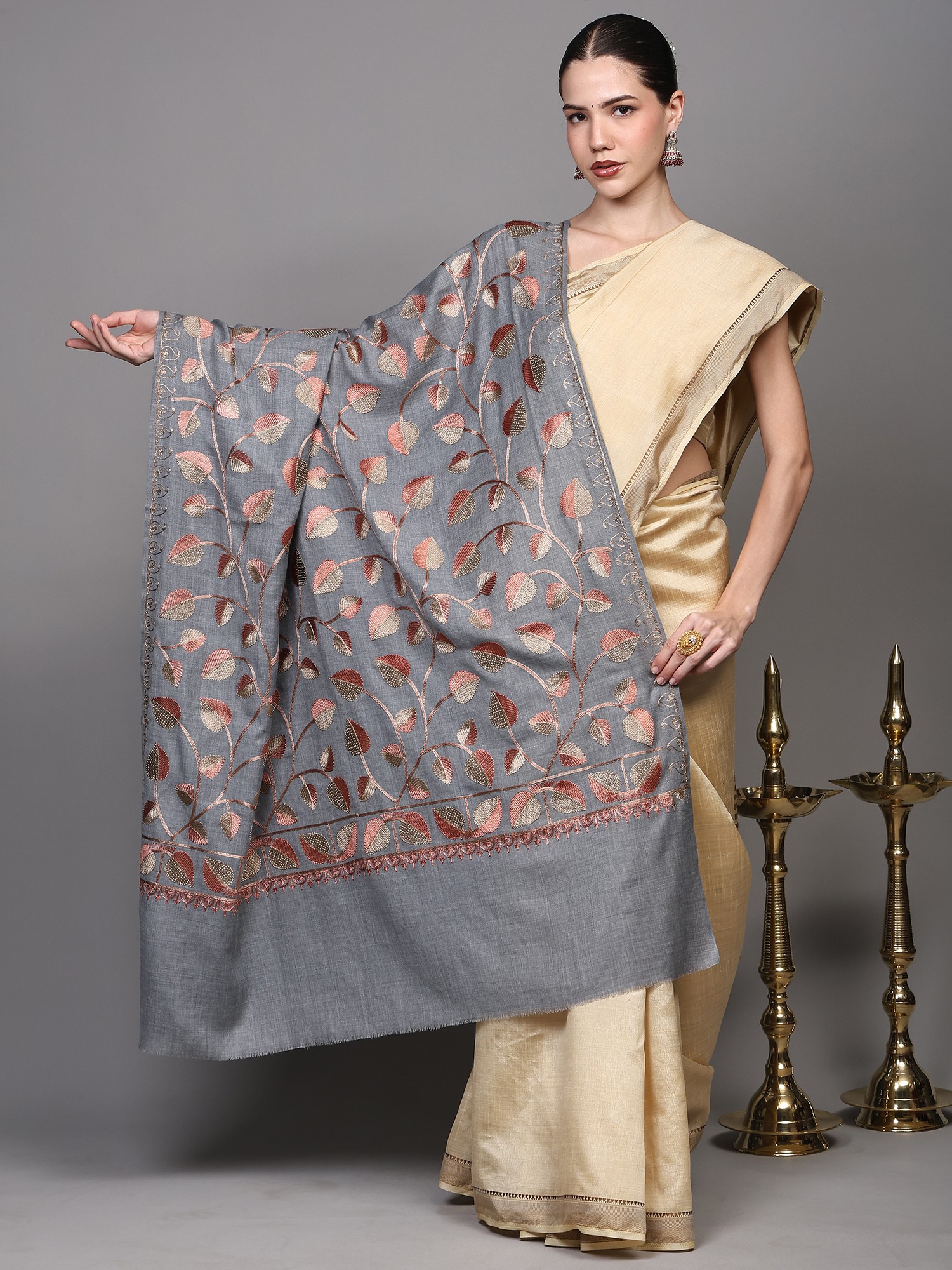 Woolen Detailed Multicolored Floral Jaal Pattern Fine Aari Embroidered Shawl from Kashmir