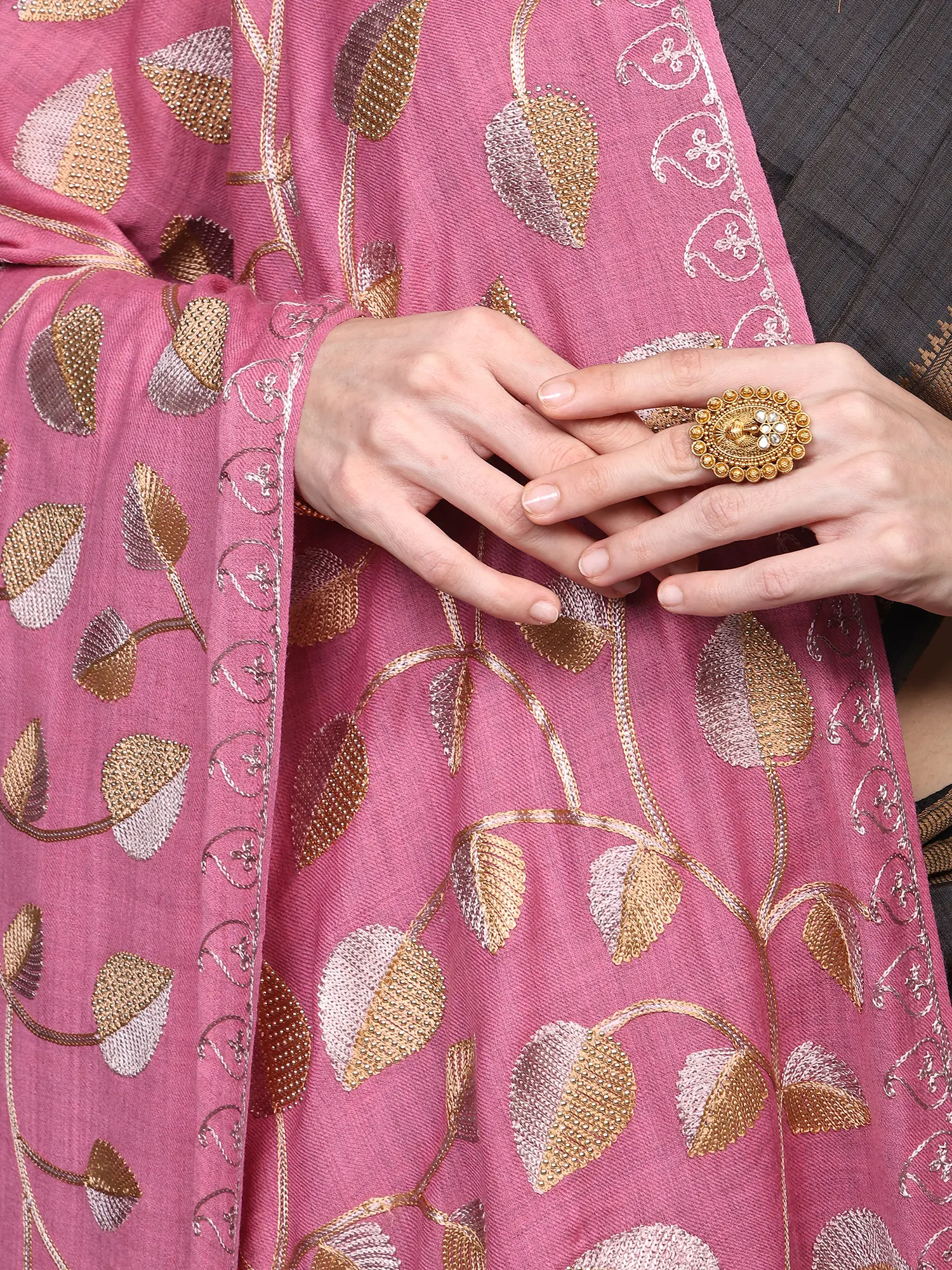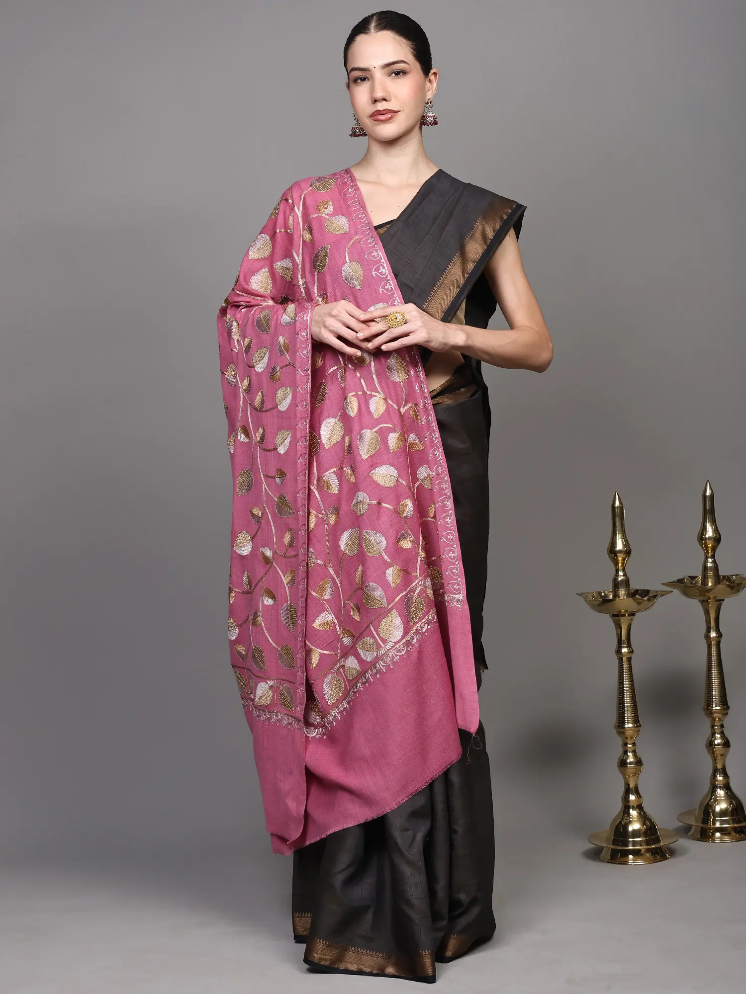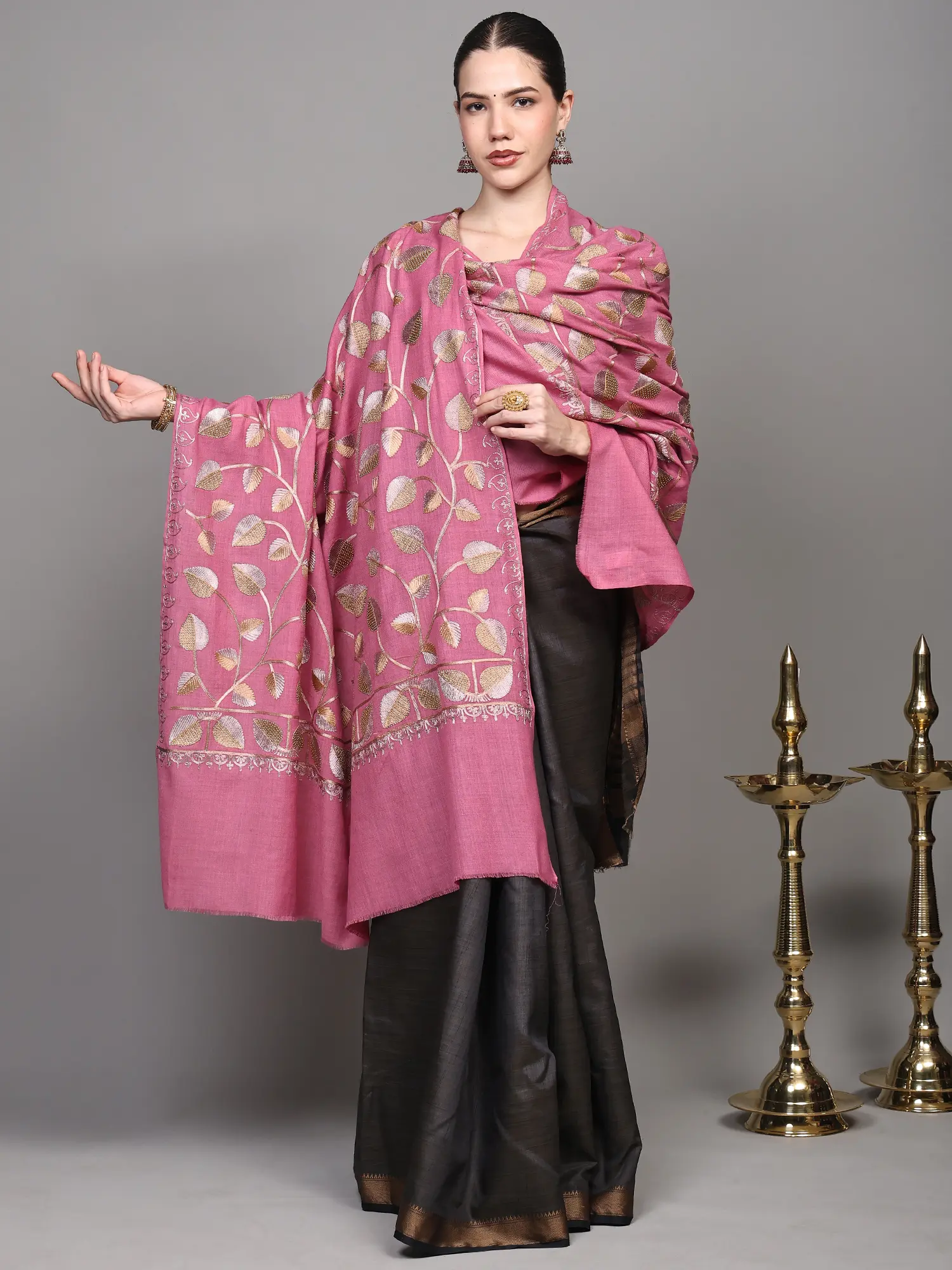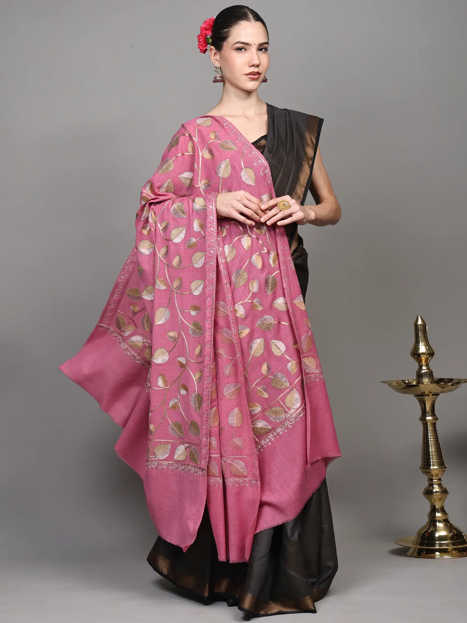 Geranium-Pink Sozni Embroidered Wool Shawl with Woven Flowers and Paiselys
