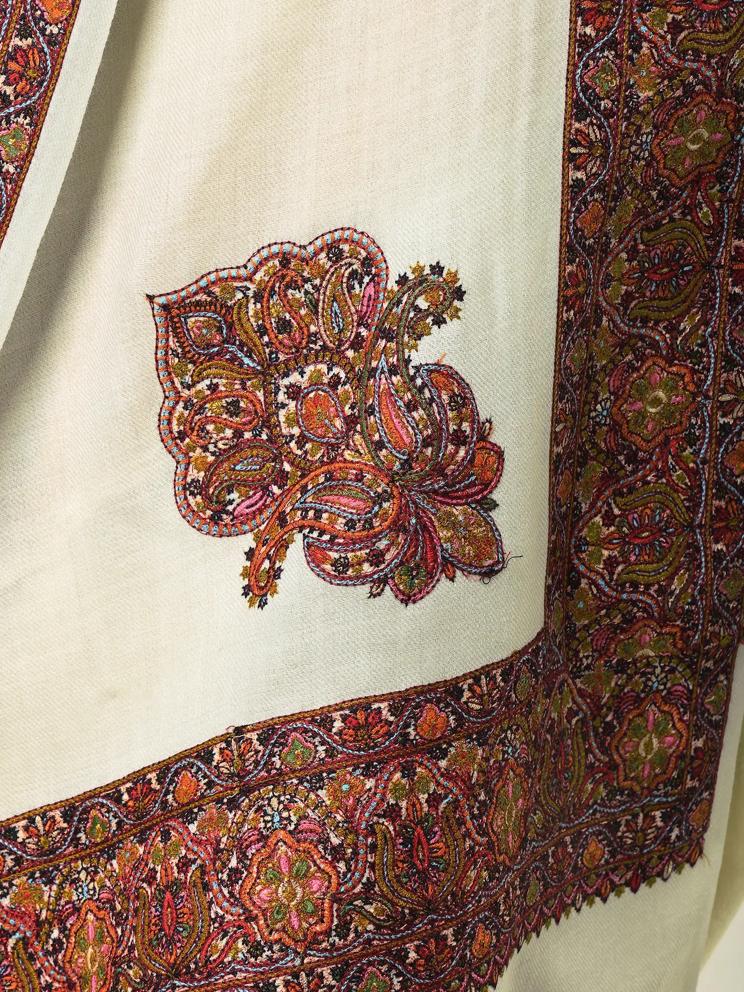 Aari Embroidered Wool Shawl from Amritsar with Paisleys Border