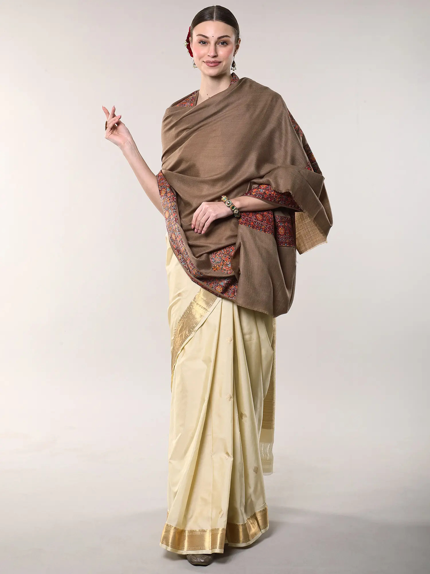 French-Oak Diamond Weaved Woolen Shawl with Sozni Embroidered Border