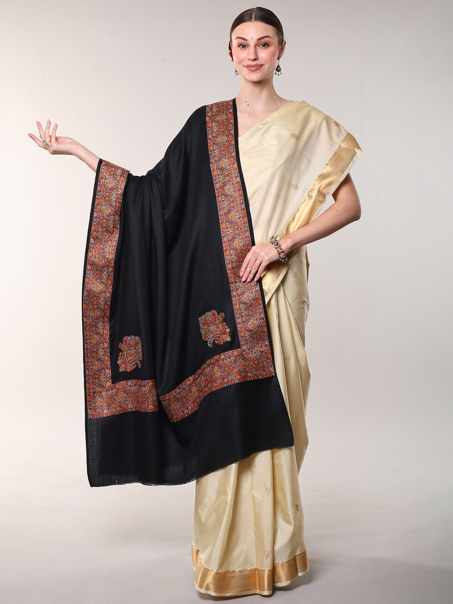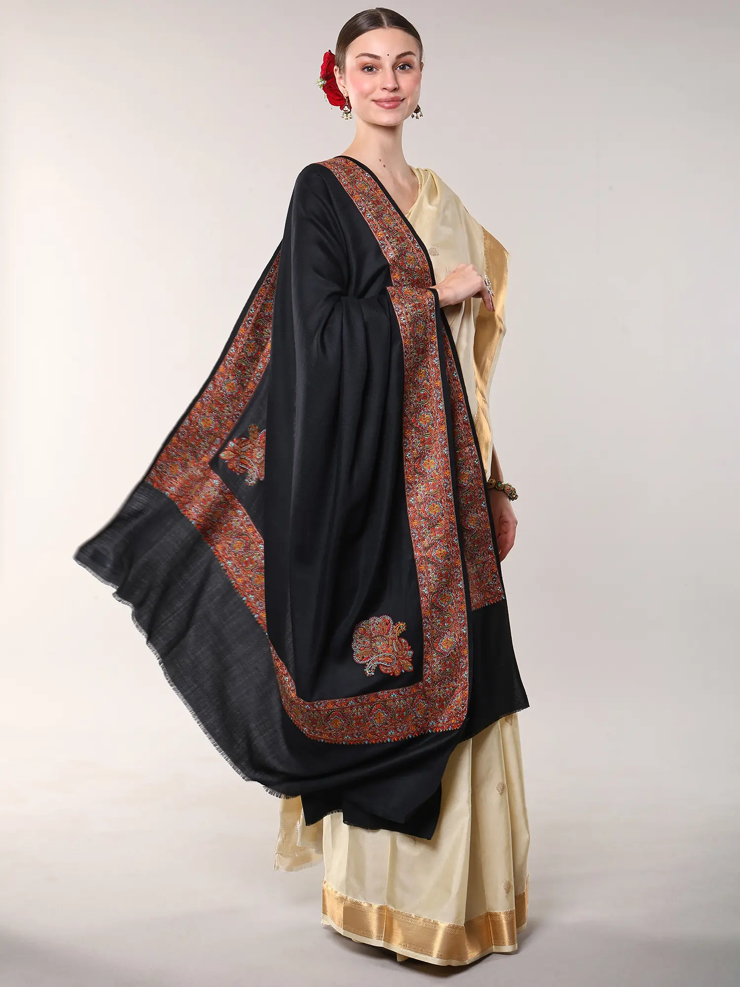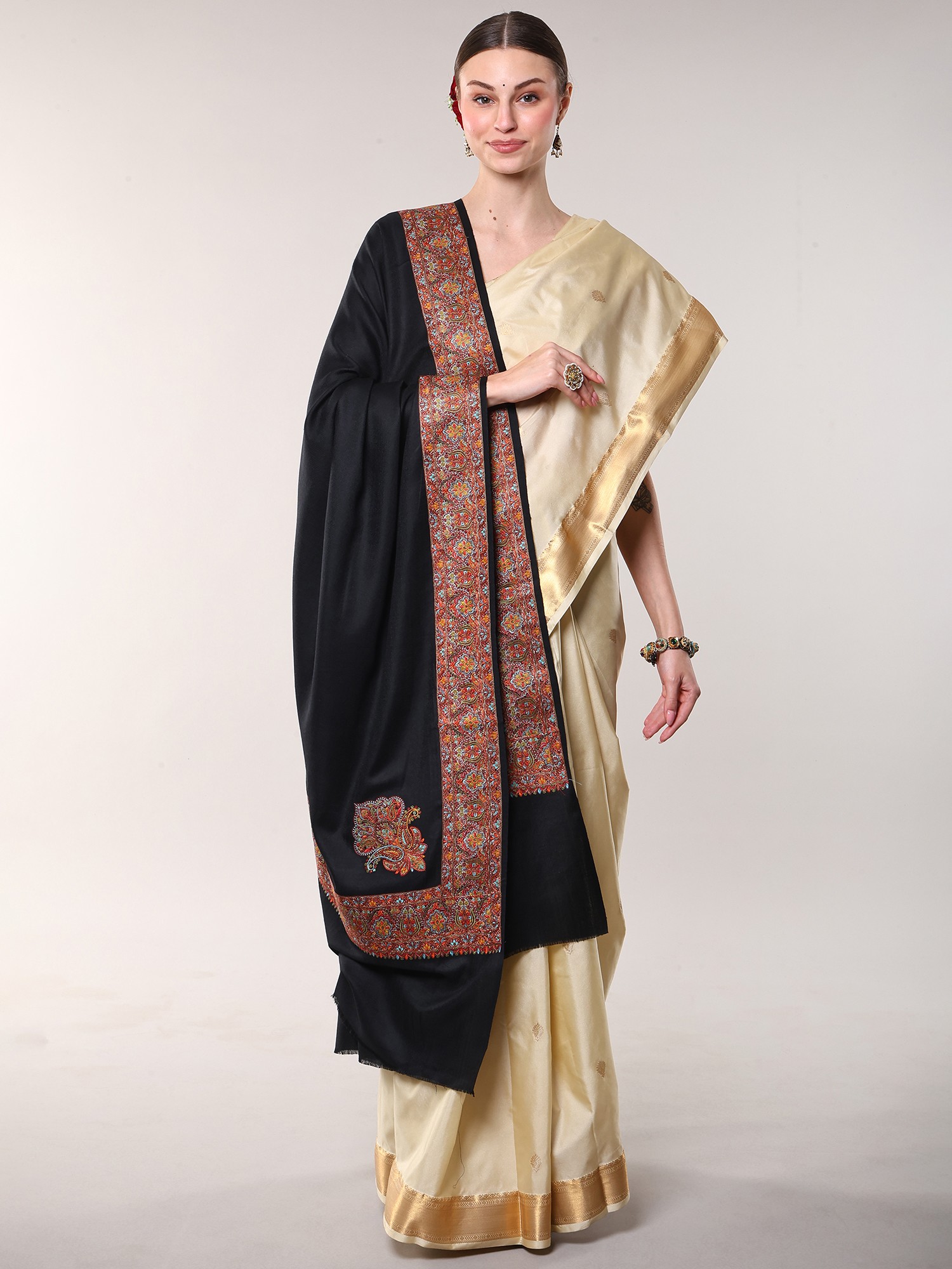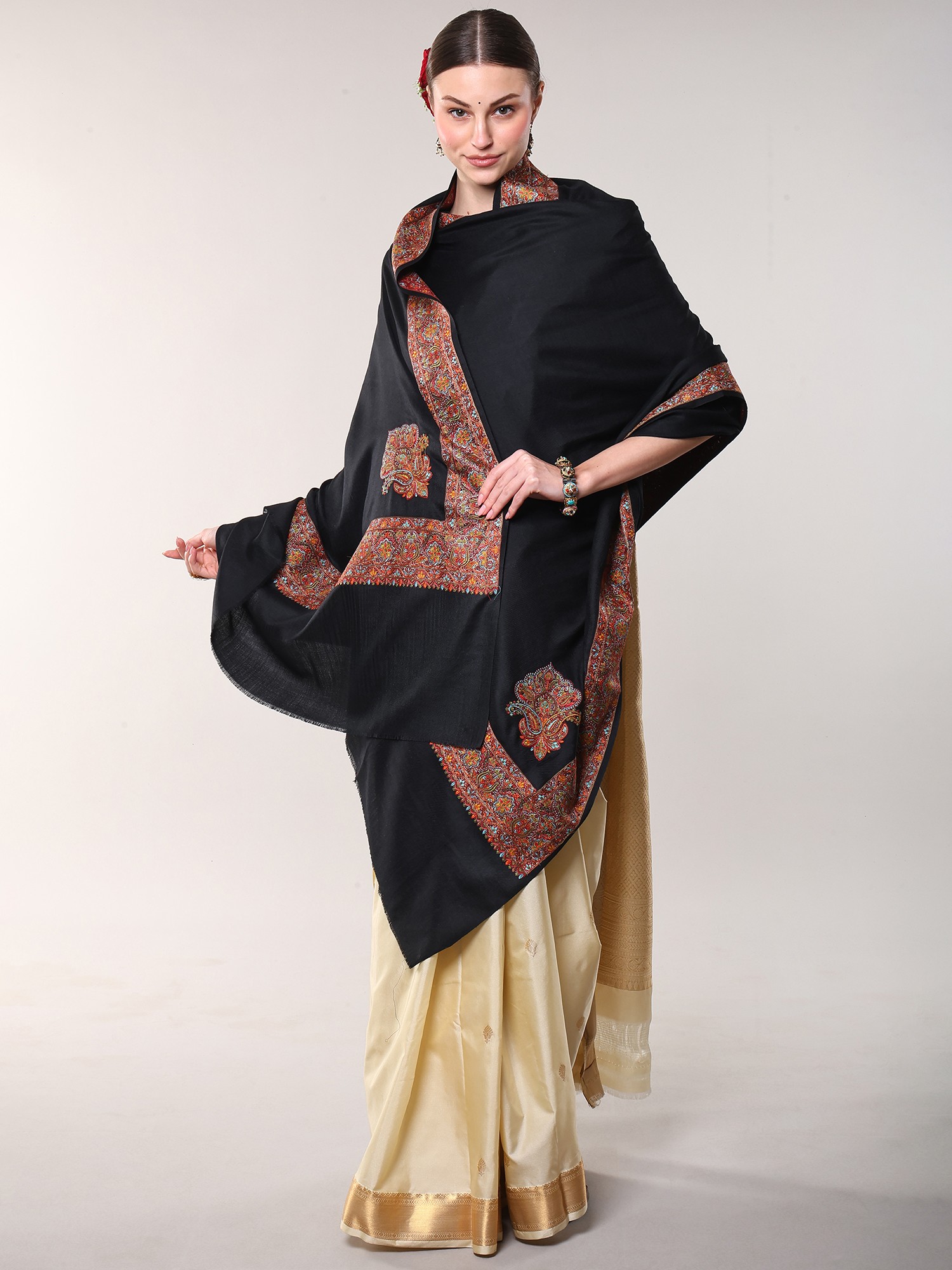 Wool Shawl with Floral Embroidered Border and Paisley on Corners from Amritsar