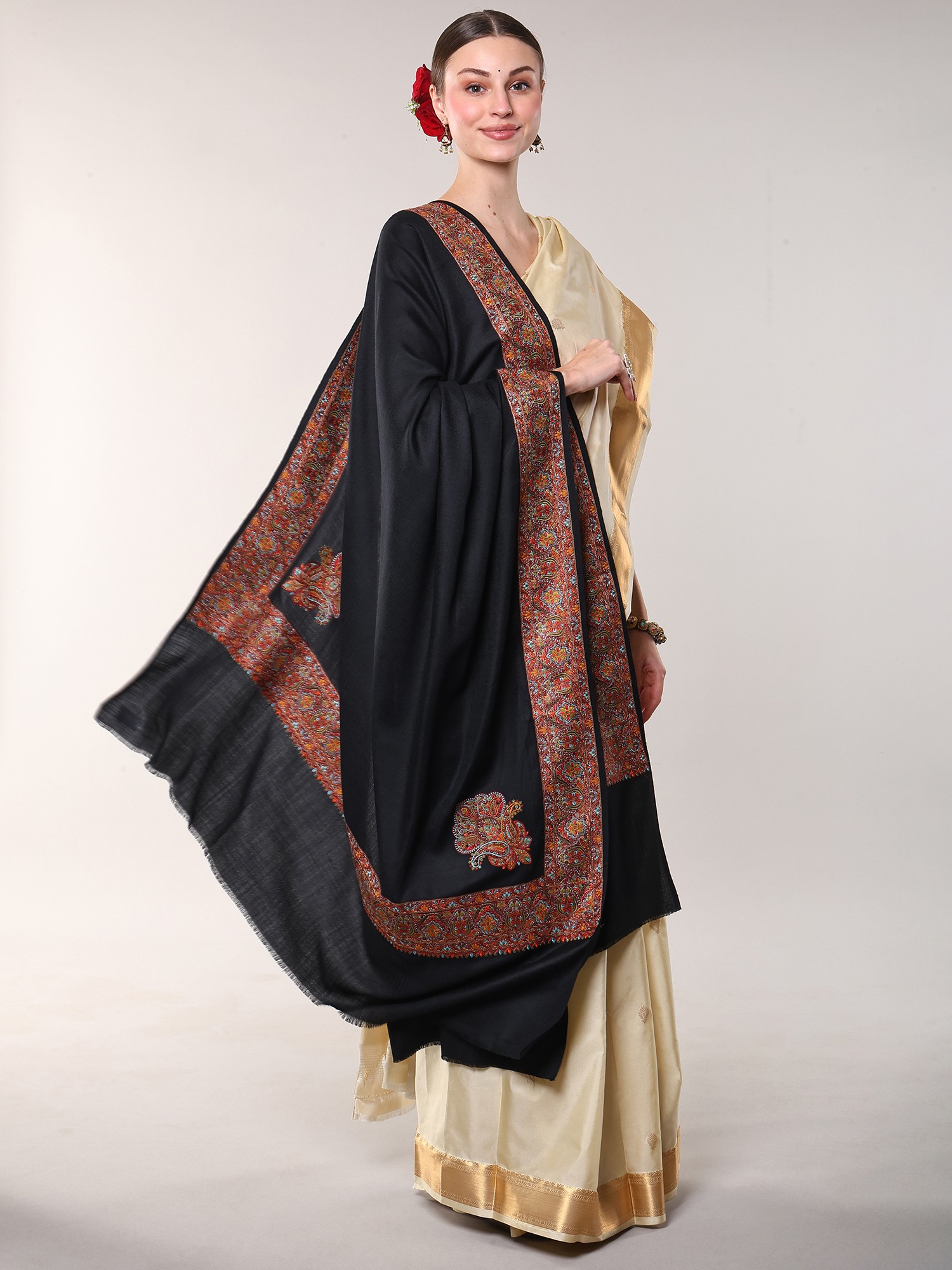 Pure Wool Shawl with Thread Embroidered Border Paisley and Corners from Amritsar