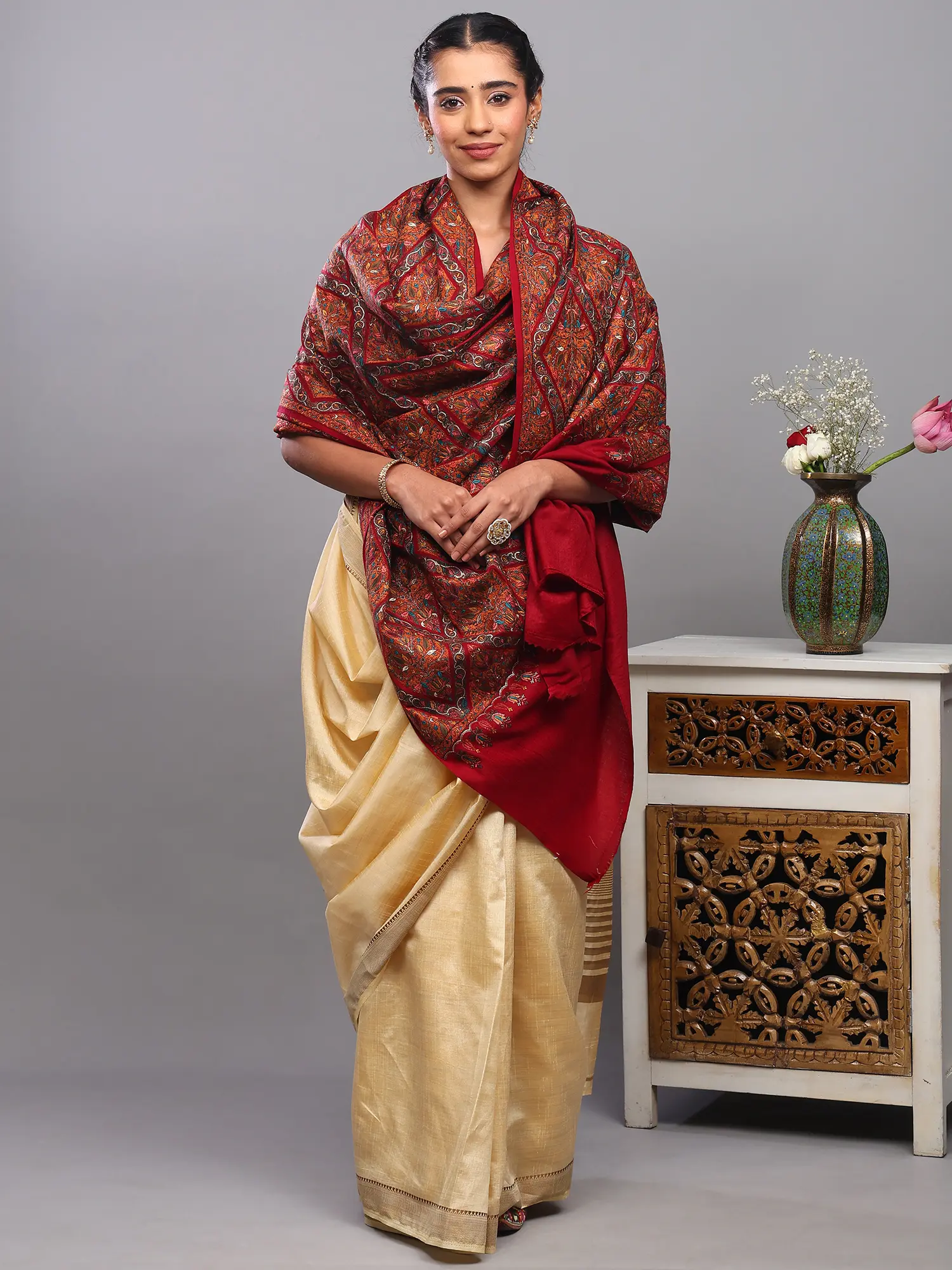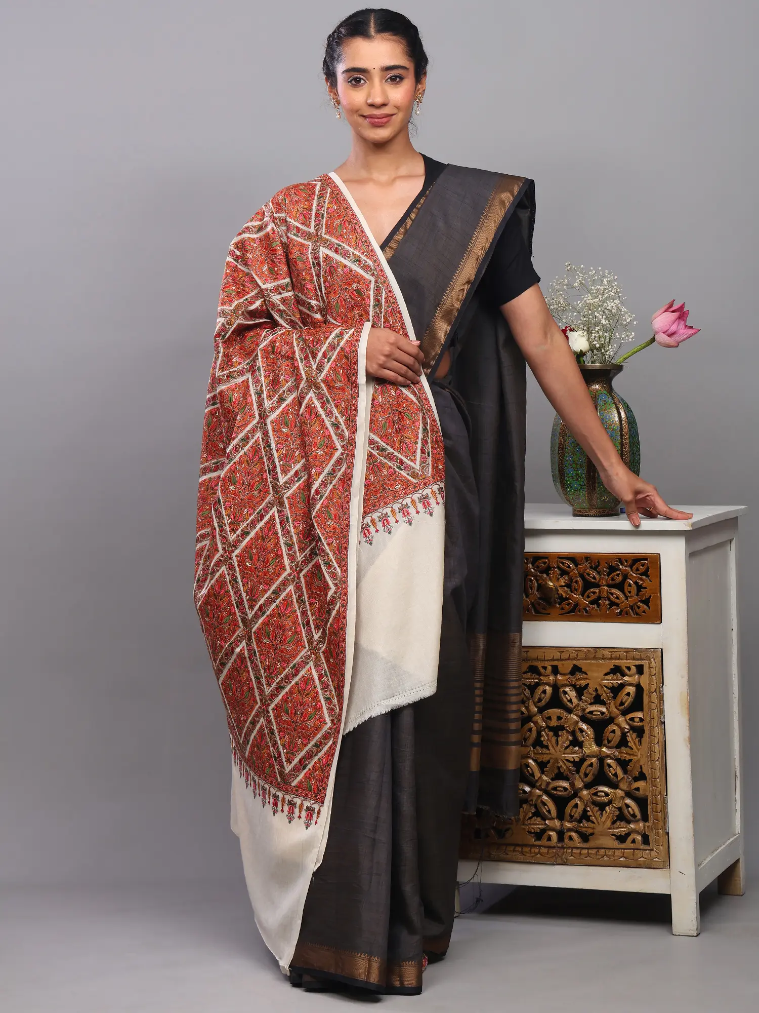 This generously sized shawl offers a versatile canvas for styling. Drape it elegantly over your shoulders for a sophisticated evening look, wrap it around for cozy warmth during a chilly day, or use it to add a pop of color and intricate detail to a simpler ensemble. The flowing dimensions ensure it complements various silhouettes, from traditional Indian wear like sarees and kurtis to contemporary dresses and even tailored coats. It’s an accessory designed to elevate your style, adding a touch of timeless elegance and cultural richness to any occasion.
