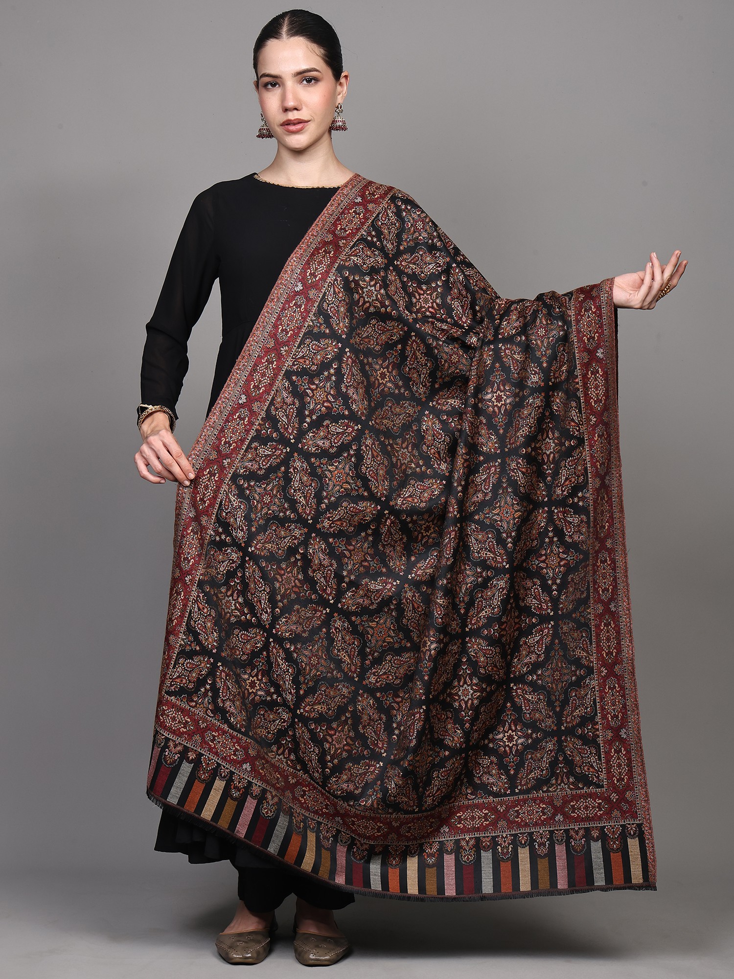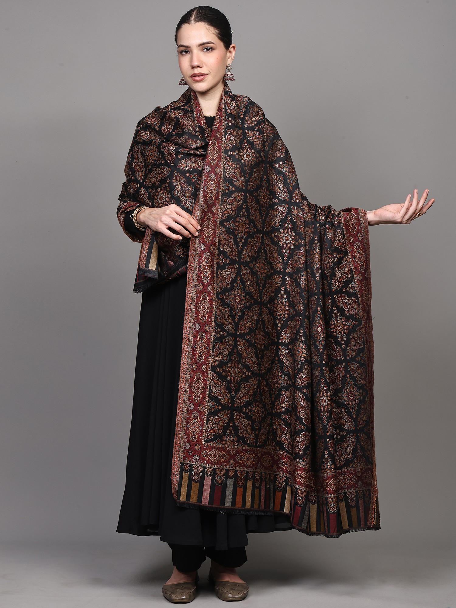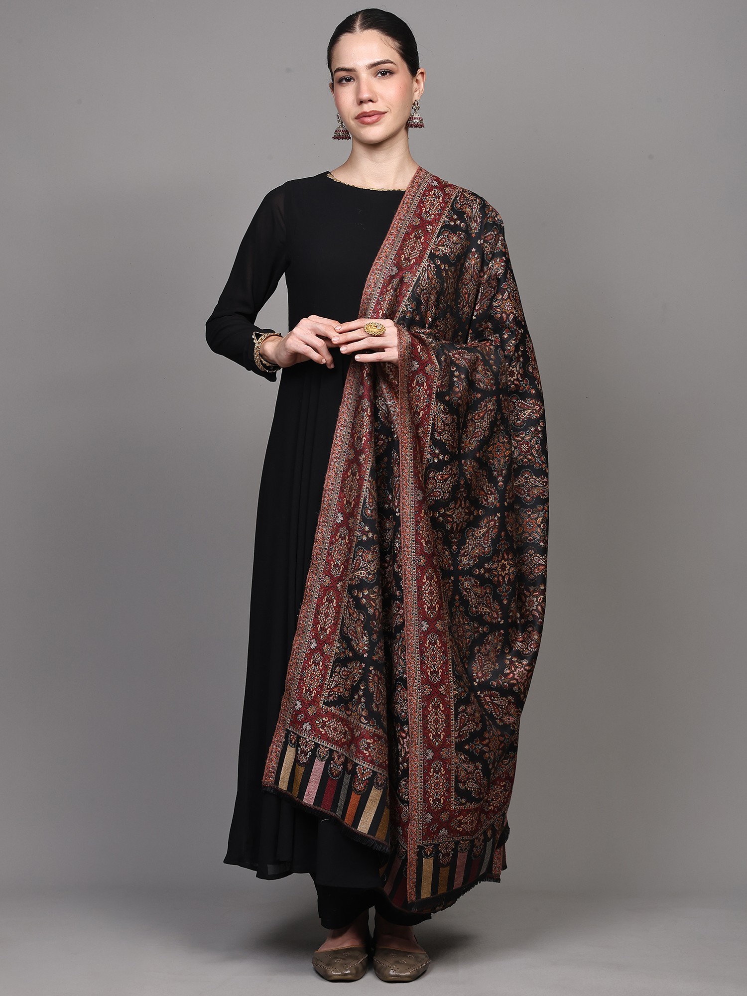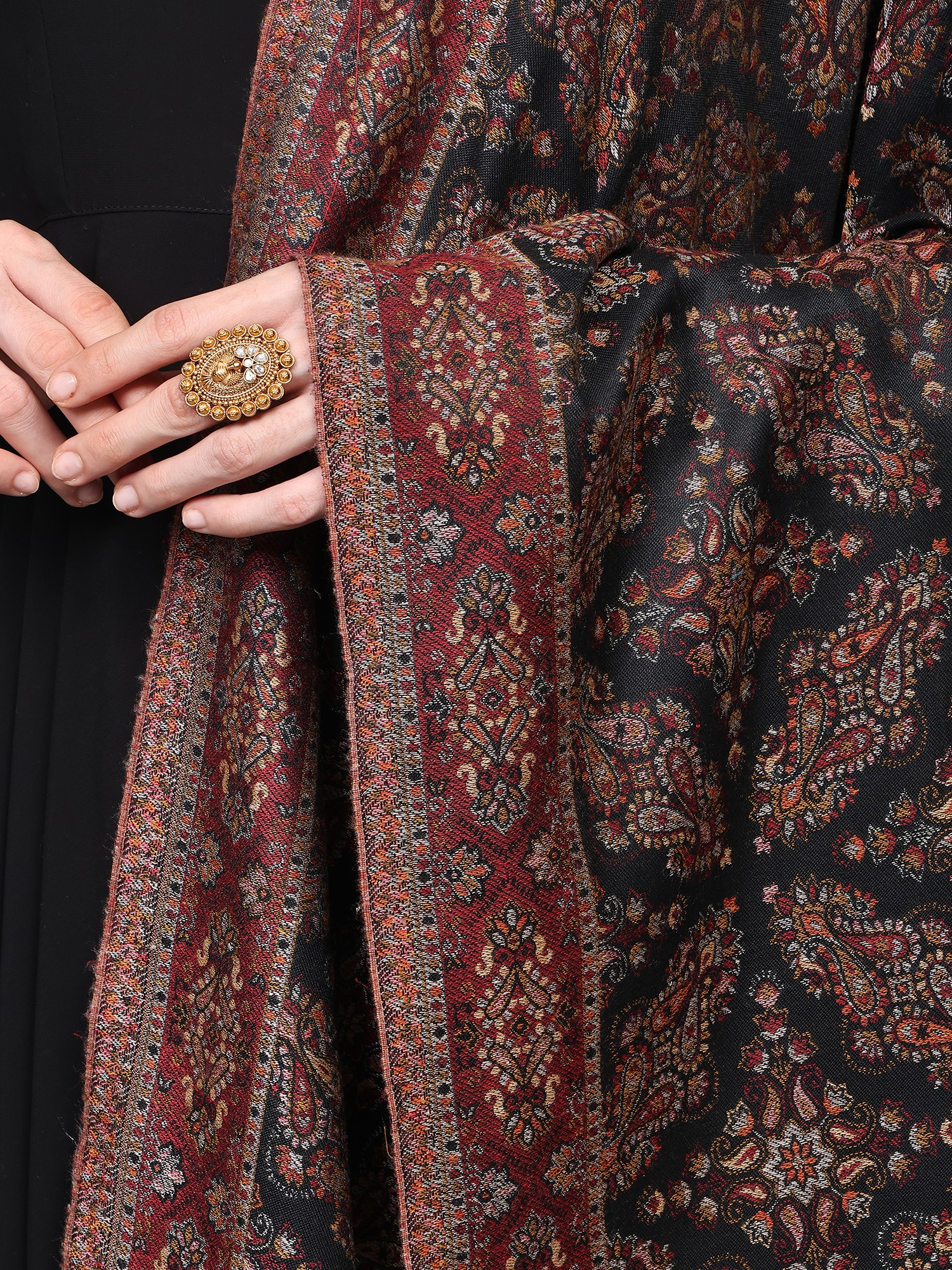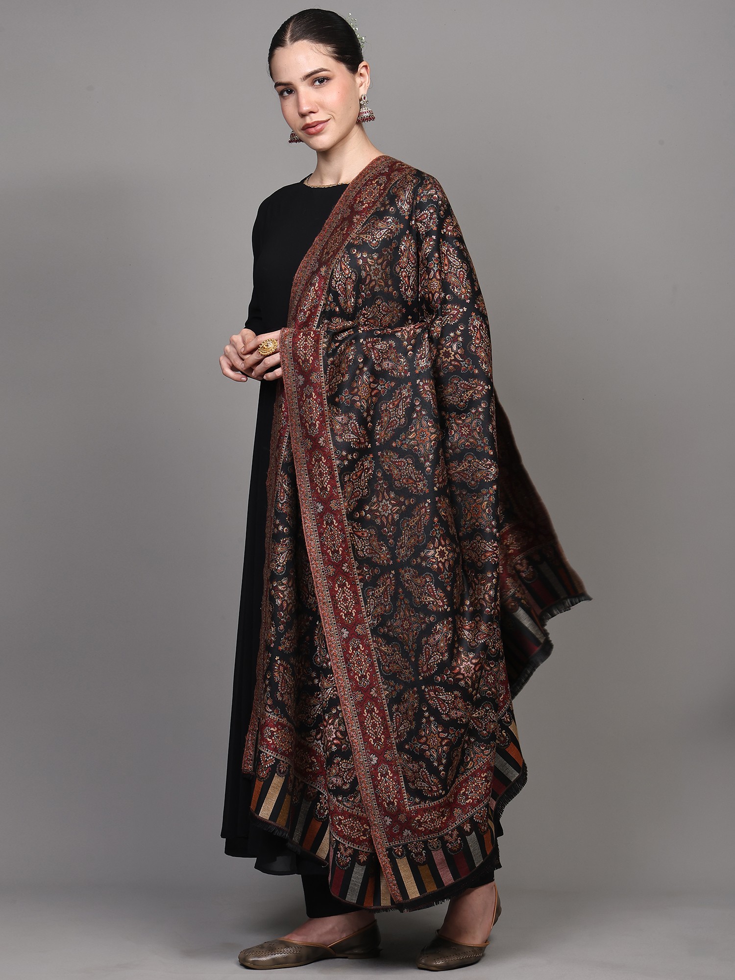 Immerse yourself in the artistry of Amritsar with this exquisite wool shawl, a testament to traditional Indian weaving techniques. This piece is more than just an accessory; it's a wearable work of art, carrying centuries of cultural narrative woven into its very threads. The deep, luxurious wool provides a comforting warmth, making it a perfect companion for cooler evenings or as a statement piece to elevate any ensemble. The intricate design is where this shawl truly shines. A tapestry of meticulously woven flowers and paisleys unfolds across the dark background, creating a mesmerizing visual depth. Each motif is rendered with incredible precision, showcasing the skill of artisans who have perfected their craft over generations. The color palette is a harmonious blend of rich, earthy tones interspersed with vibrant accents, creating a dynamic yet sophisticated aesthetic. The paisleys, with their teardrop shapes, are a timeless symbol of fertility and life, while the delicate floral patterns add a touch of organic beauty. The borders are equally captivating, featuring a dense, ornamental pattern in a deep, regal red that elegantly frames the central design and draws the eye. ––––––––––––––––––