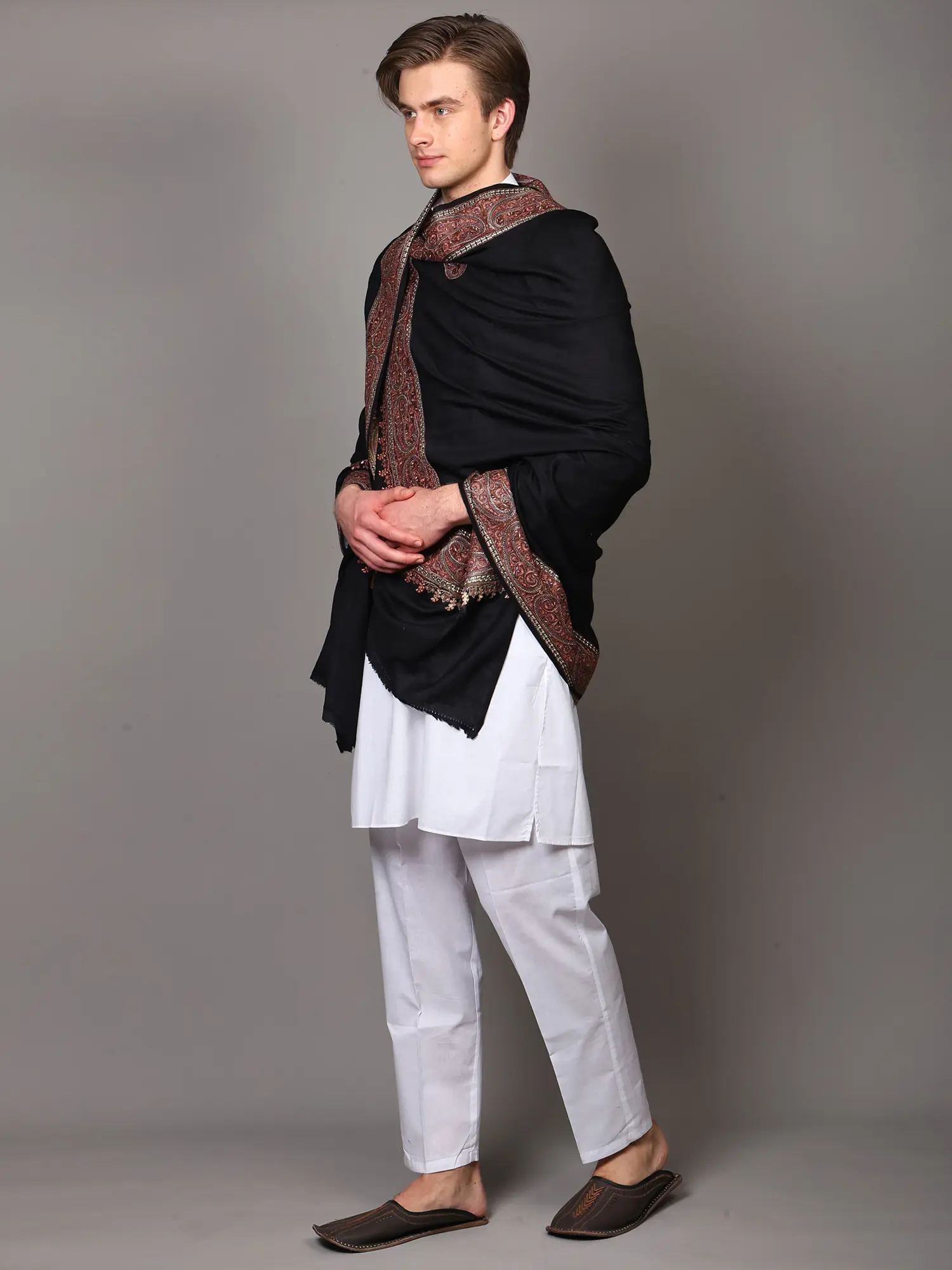 Designed with the discerning gentleman in mind, this shawl offers a blend of cultural authenticity and contemporary elegance. Its generous size ensures it can be draped in various styles, from a classic wrap over your shoulders to a more casual throw. It is the ideal accessory to complete traditional ensembles like kurtas and sherwanis, adding a touch of regal flair to any occasion, be it a festive gathering, a formal event, or simply a refined everyday look. The luxurious wool provides comfort and warmth, while the stunning embroidery adds a distinctive personality, making this shawl a truly statement piece that speaks volumes about your impeccable taste. Experience the fusion of comfort, tradition, and sophisticated design with this remarkable creation.