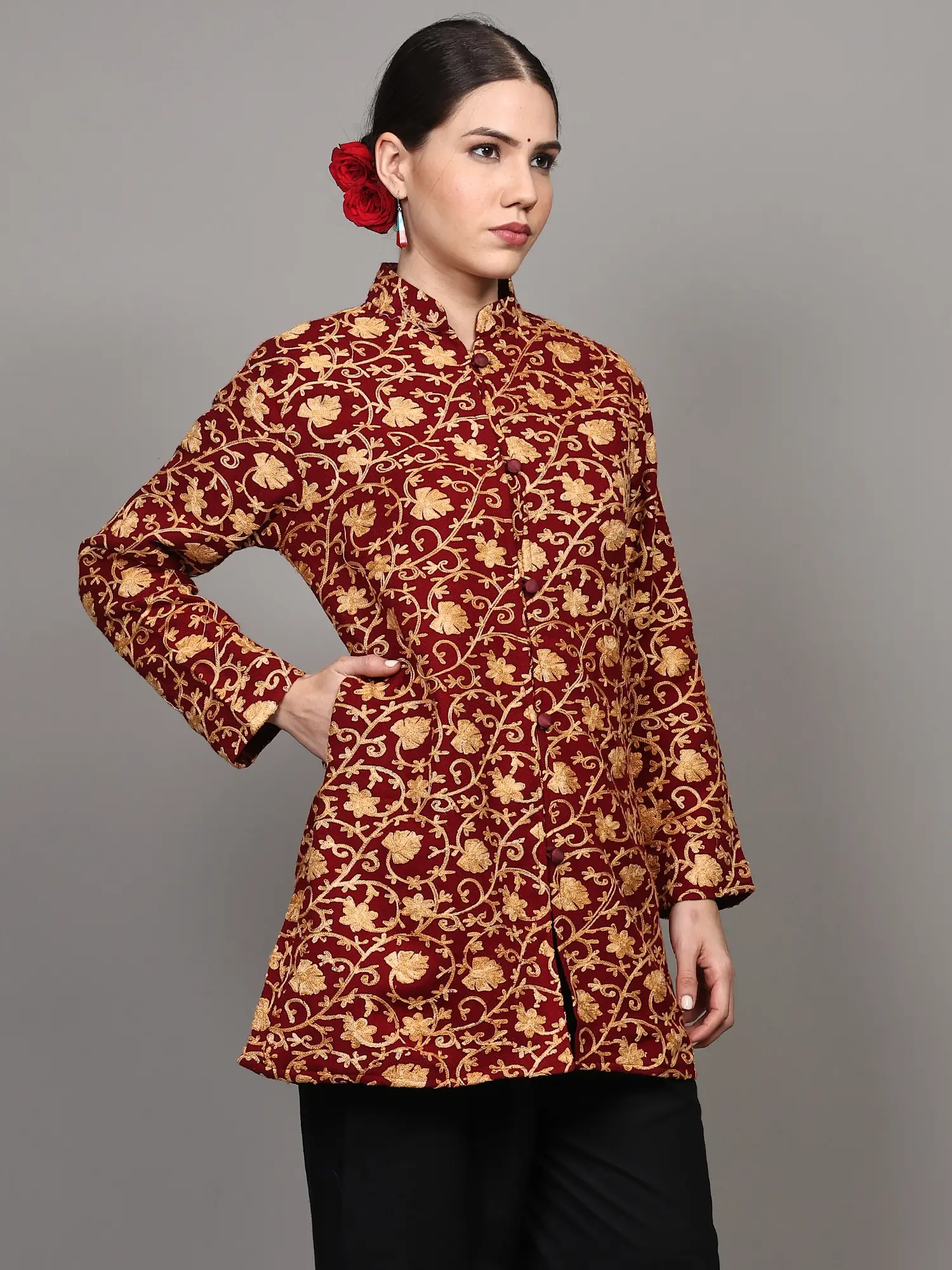 Kashmiri Short Jacket with Chain Stitch Aari Embroidered Floral Sprigs and Side Pockets