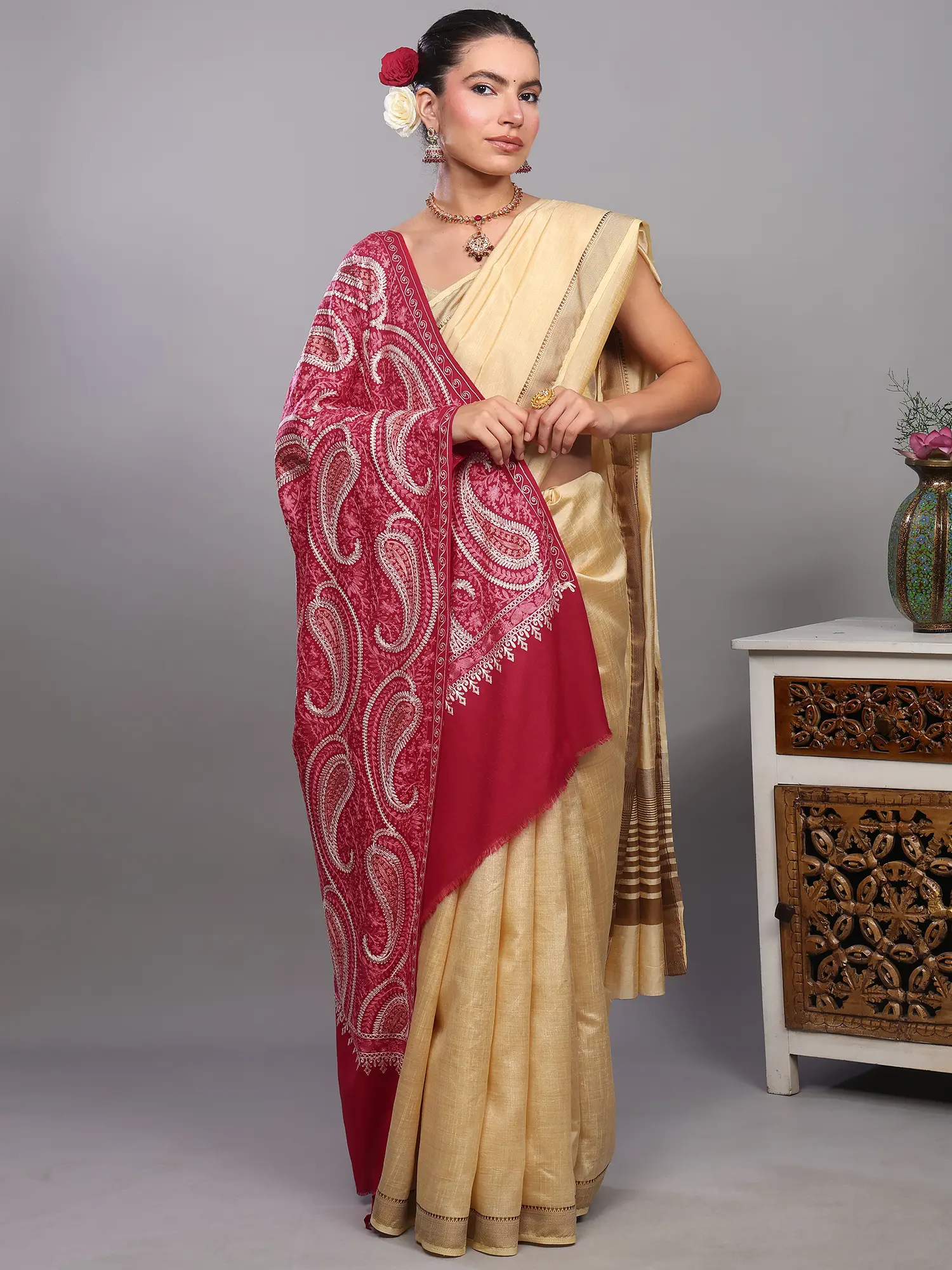 The stole is graced with generously sized paisley motifs, a classic Indian design renowned for its fluidity and symbolic representation of life and fertility. These motifs are rendered with remarkable detail through the delicate Aari embroidery technique. Each swirl and curve of the paisley is brought to life with fine threads, forming a rich, tactile tapestry against the soft wool. The contrasting thread used for the embroidery creates a sophisticated interplay of light and shadow, making the patterns pop with understated grandeur. ––––––––––––––––––