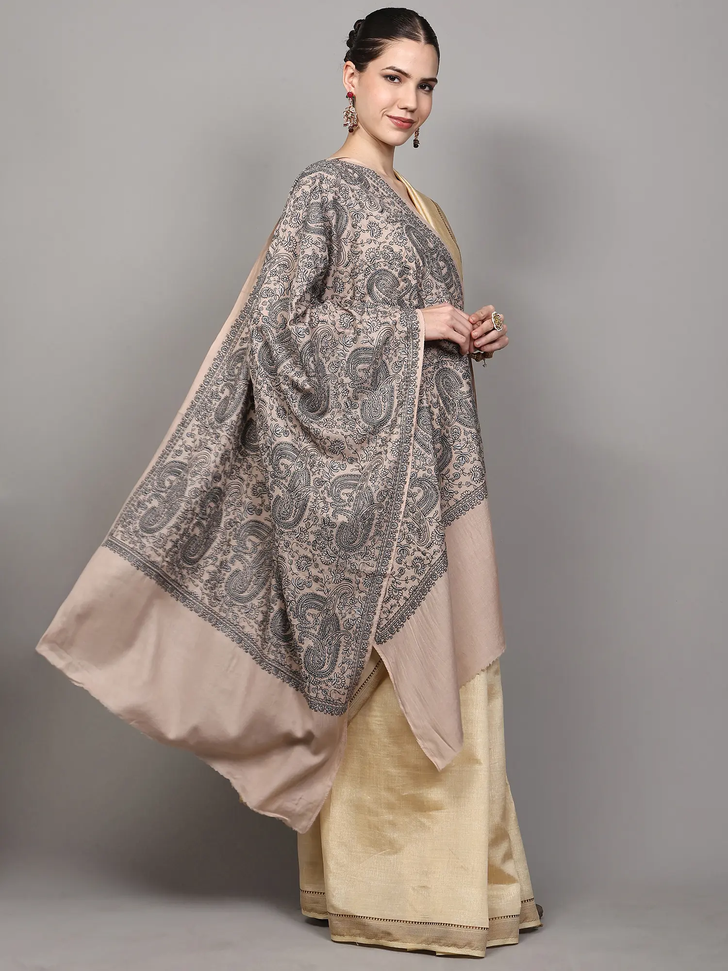 The true artistry of this stole lies in its breathtaking all-over thread embroidery. The design unfolds in a mesmerizing dance of giant paisleys and delicate floral motifs, each stitch a testament to the skill of generations of artisans. The paisley, a symbol of fertility and rebirth, is rendered in grand scale, exuding an aura of regal elegance. Interspersed are smaller, charming flowers, adding a touch of natural beauty and grace to the overall composition. The fine thread work creates a subtle yet striking texture, catching the light and drawing the eye to its exquisite patterns. The monochromatic embroidery against the serene backdrop of the wool fabric creates a sophisticated contrast that is both understated and captivating.