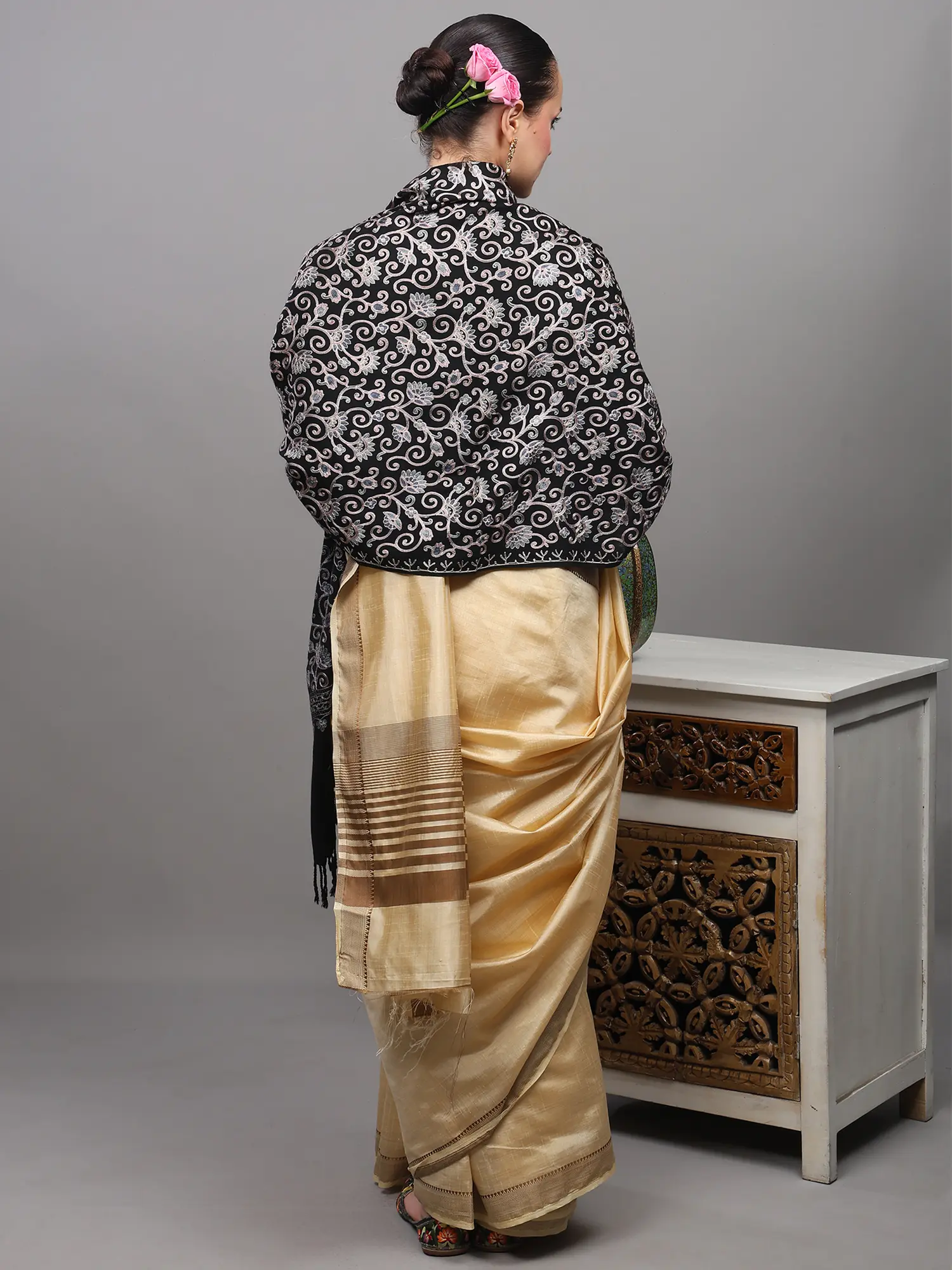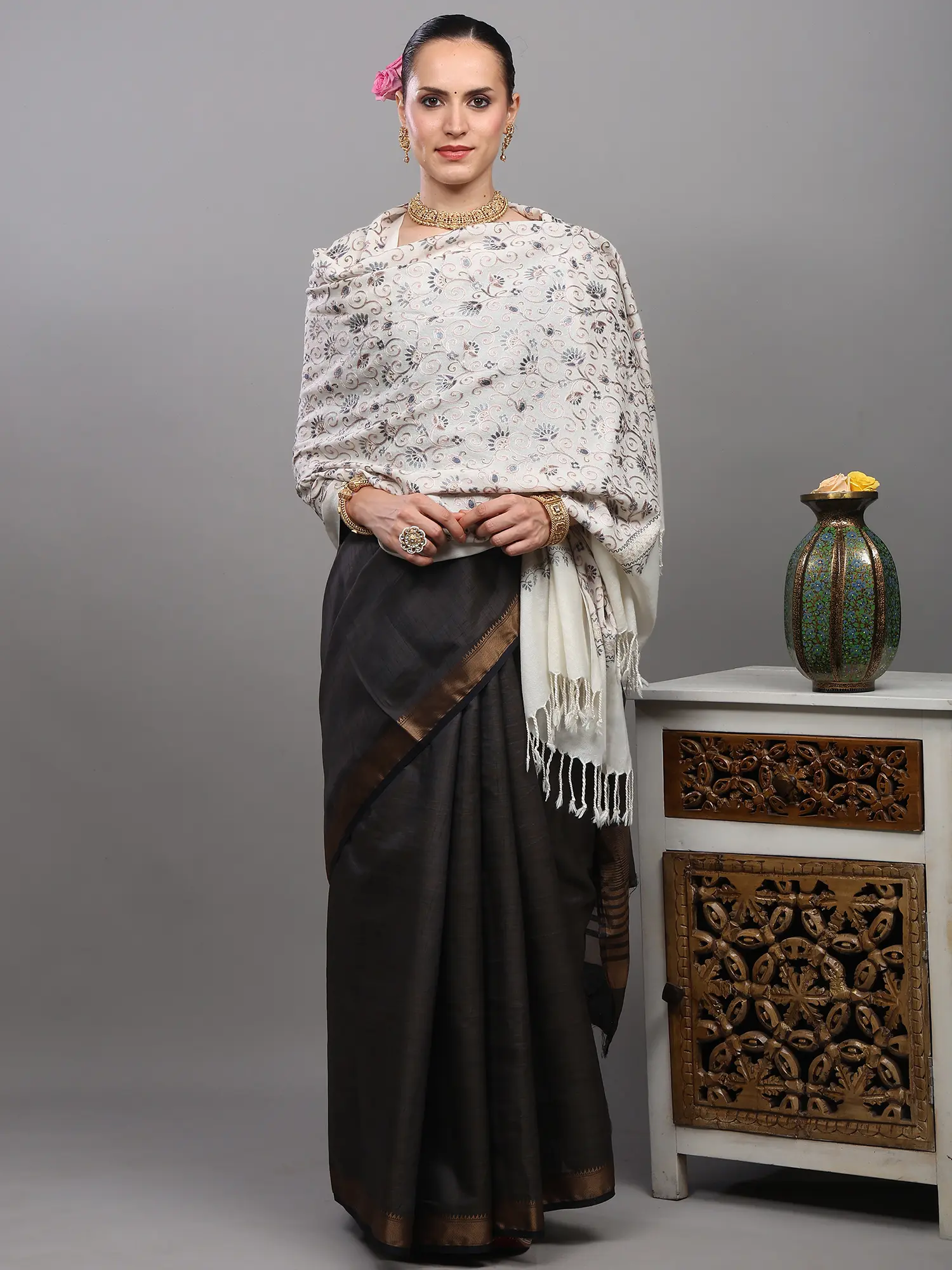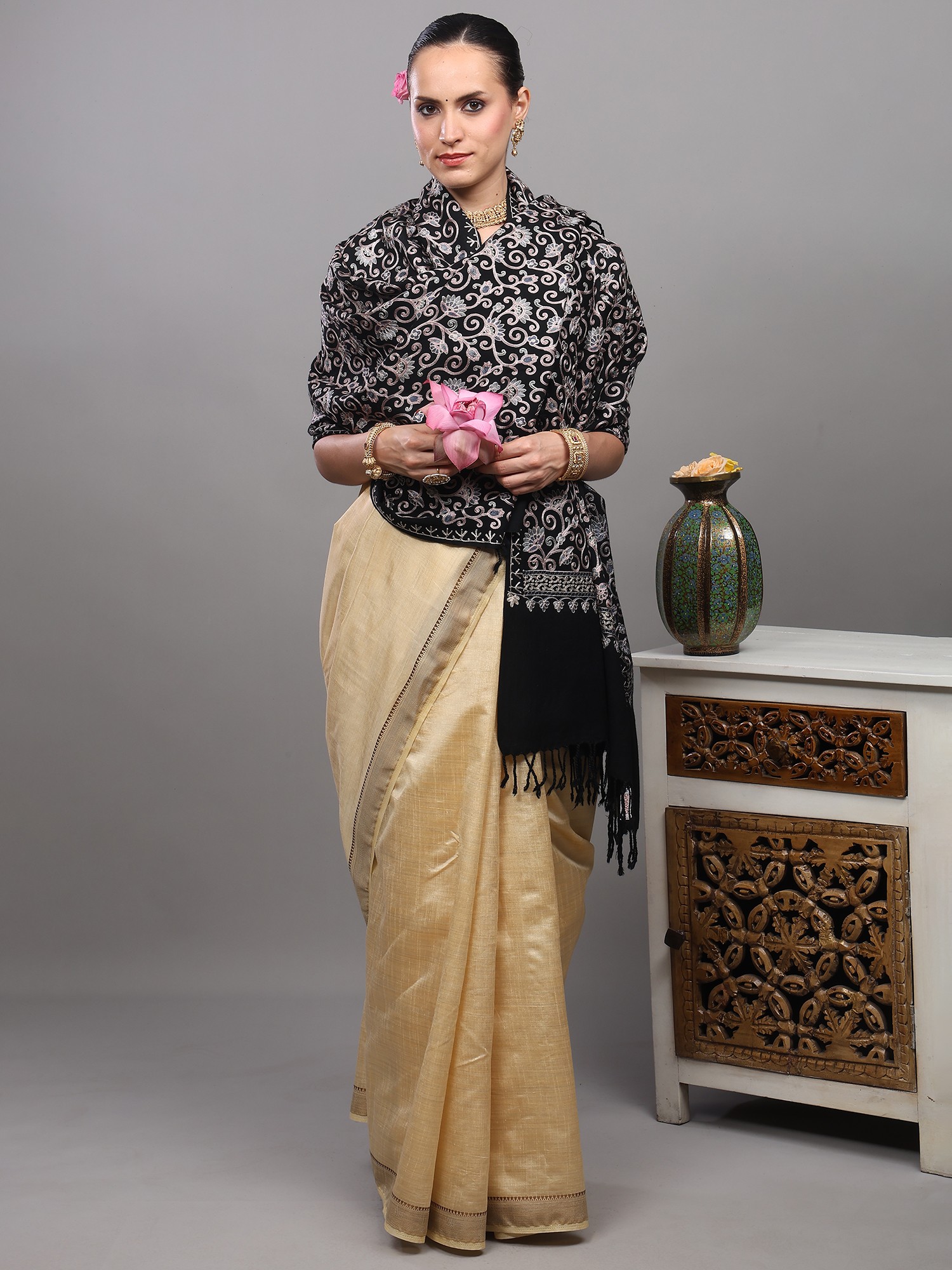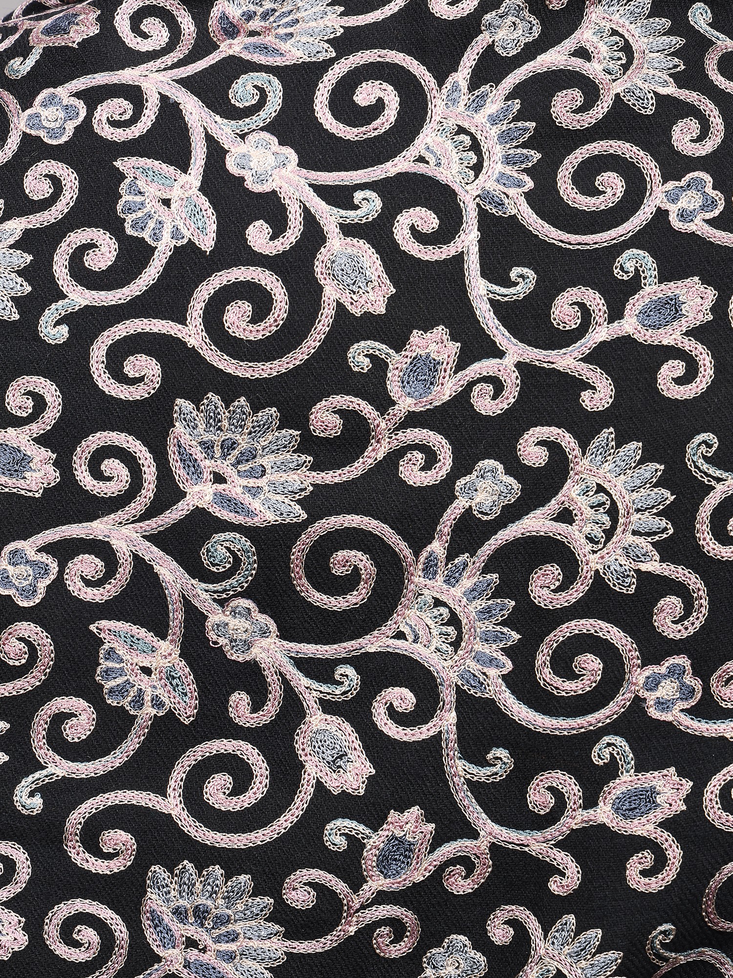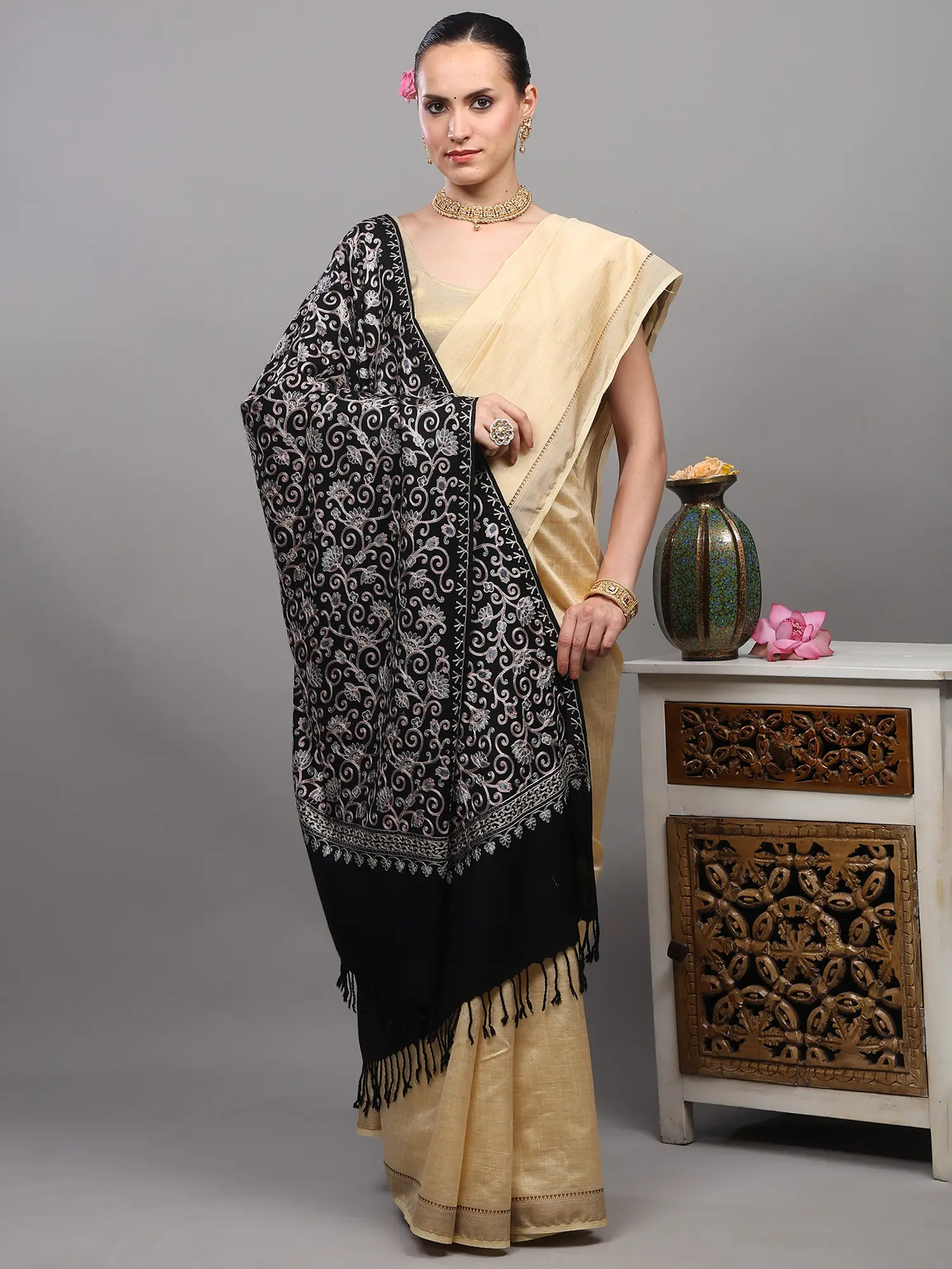Jet-Black Pure Pashmina Sozni Jamawar Shawl