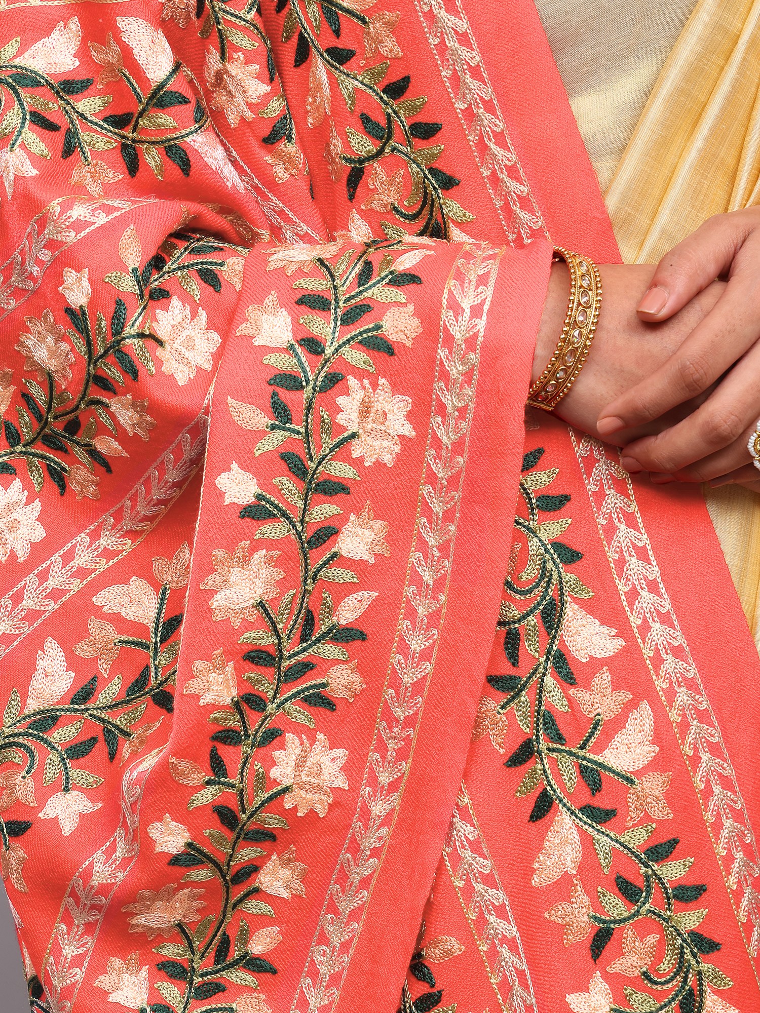 Pure Wool Shawl from Punjab with Multicolor Intricate Embroidered Floral Vines