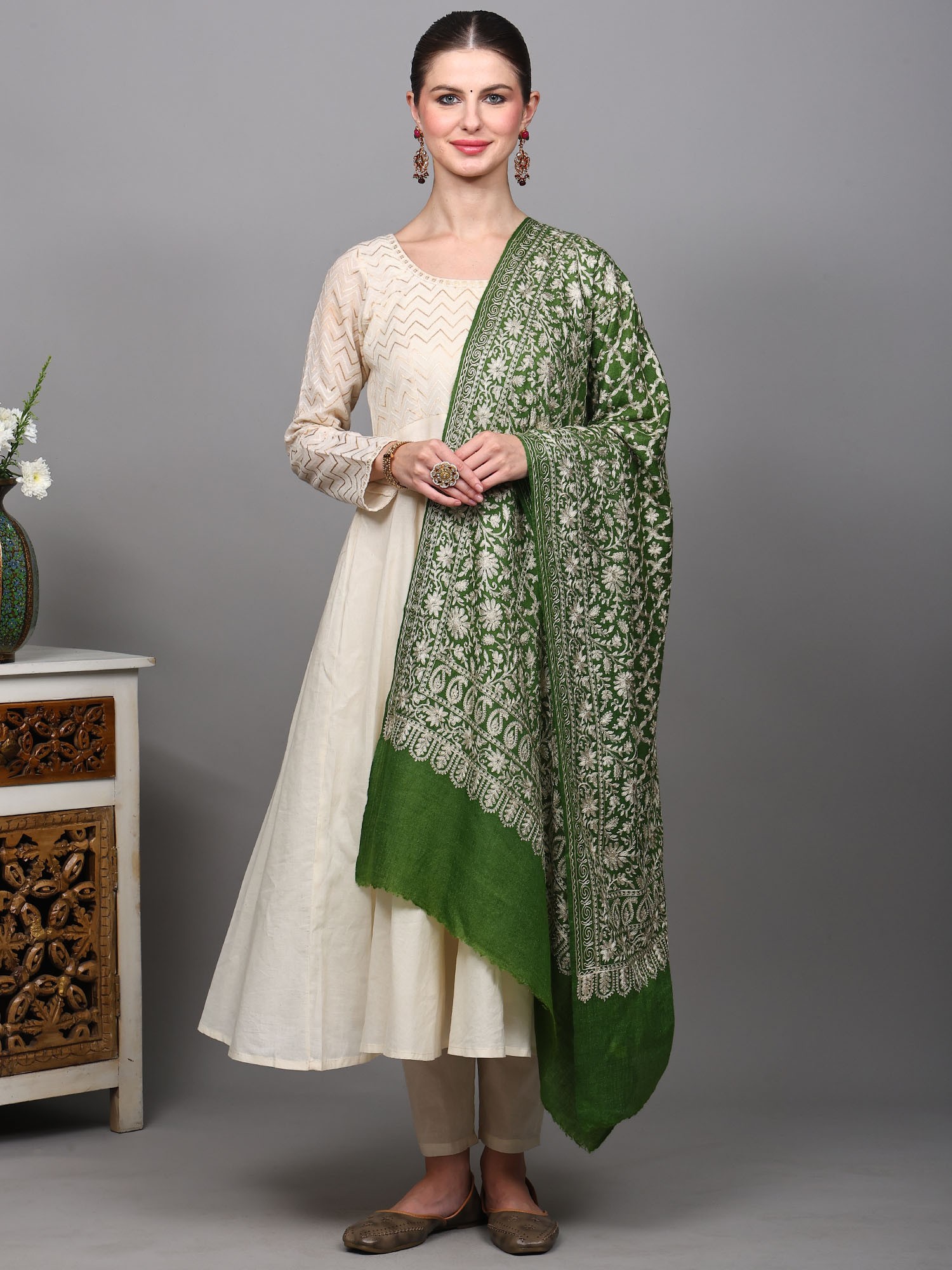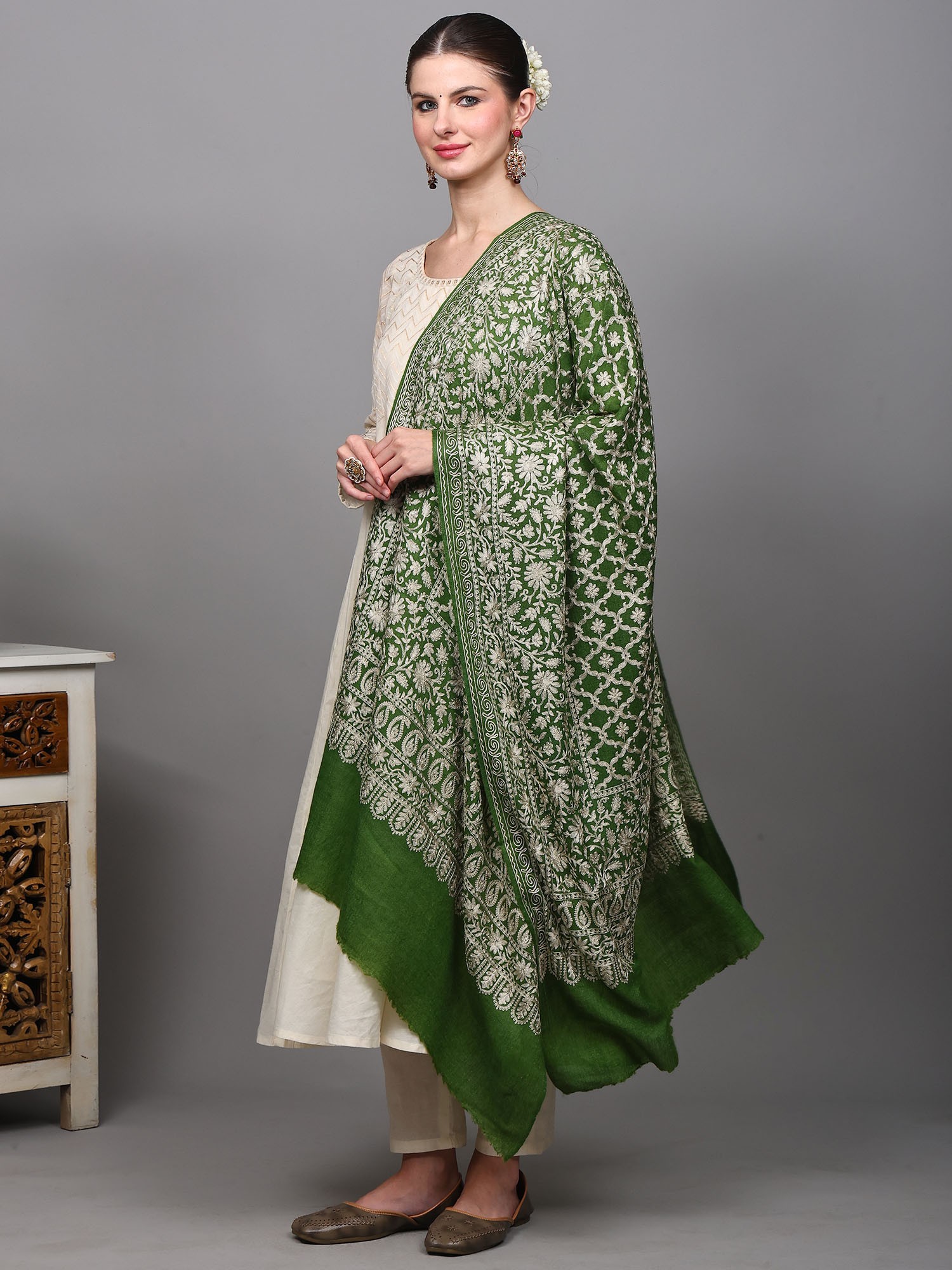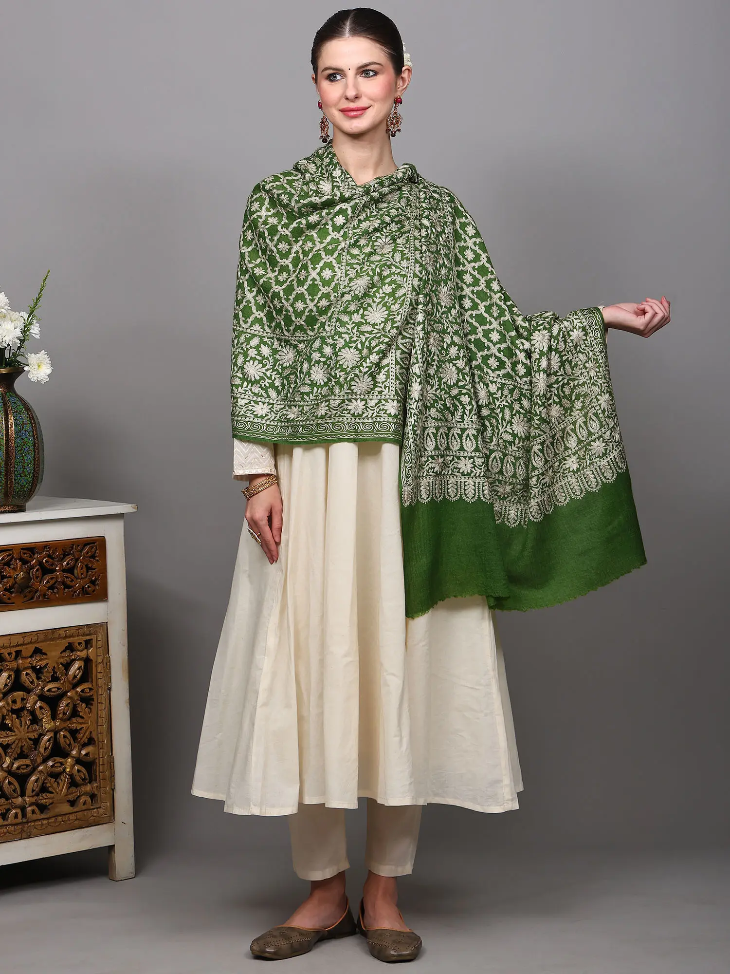 Measuring a generous length, this wool stole offers remarkable versatility in styling. Drape it elegantly over your shoulders to add a layer of warmth and sophistication to an ethnic kurti or a contemporary dress. It can be worn loosely for a relaxed yet chic look, or secured with a brooch for a more polished appearance. The intricate embroidery makes it a statement piece, capable of transforming a simple outfit into something truly extraordinary. The classic floral motif ensures its timeless appeal, making it an accessory that you will cherish for seasons to come. It is an ideal choice for special occasions, festive gatherings, or simply when you want to elevate your everyday style with a touch of artisanal luxury.