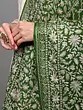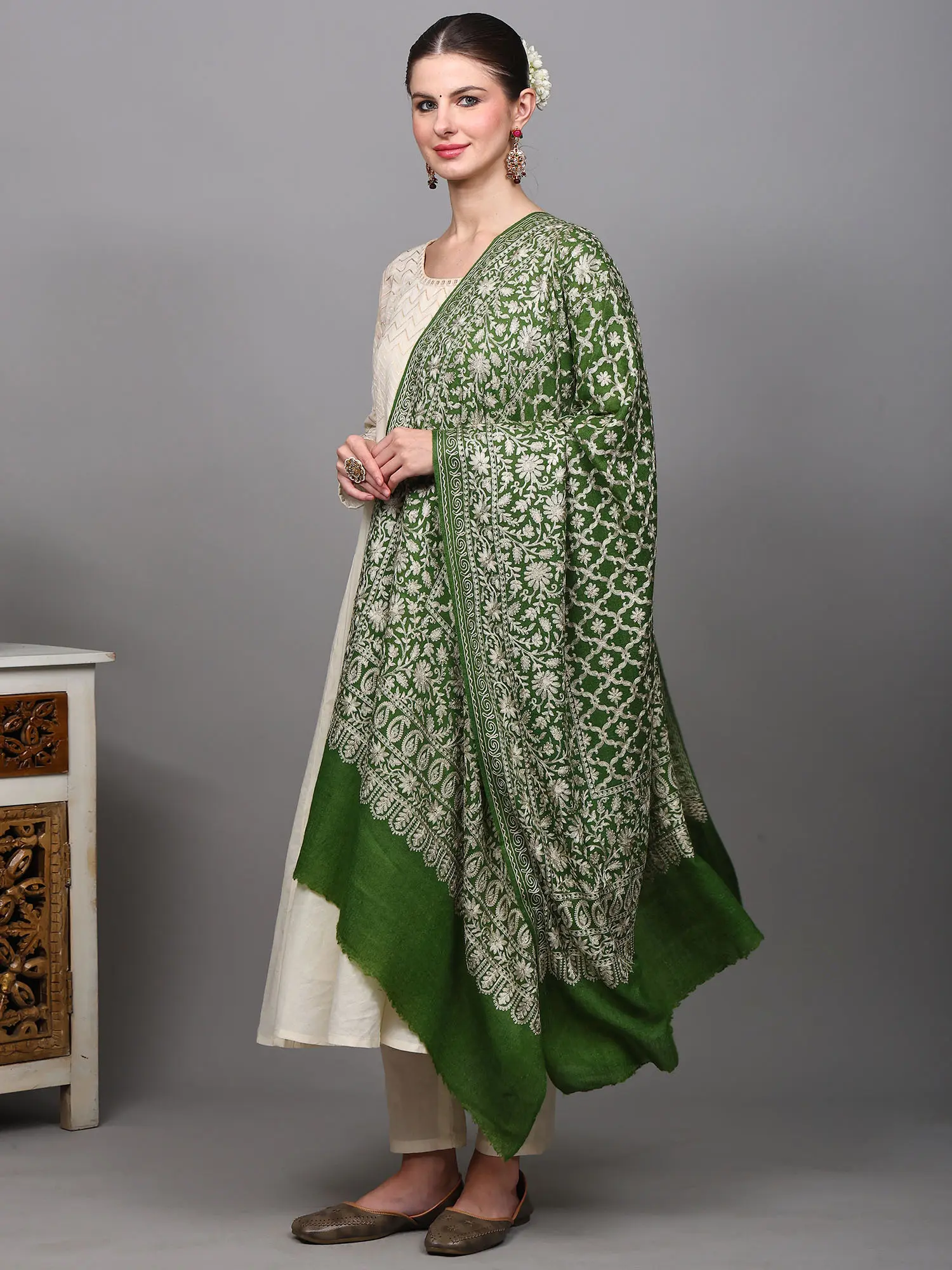 The heart of this stole's allure lies in its detailed floral jaal embroidery, executed with precision using the time-honored chain stitch technique. This delicate yet durable stitch creates a raised texture that beautifully accentuates the intricate patterns. The embroidery features a mesmerizing arrangement of blossoms and leaves, forming a dense and harmonious 'jaal' or net-like motif that flows gracefully across the fabric. Each element of the design is rendered with meticulous care, showcasing the skill and dedication of the artisans from Amritsar, a region renowned for its rich textile heritage. The contrast between the vibrant green wool and the crisp white embroidery creates a striking and sophisticated look that is both timeless and contemporary.