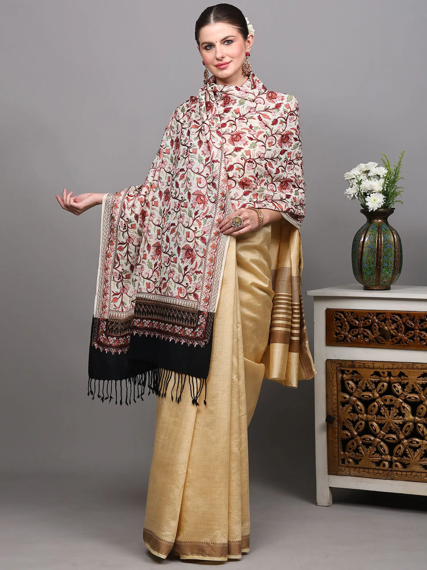 Wool Stole from Punjab with Multicolor Thread Embroidered Paisleys Floral Vine