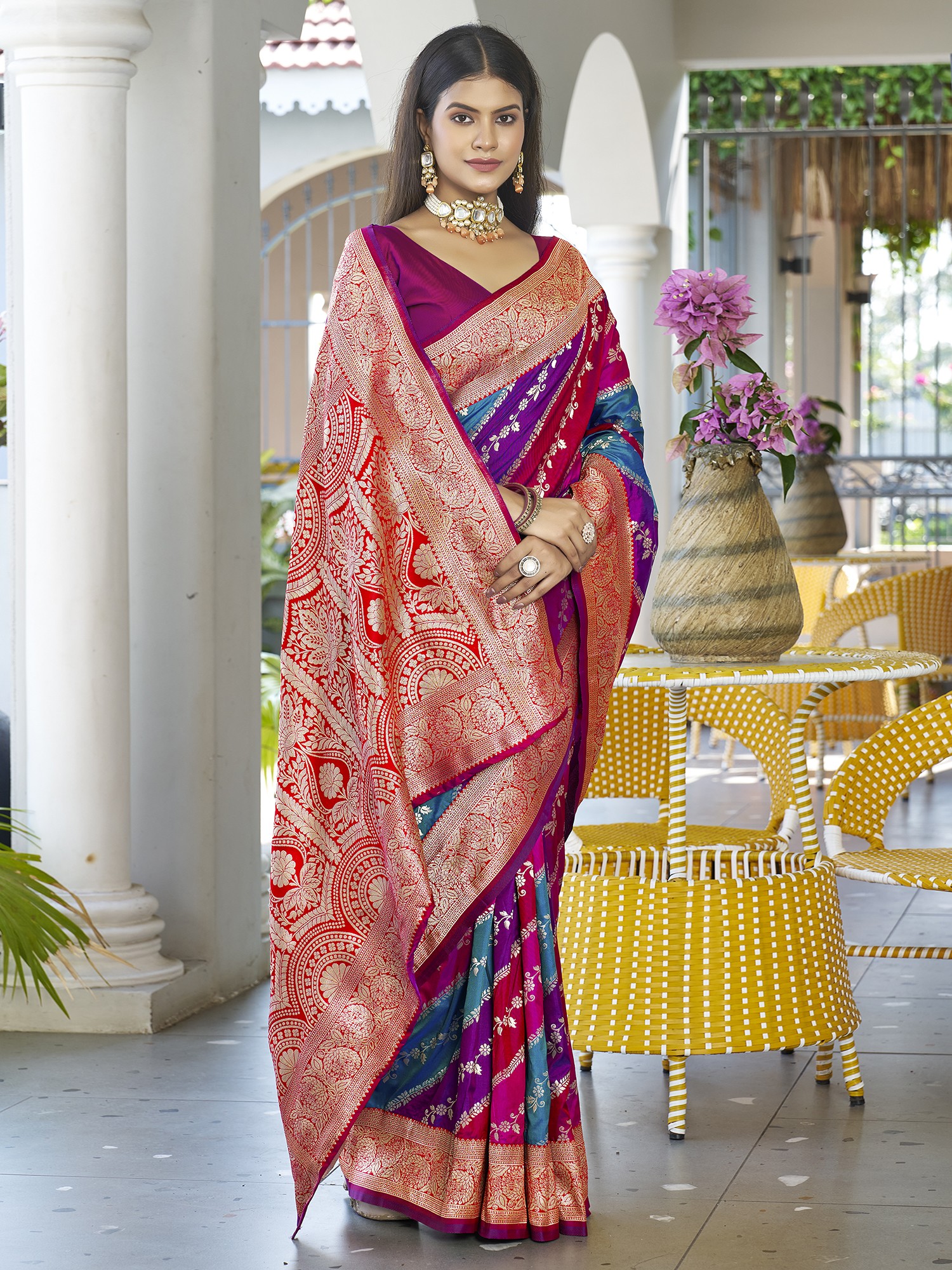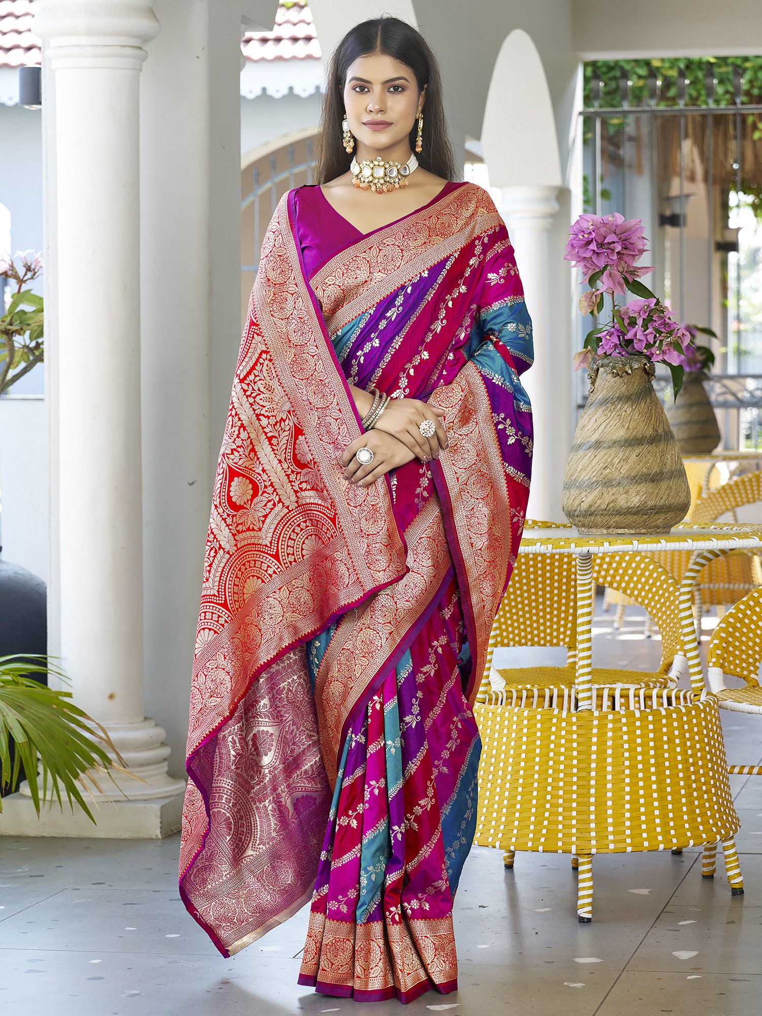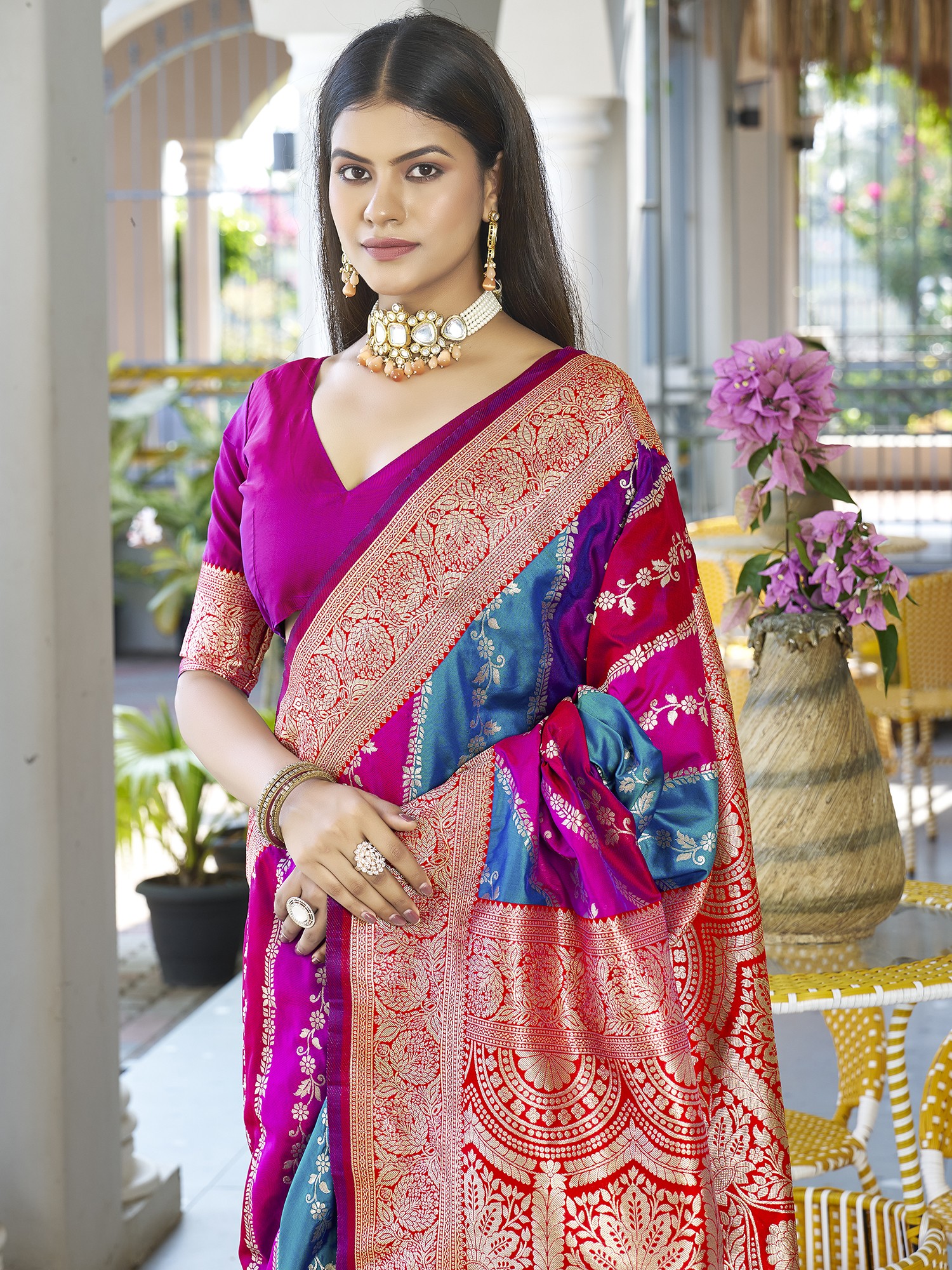 Dual Shaded Rich Banarasi Silk Saree with All Over Brocaded Floral Motif and Bail Pattern on Broad Zari Border