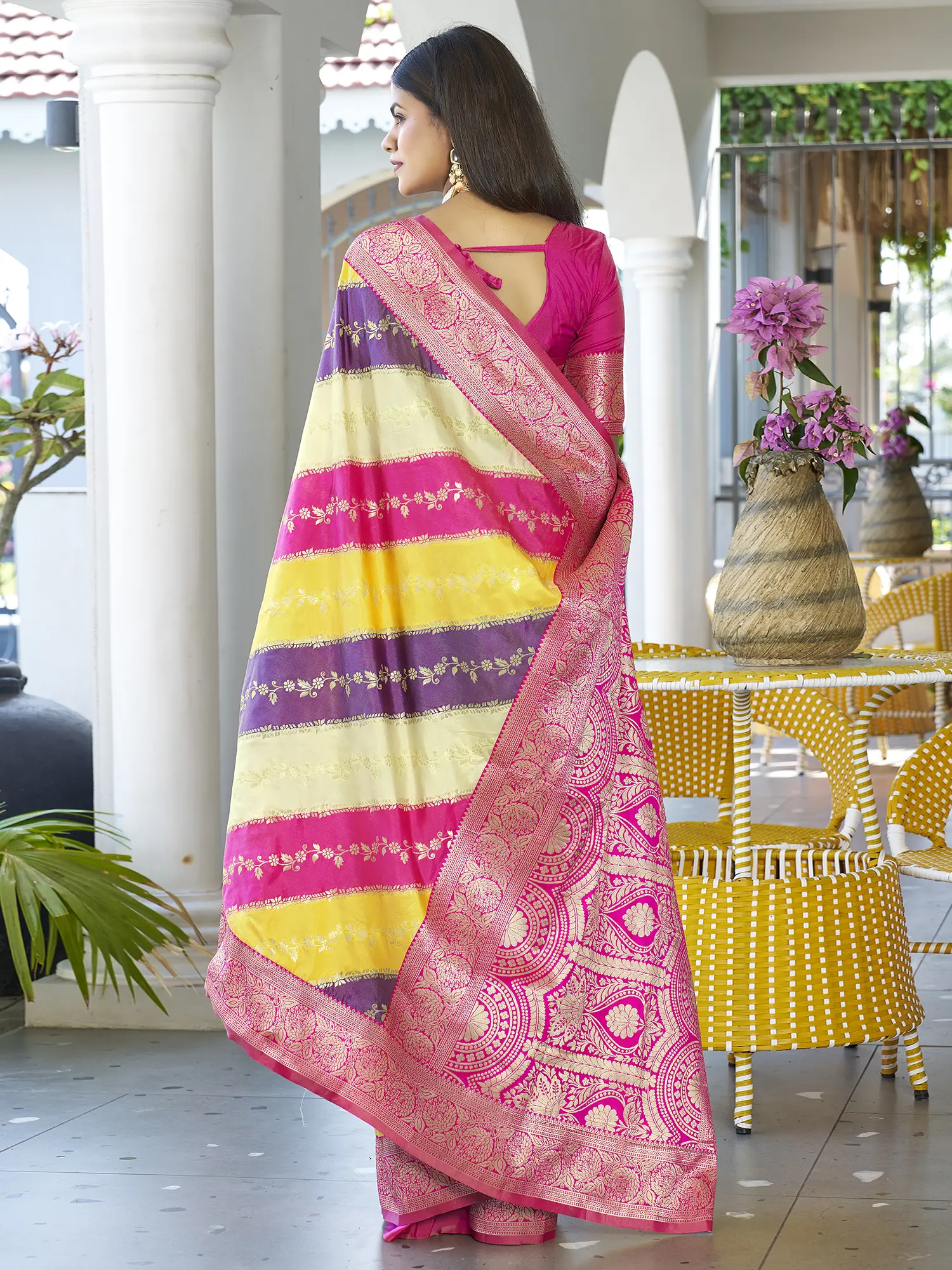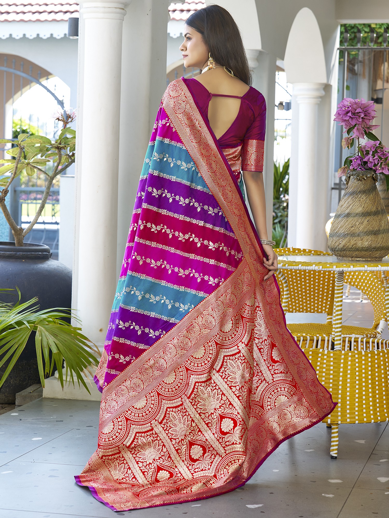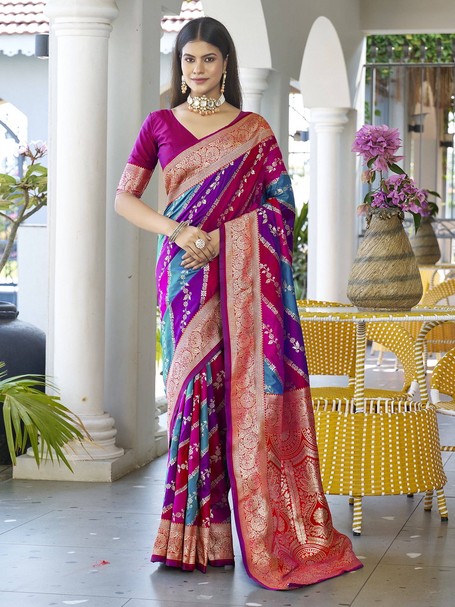 Dual Shaded Rich Banarasi Silk Saree with All Over Brocaded Floral Motif and Bail Pattern on Broad Zari Border