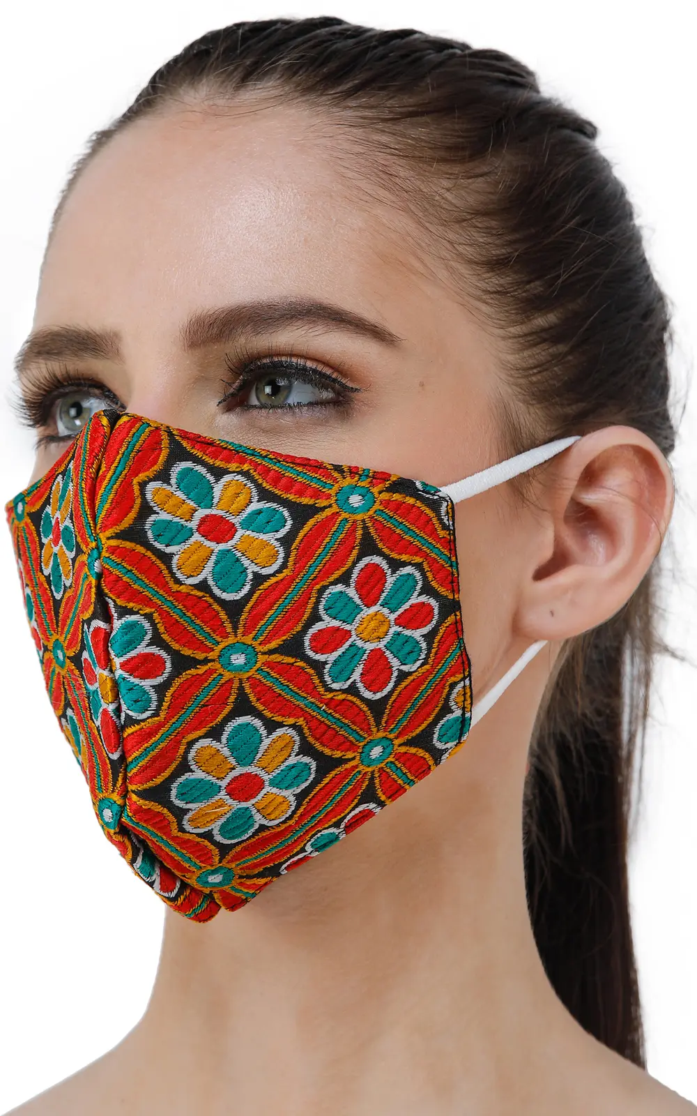 This mask is a combination of style and safety. The woven flowers on soft art silk fabric evoke the vibrant spirit of Jaipur, adding a touch of regality to your ensemble. The two-ply design, coupled with a cotton backing, ensures optimum filtration and breathability. Appreciate fashion with this mask that not only signifies cultural richness but also safeguards your well-being. Elevate your daily routine with this unique accessory, making a statement that combines tradition, comfort, and grace. Revel in the fusion of heritage and modernity as you don this enchanting mask.