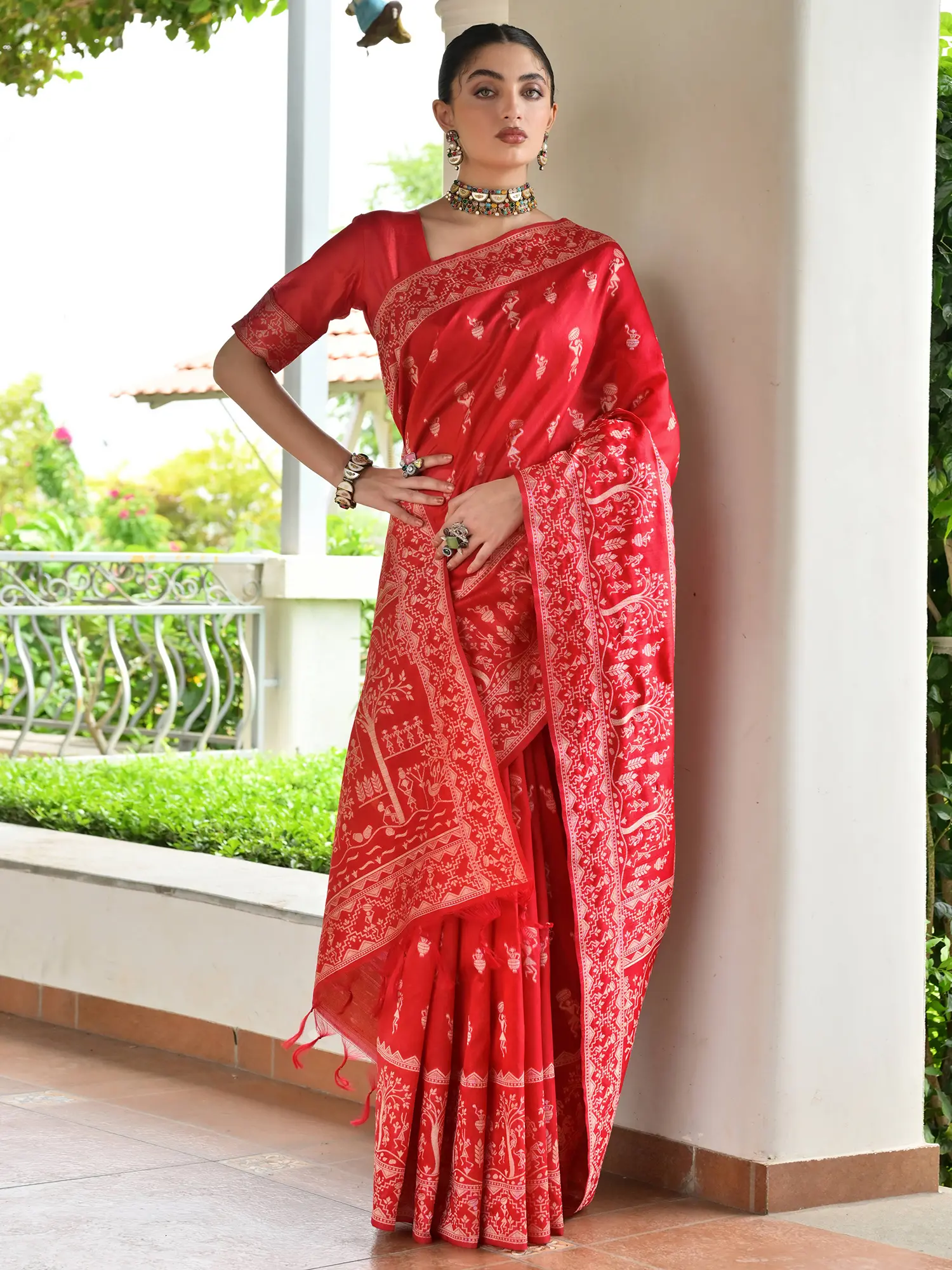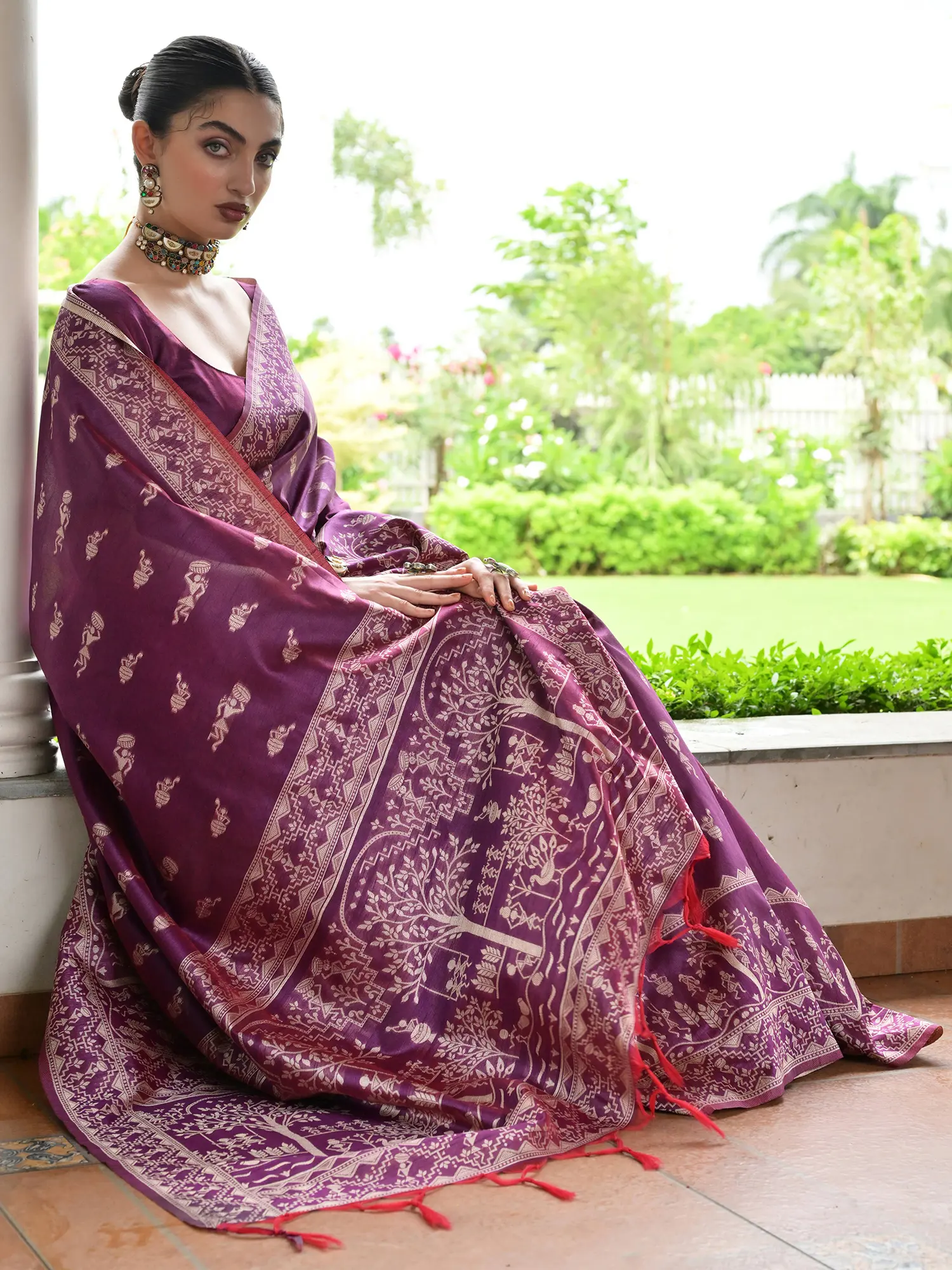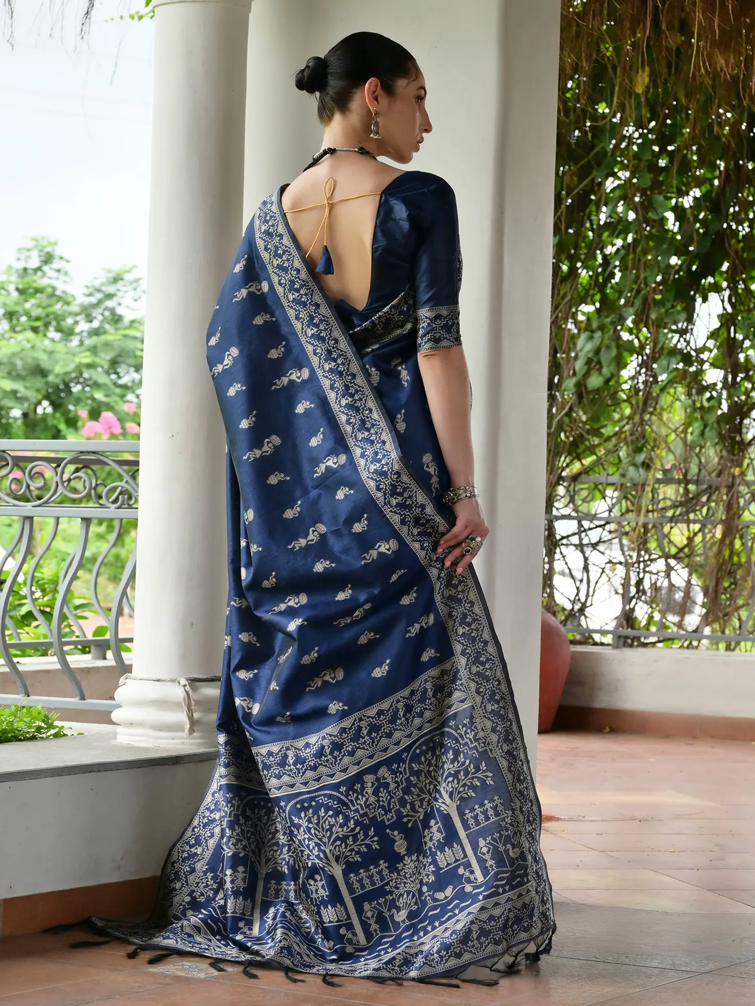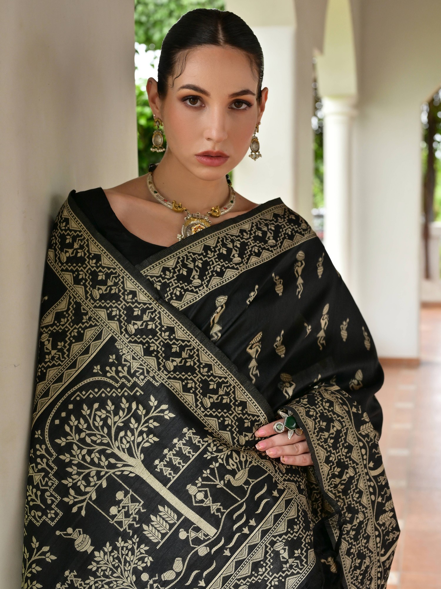 Art Silk Saree with Warli Folk Figures Printed Border and Pallu