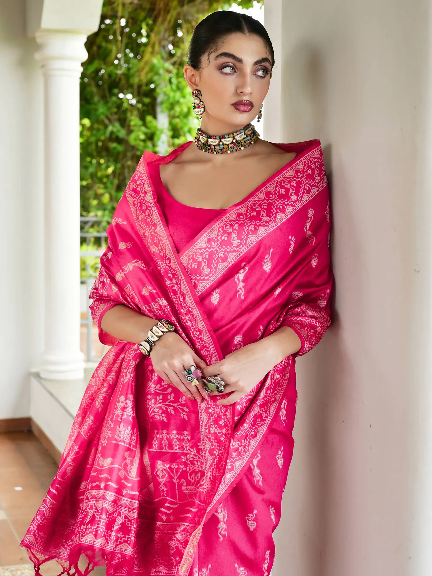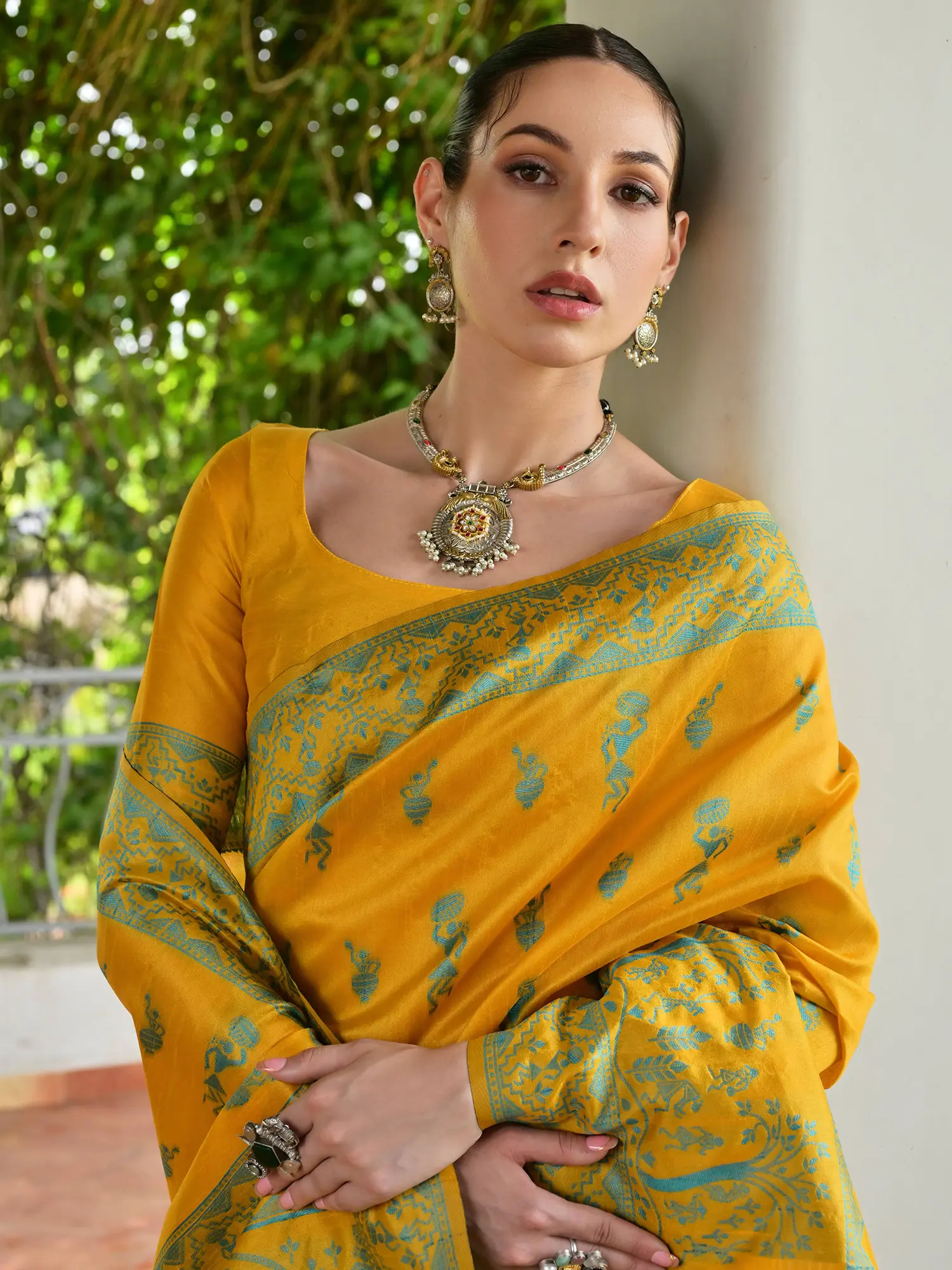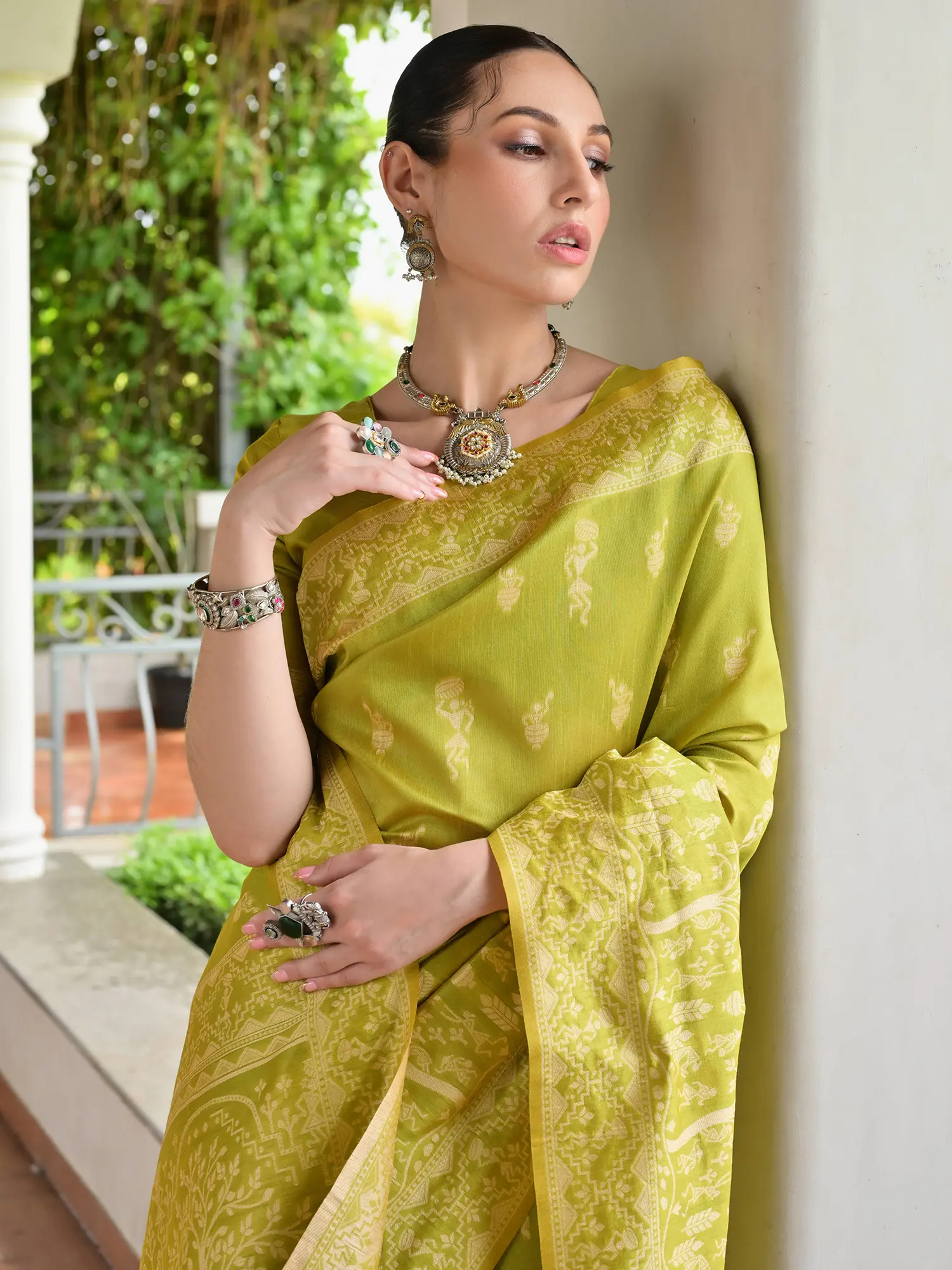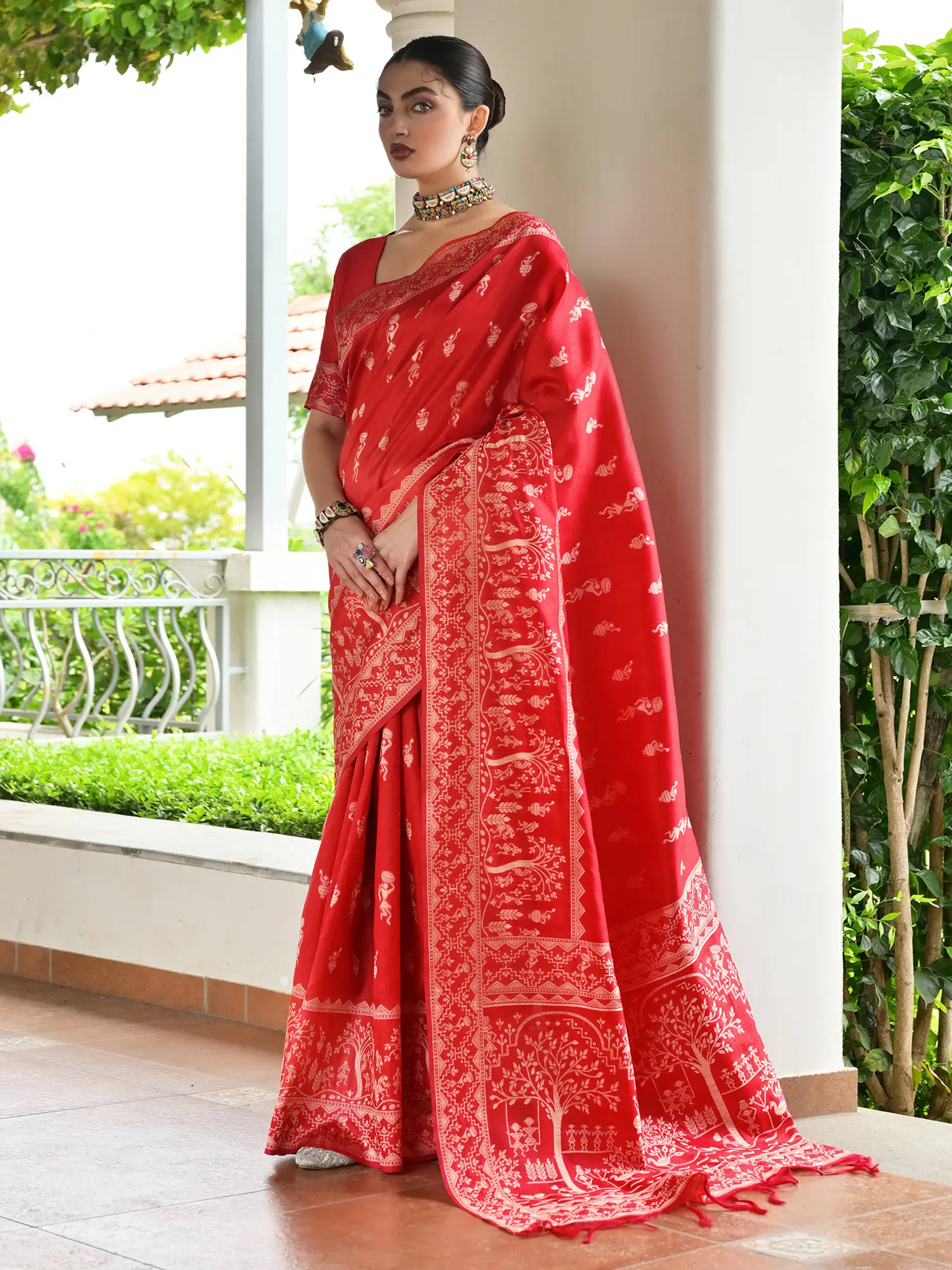 Art Silk Saree with Warli Folk Figures Printed Border and Pallu