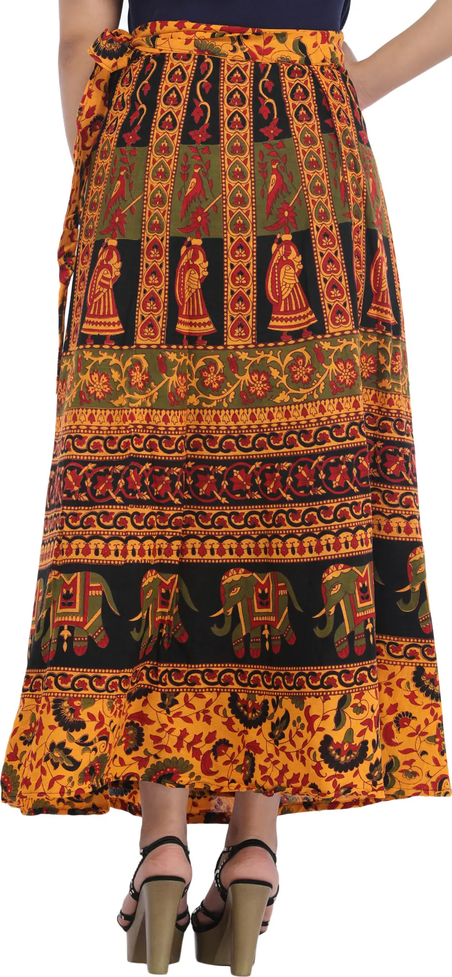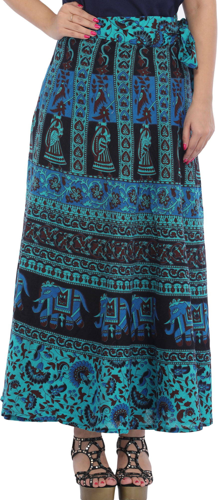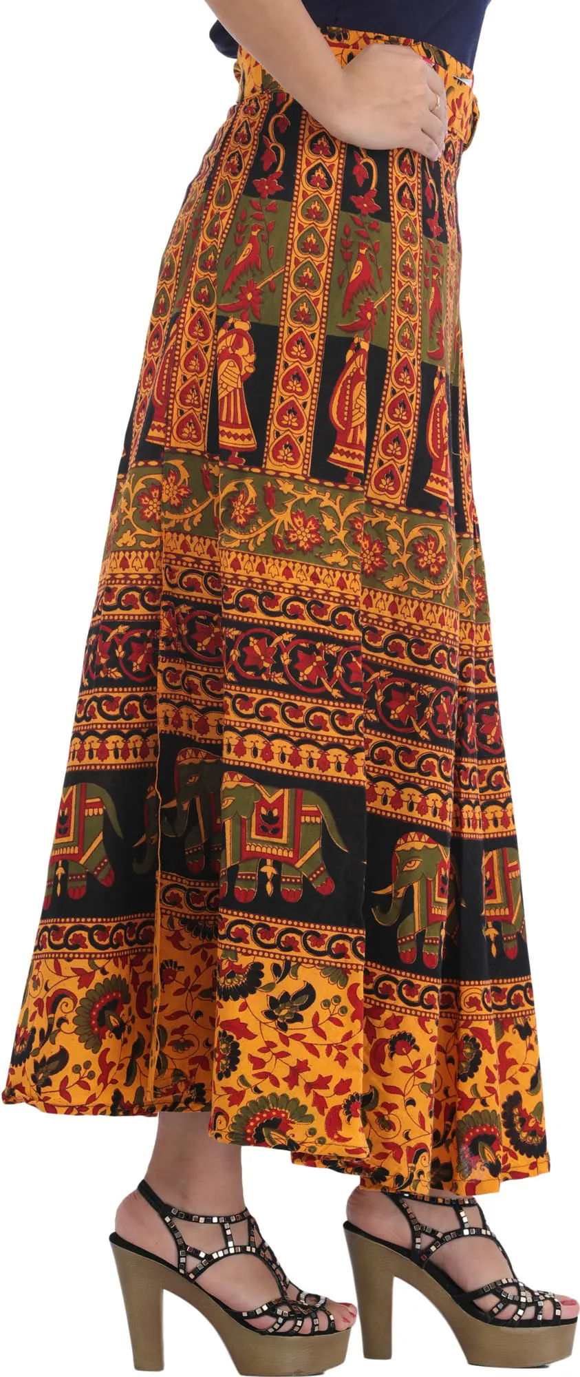 Each motif whispers tales of heritage and blessings, intertwining tradition with contemporary grace. Made from pure cotton and adorned with auspicious motifs, this long skirt drapes you in comfort while exuding eternal charm. Symbolizing prosperity, love, and harmony, this skirt is a canvas of cultural richness. Enrich your wardrobe with this art-piece, a conduit to auspicious vibes.