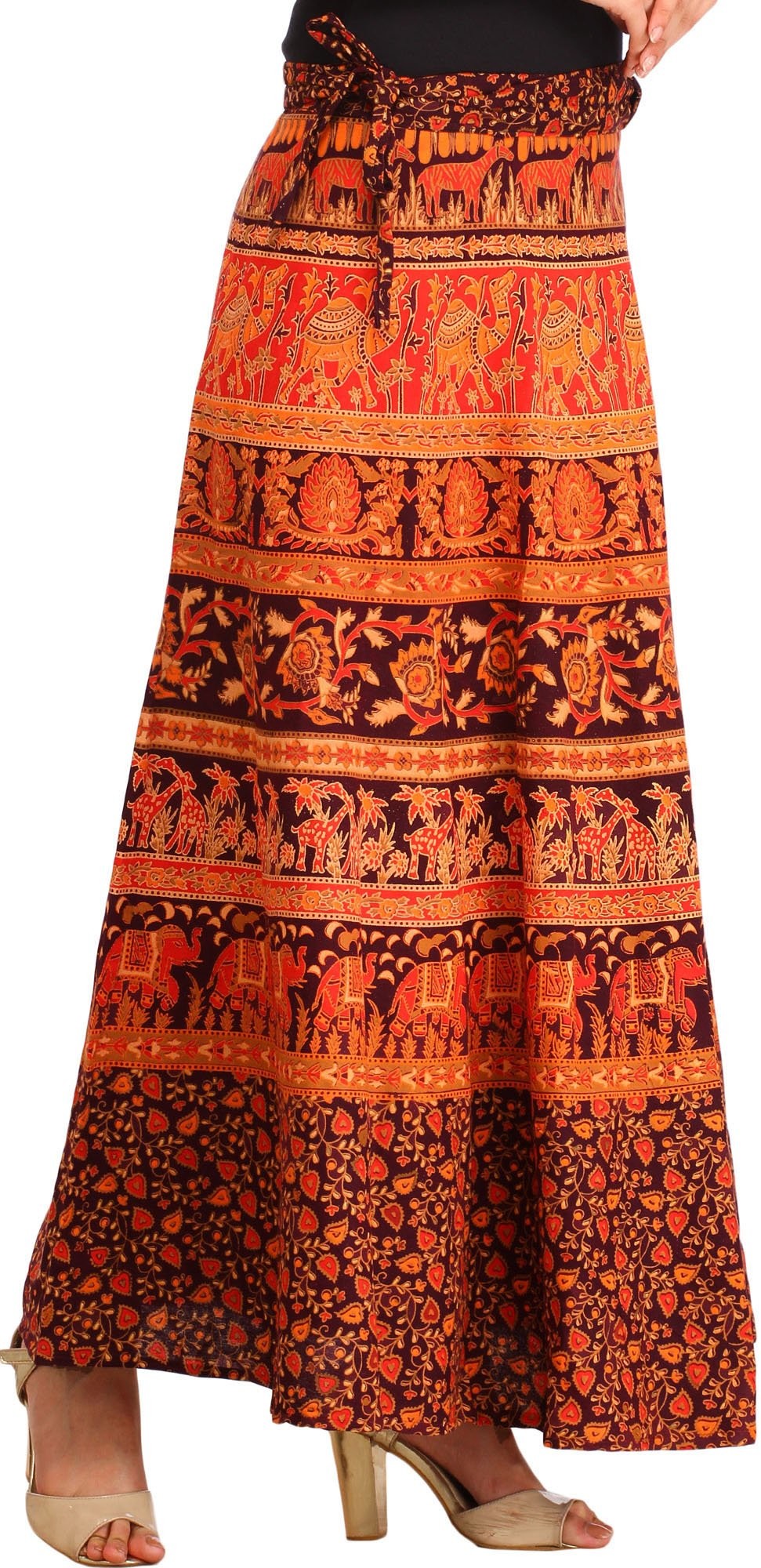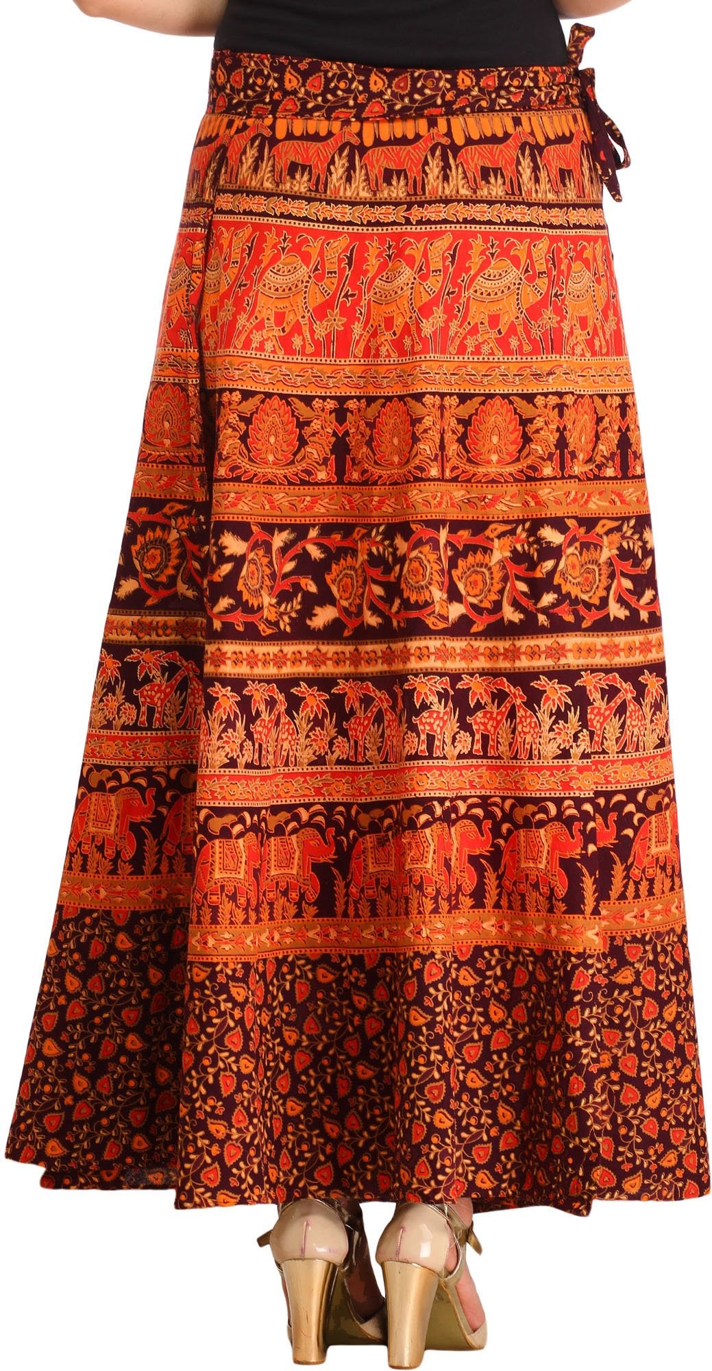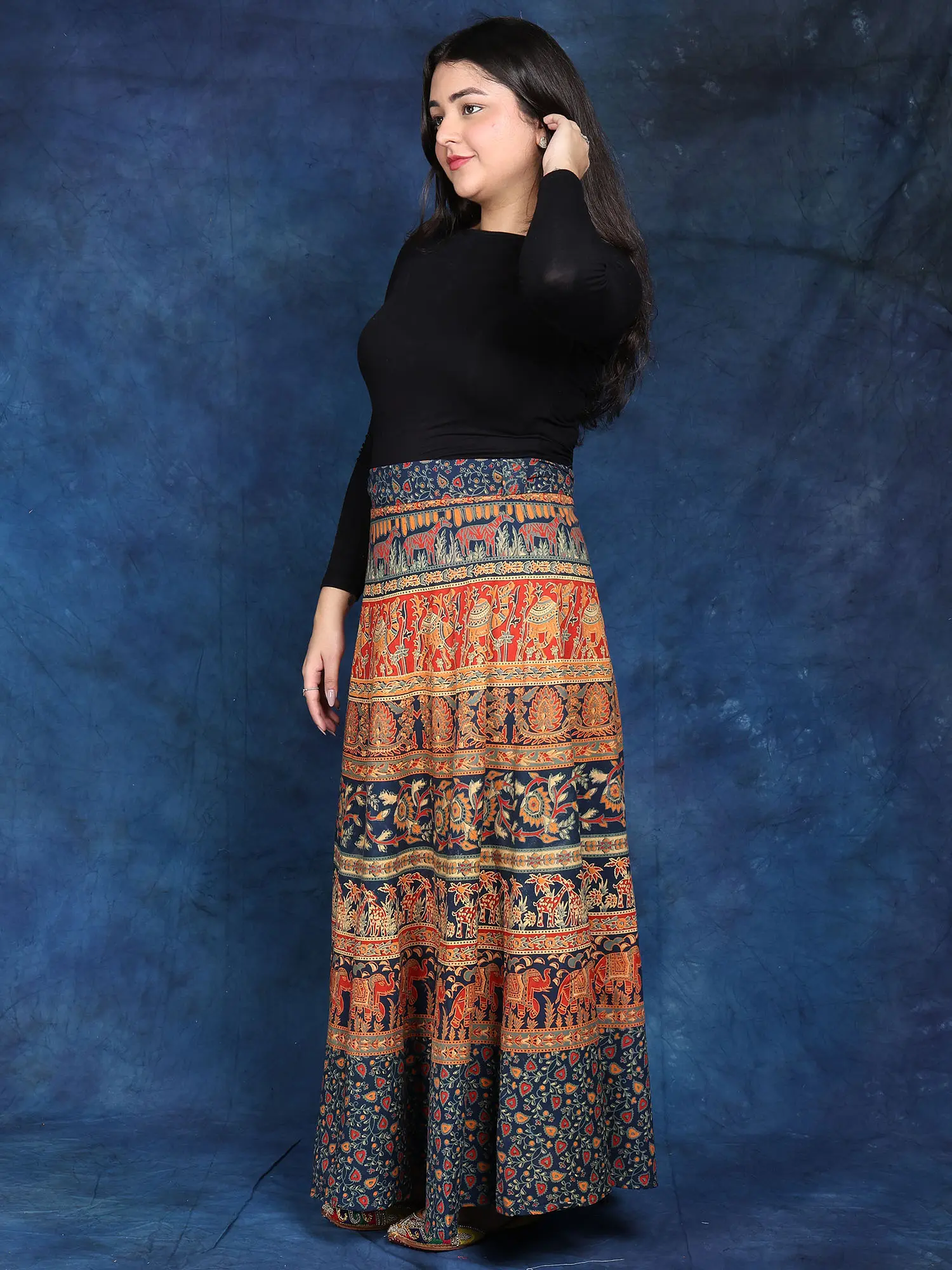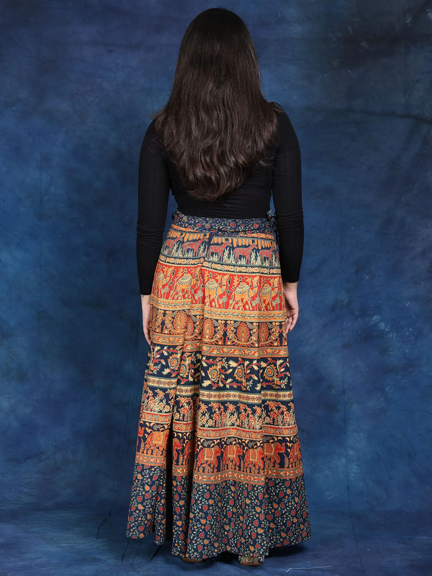 Crafted in Pilkhuwa, this “Wrap-Around Long Skirt” will wow you with its wild beauty. This skirt, made of 100% cotton, elegantly mixes blossoms and animal prints to create a stunning tapestry of nature's marvels. It is versatile and comfortable, making it an excellent addition to your everyday wardrobe.