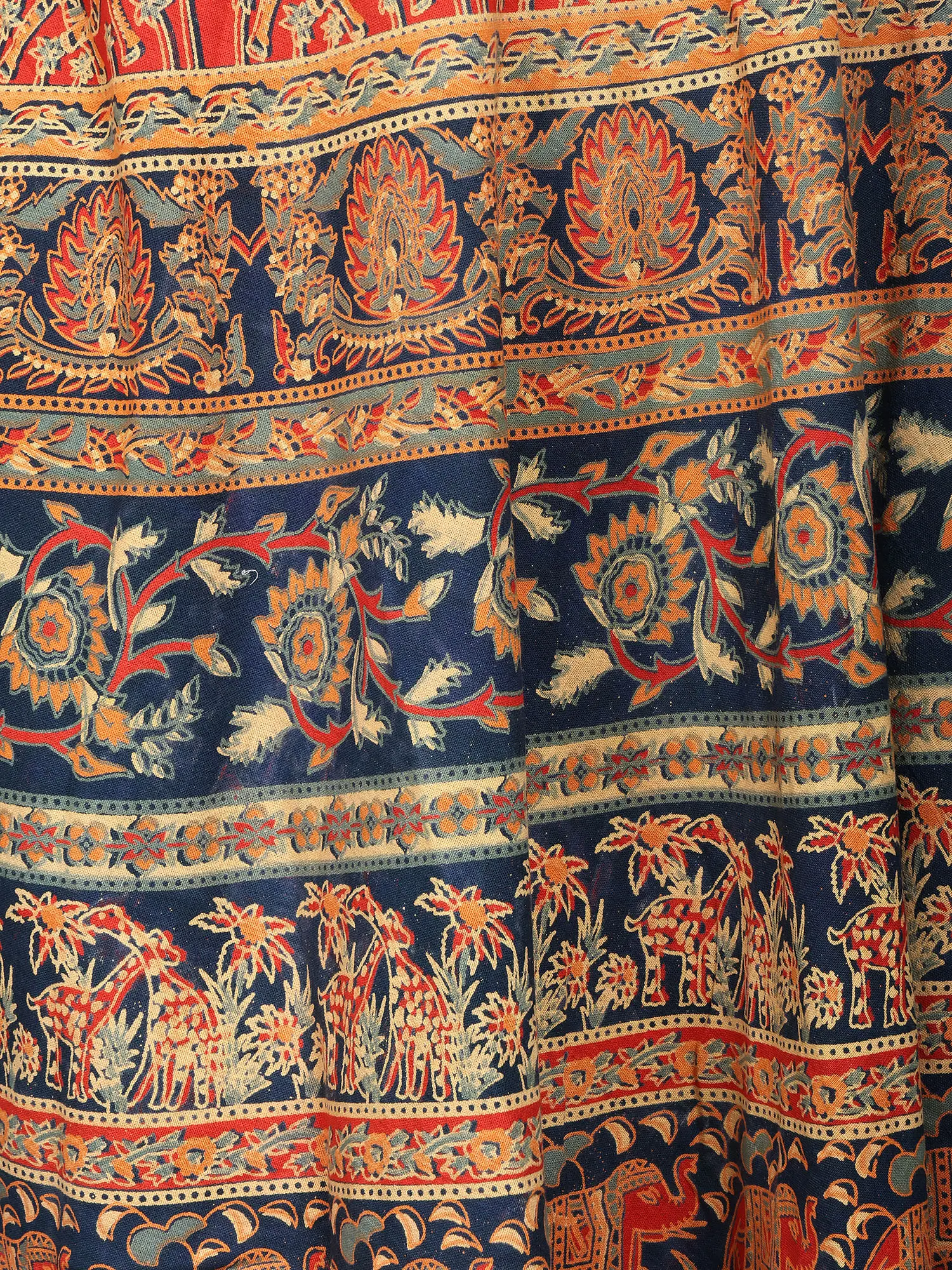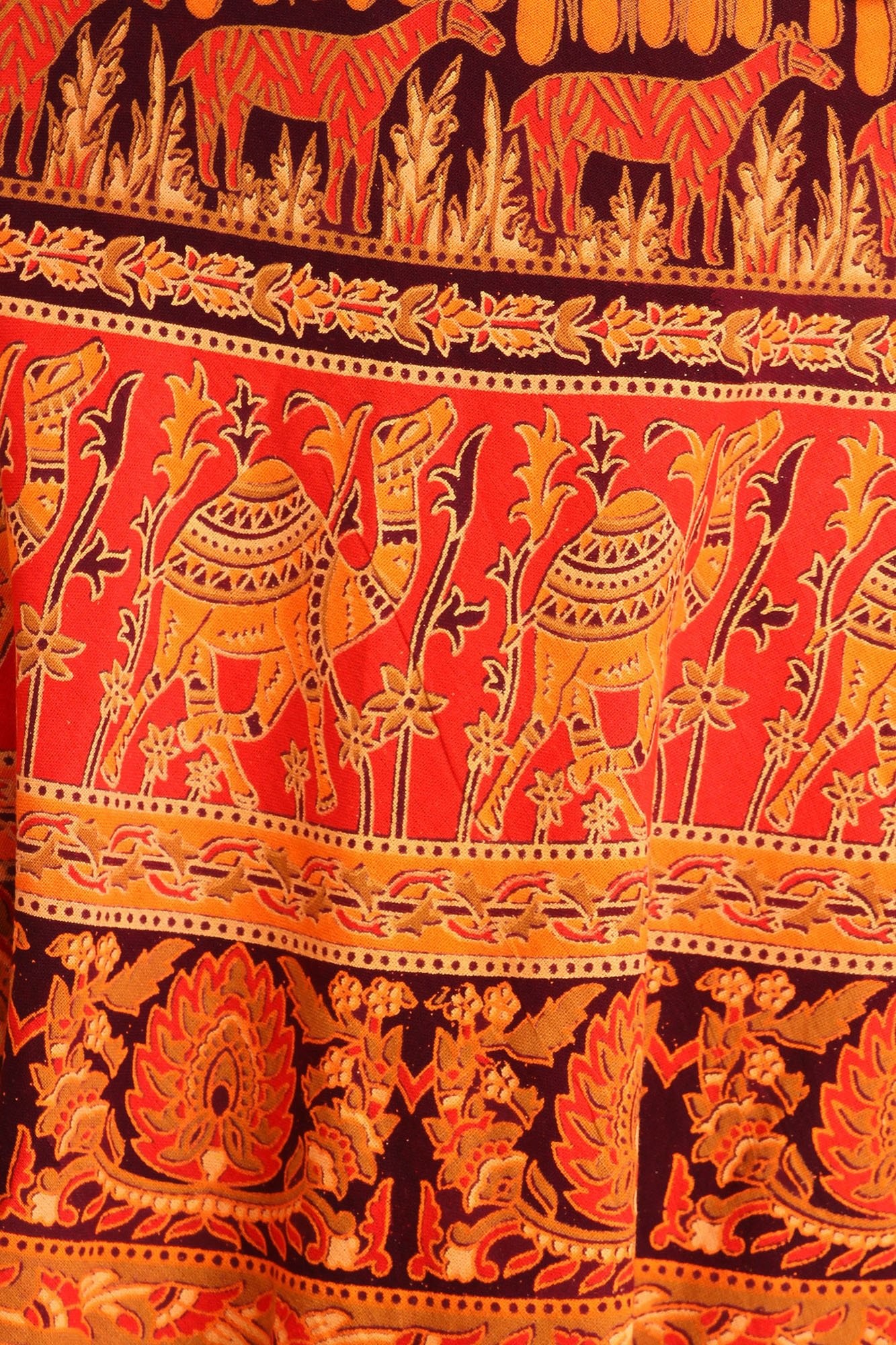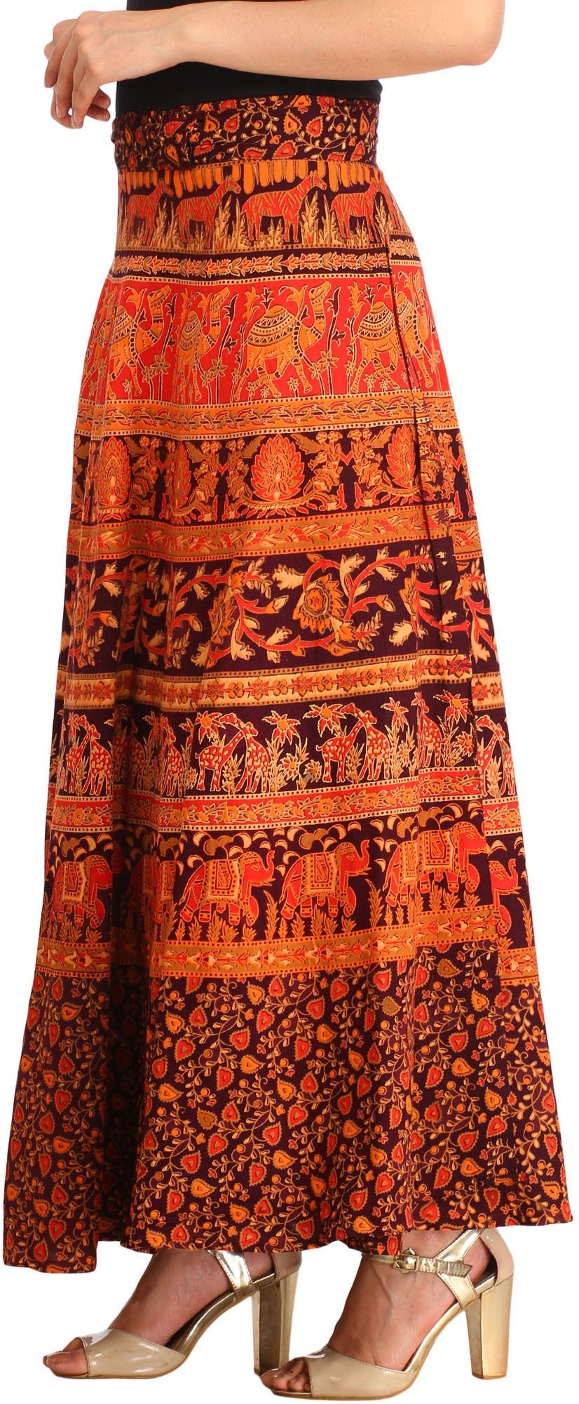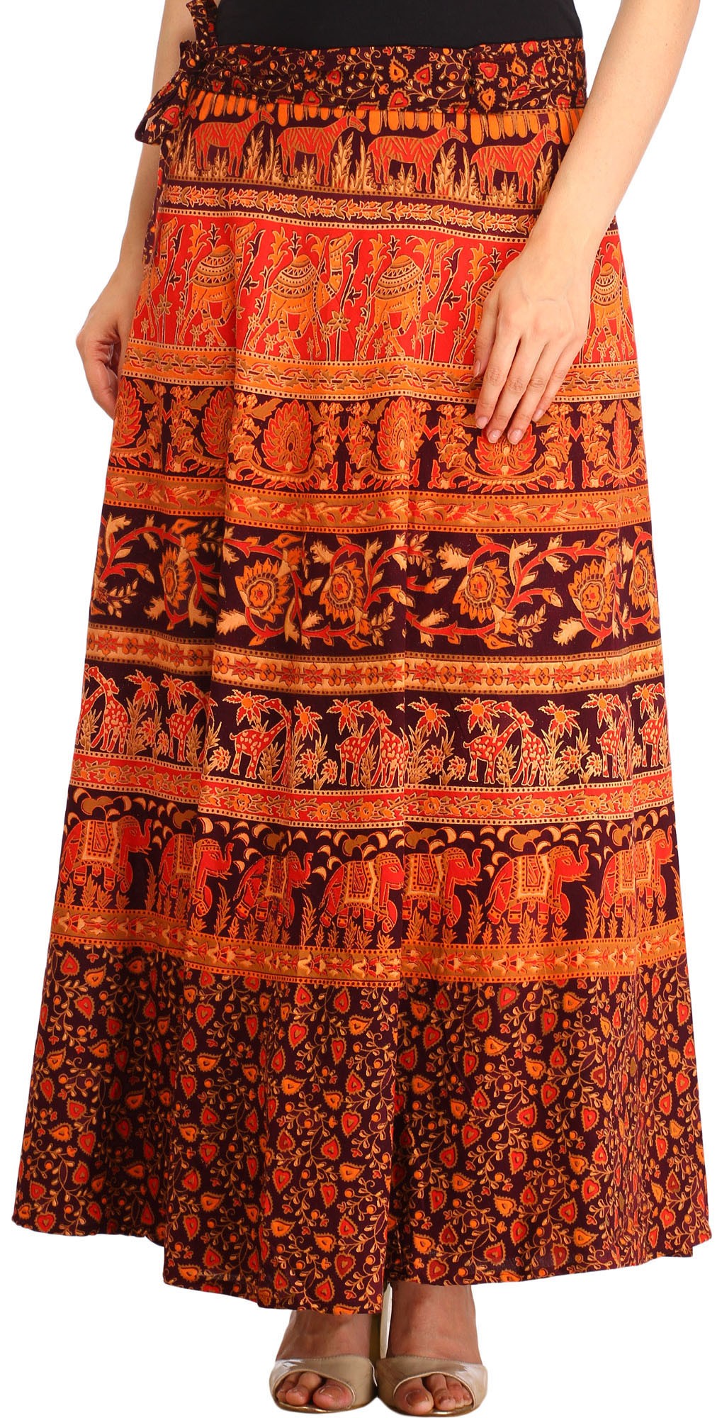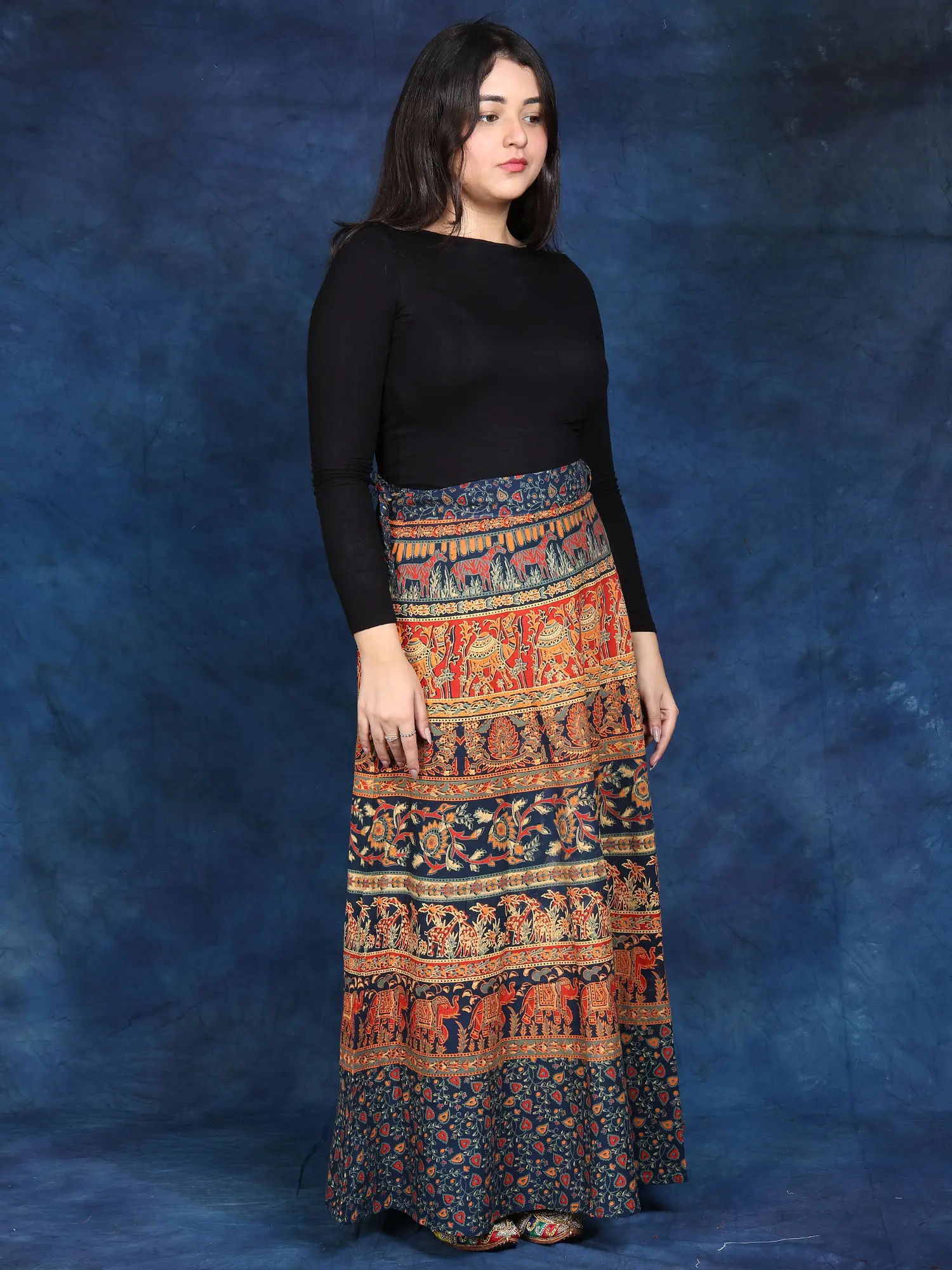 Crafted in Pilkhuwa, this “Wrap-Around Long Skirt” will wow you with its wild beauty. This skirt, made of 100% cotton, elegantly mixes blossoms and animal prints to create a stunning tapestry of nature's marvels. It is versatile and comfortable, making it an excellent addition to your everyday wardrobe.