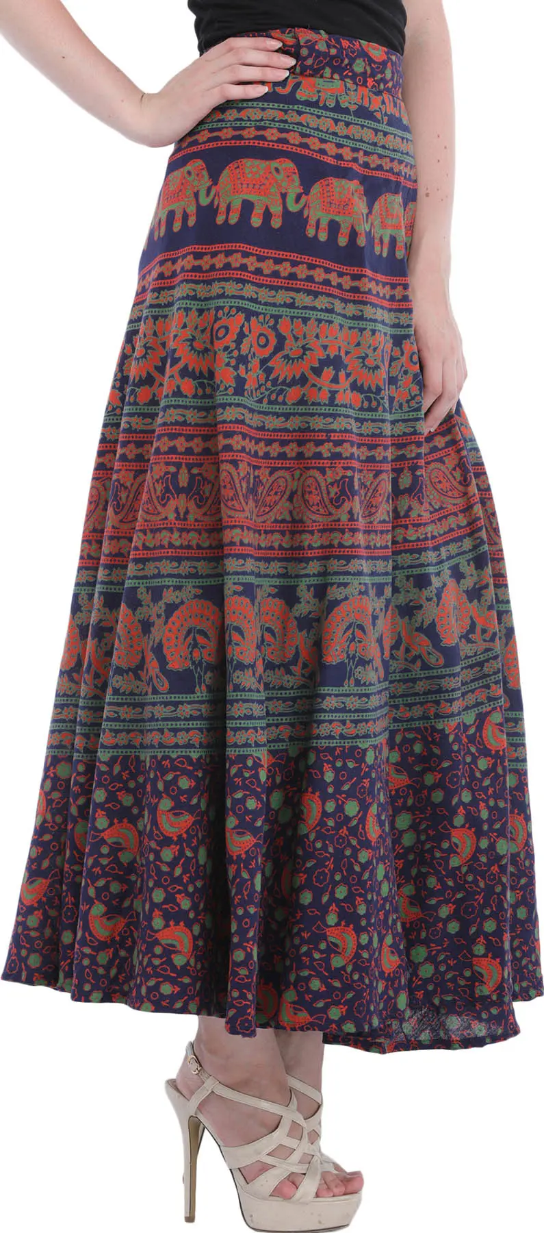 A tapestry of deep and rich colors, covered in ethnic patterns, each of which carries the story of India’s cultural beauty in it, this wrap-around long skirt from Pilkhuwa is a chic and elegant way to amplify your casual attire. The cotton long skirt is beautified with eye-catching motifs of birds, flowers, vegetation, and traditional symbols that represent beauty, fortune, royalty, and liveliness, making this skirt a stylish and hassle-free way to feel fashionable.