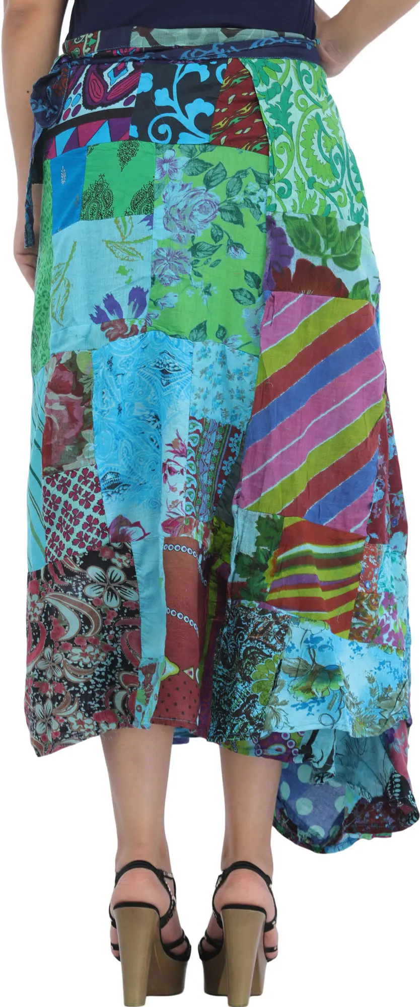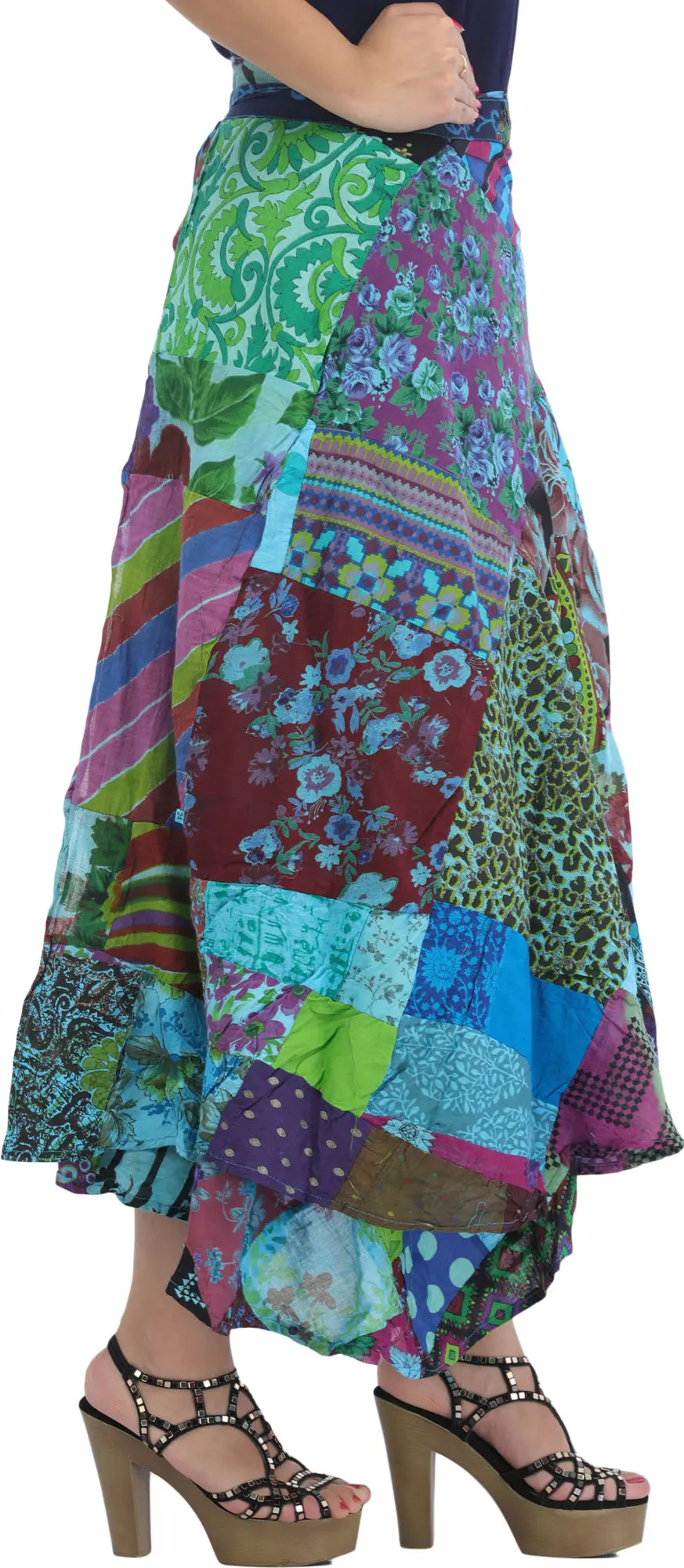 Printed Long Boho Wrap-On Long Skirt from Gujarat with Patch Work