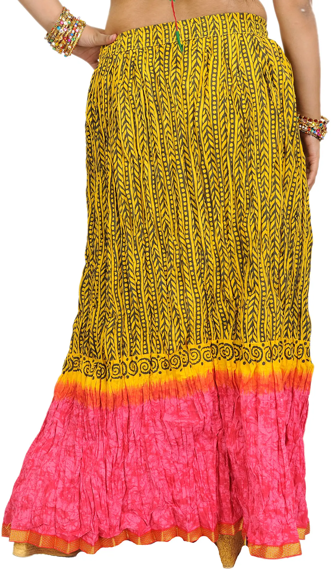 Dusky-Green Crinkled Long Skirt with Block-Printed Flowers and Patch Border