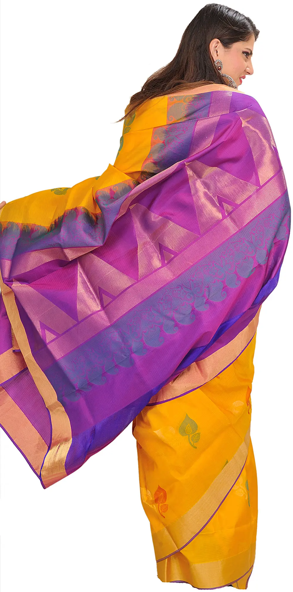 Yellow and Purple Pure Silk Sari from Banaras with Woven Leaves