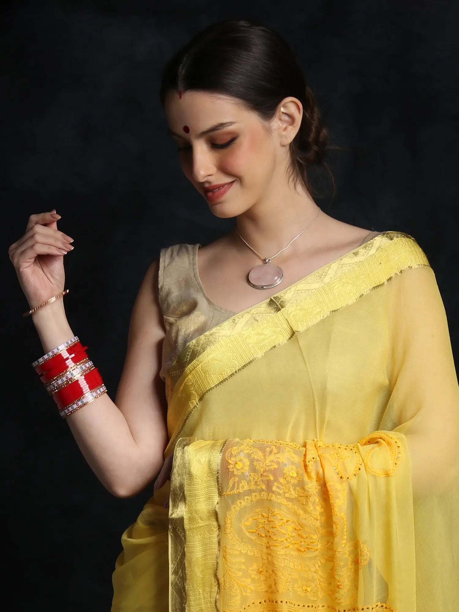 Walk with an air of elegance in this yellowtail chiffon embroidered saree, covered in enchanting details of paiselys, vegetation, and ethnic patterns in matching threads, that give the delicate fabric a rich texture. A yellow-golden blend on the border adds an element of luxury to the drape, crafting it for all your casual and festive looks.