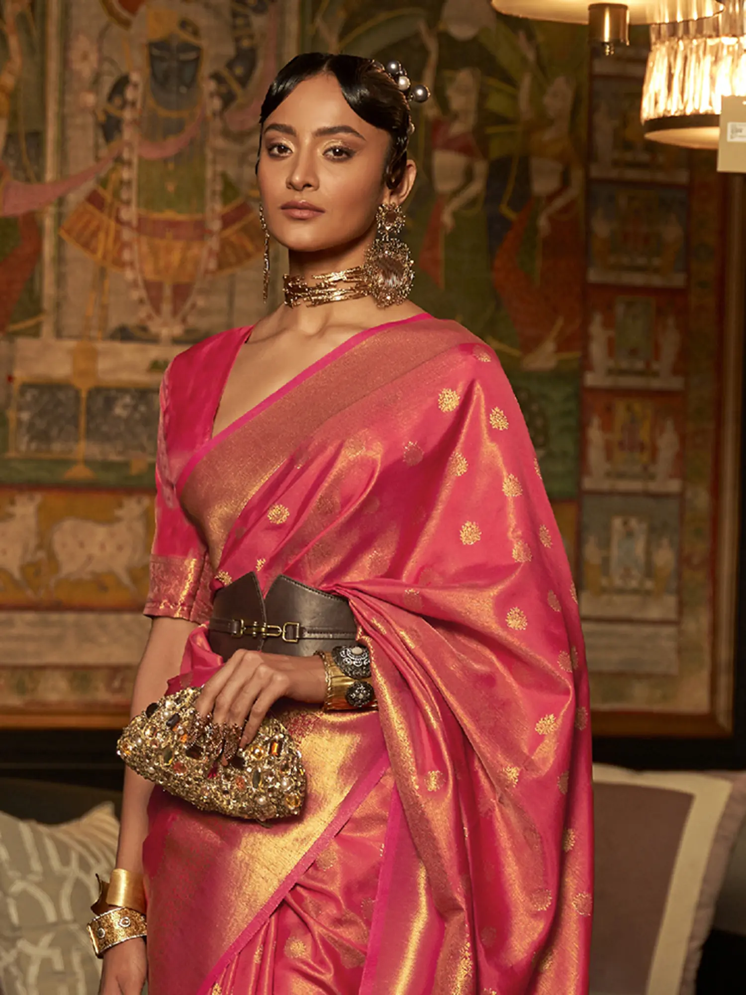 Indulge in the timeless beauty of our Zari Base Handloom Weaving Silk Designer Saree. This exquisite piece is a testament to the artistry of traditional Indian weaving, seamlessly blending heritage and modern sophistication. The rich, vibrant pink hue is accentuated by intricate zari work, creating a captivating interplay of light and shadow. The saree drapes effortlessly, enhancing your natural grace and poise. The pallu, adorned with delicate tassels, adds a touch of playful charm that completes the look. This saree isn't just an outfit; it’s a statement, a reflection of your refined taste and appreciation for exquisite craftsmanship.