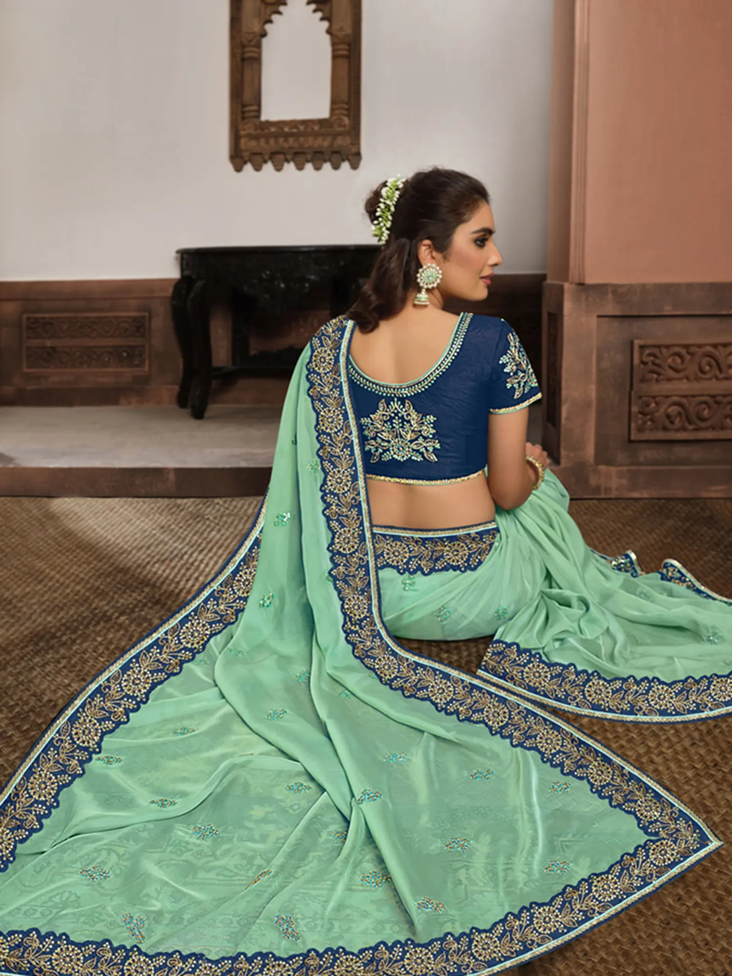 To ensure the perfect fit, this saree comes with a blouse piece that can be tailor-made to your exact measurements. This guarantees a comfortable and flattering silhouette that accentuates your figure. The deep teal blue of the blouse piece perfectly complements the seafoam green of the saree, adding a touch of unexpected contrast and visual interest. The blouse piece also features the same exquisite zari embroidery, adding consistency and cohesiveness to the overall design. No need to worry about alterations – simply provide your measurements for a perfectly personalized fit.