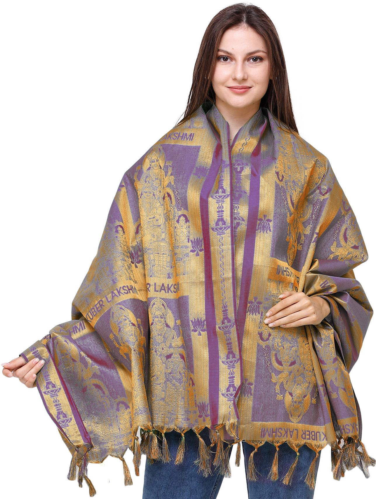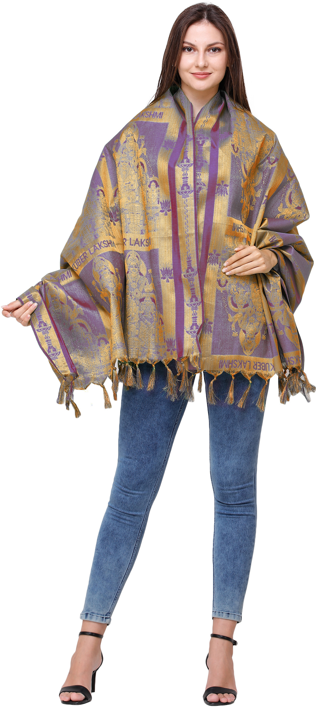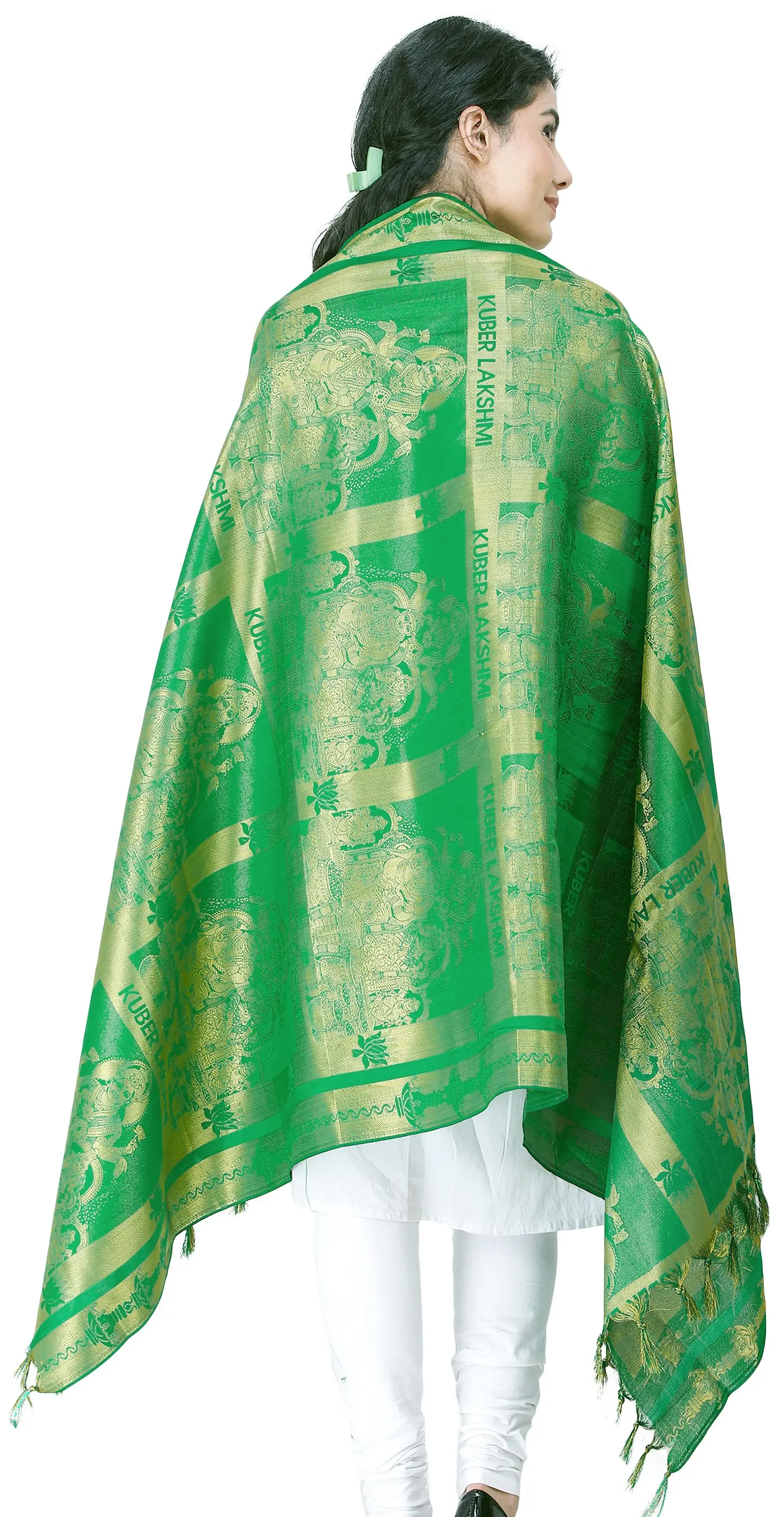 This spectacular creation, a prayer shawl, will envelop you in heavenly splendour. This gorgeous shawl, made from opulent art silk, is a holy woven fabric full of benefits. Richly decorated with elaborate representations of Goddess Lakshmi, it bestows wealth and prosperity, while Lord Kuber’s presence guarantees financial security.