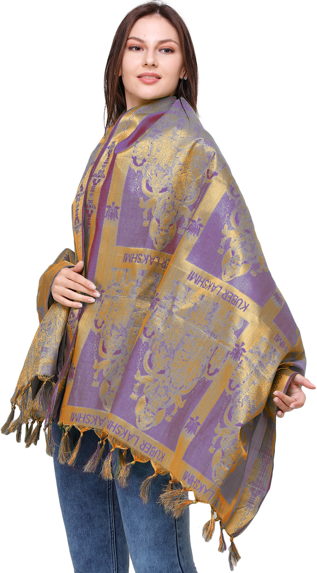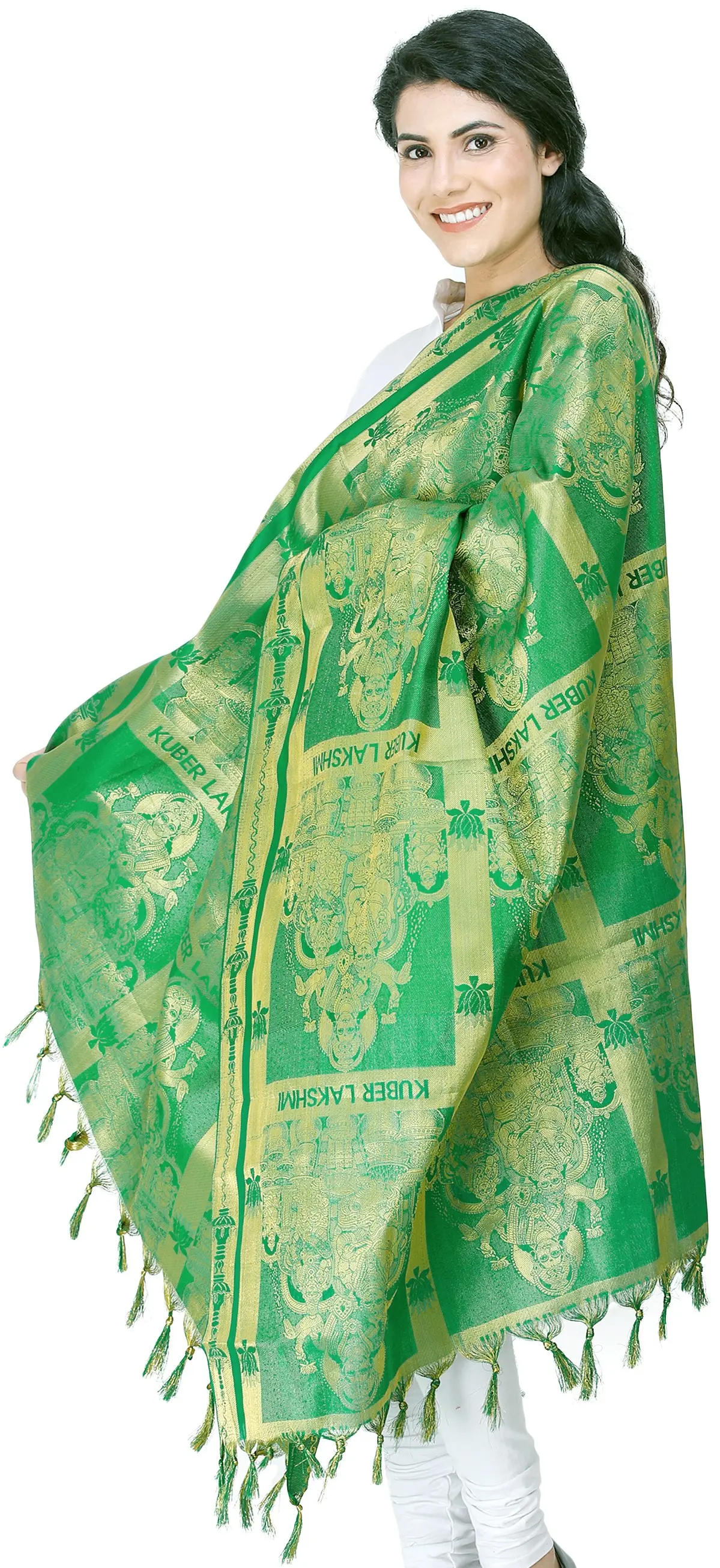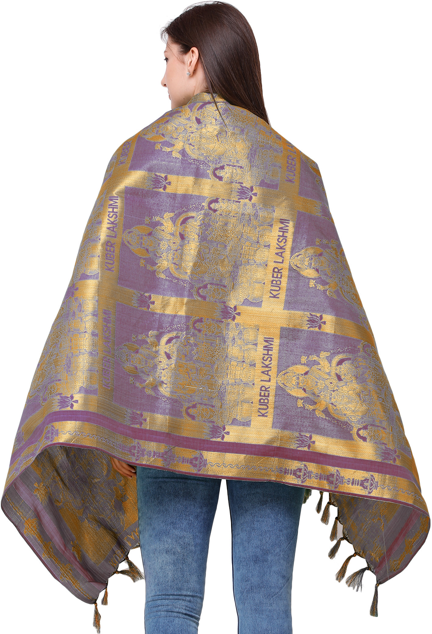 This spectacular creation, a prayer shawl, will envelop you in heavenly splendour. This gorgeous shawl, made from opulent art silk, is a holy woven fabric full of benefits. Richly decorated with elaborate representations of Goddess Lakshmi, it bestows wealth and prosperity, while Lord Kuber’s presence guarantees financial security.